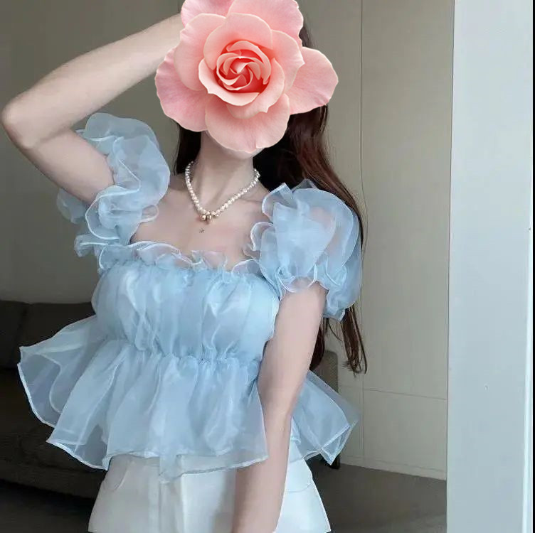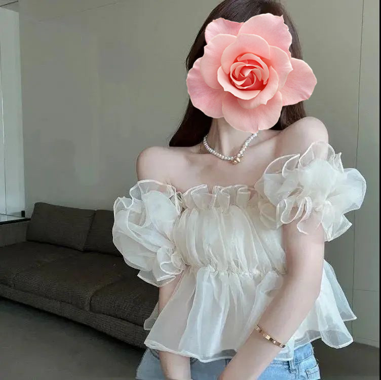 여성용 어깨 쉬폰 셔츠 여름 뜨거운 소녀 슬리밍 디자인 니치 프렌치 퍼프 슬리브 스위트 쇼트 탑