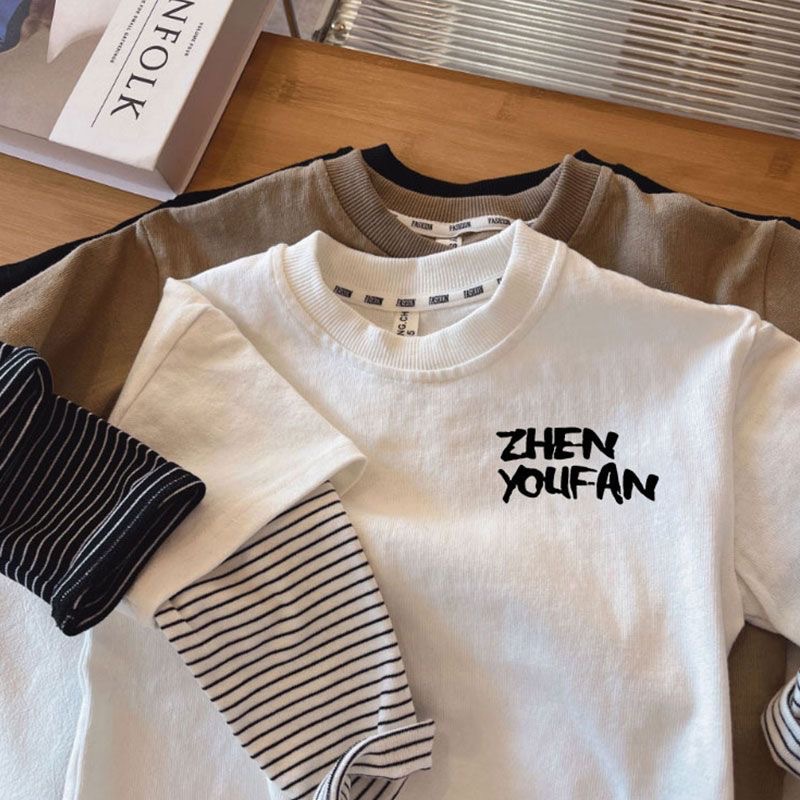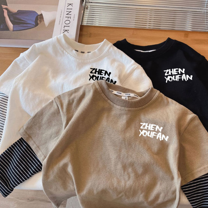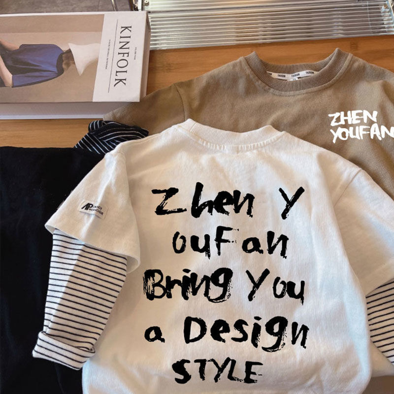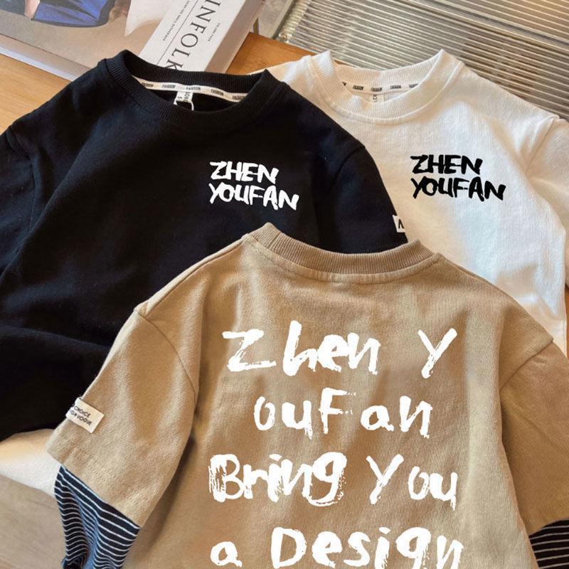 한국 아동복 소년 긴팔 티셔츠 봄 · 가을 튀긴 거리 디자인 센스 페이크 투피스 탑 어린이 둥근 목베이스 셔츠