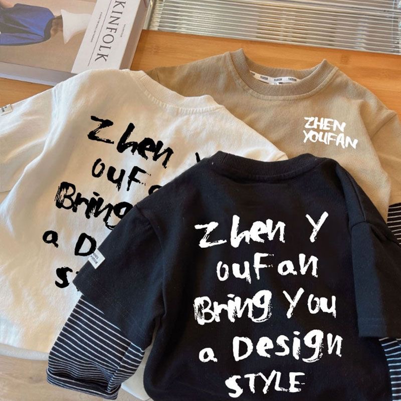 한국 아동복 소년 긴팔 티셔츠 봄 · 가을 튀긴 거리 디자인 센스 페이크 투피스 탑 어린이 둥근 목베이스 셔츠스토어 가기