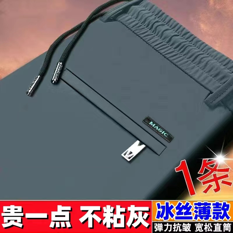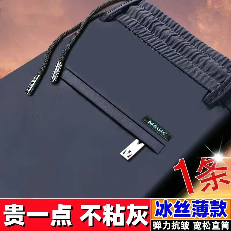 중년 남성 봄과 가을 아이스 실크 느슨한 캐주얼 바지 비 다림질 안티 주름 높은 탄성 플러스 사이즈 얇은 스포츠 바지