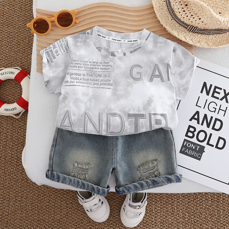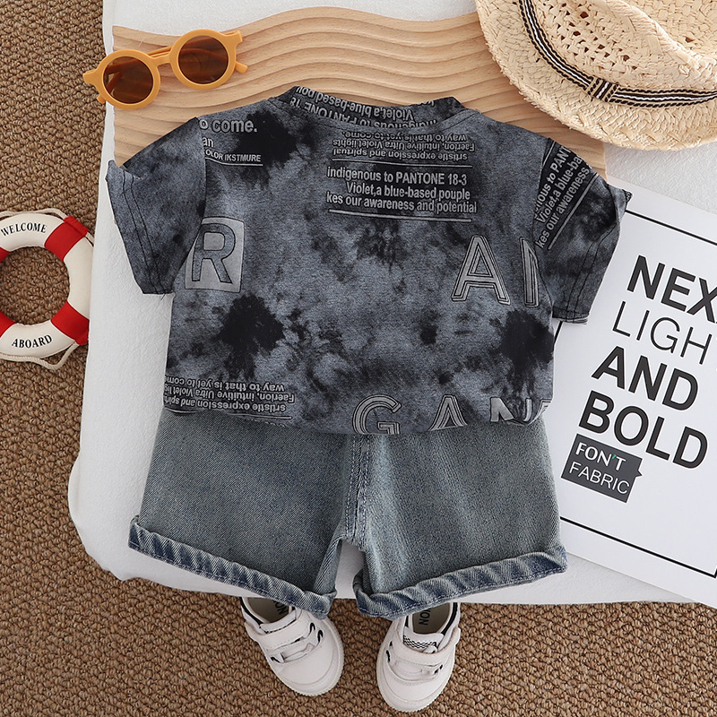 2025 여름 새로운 1-5 세 소년 거품 영어 반팔 반바지 세트 캐주얼 투피스 유행 티셔츠스토어 가기