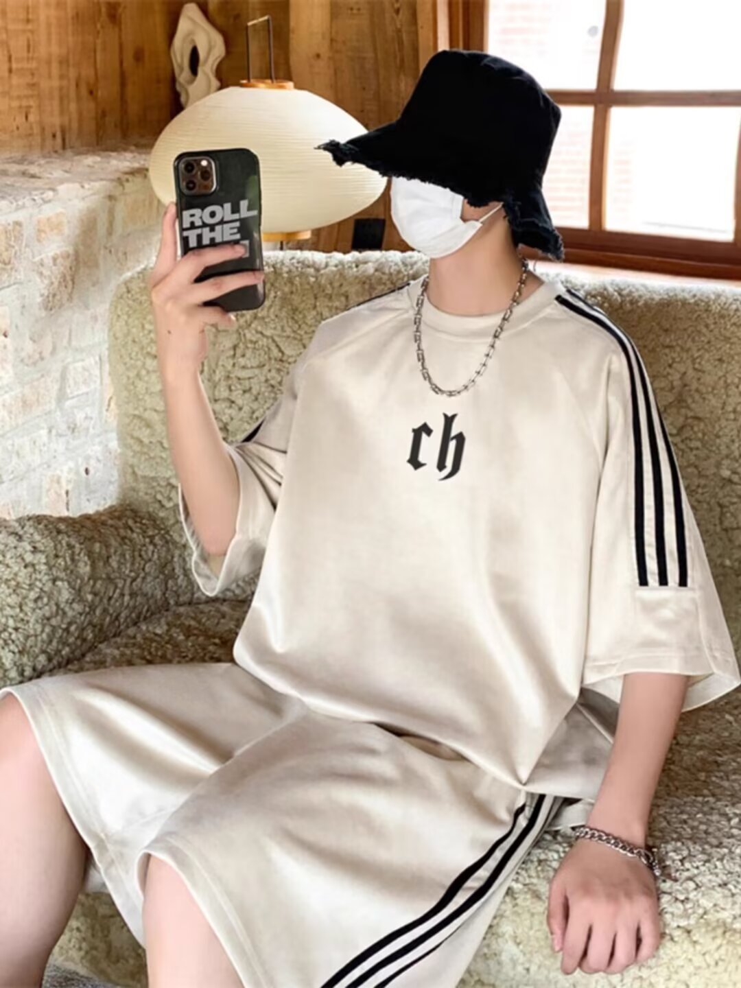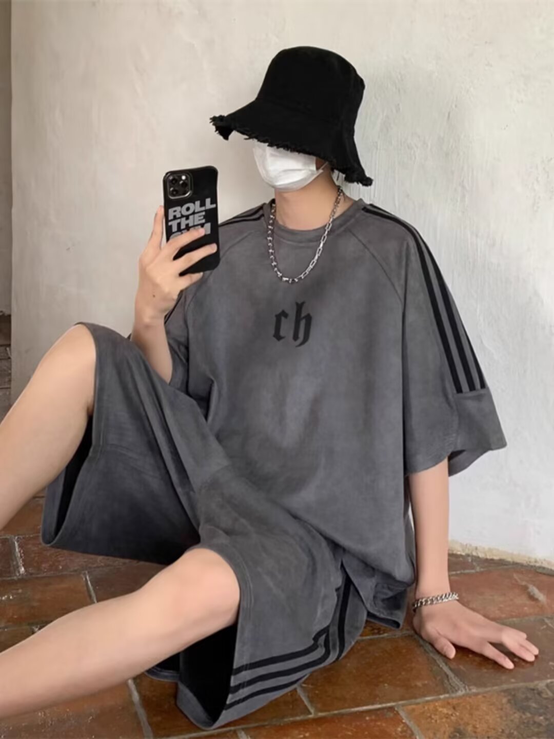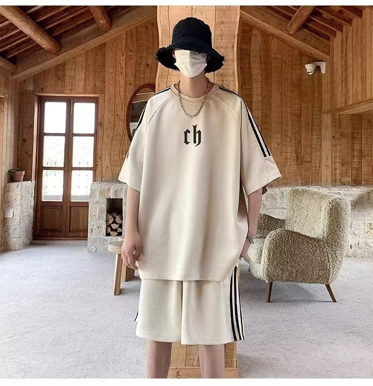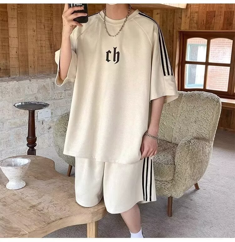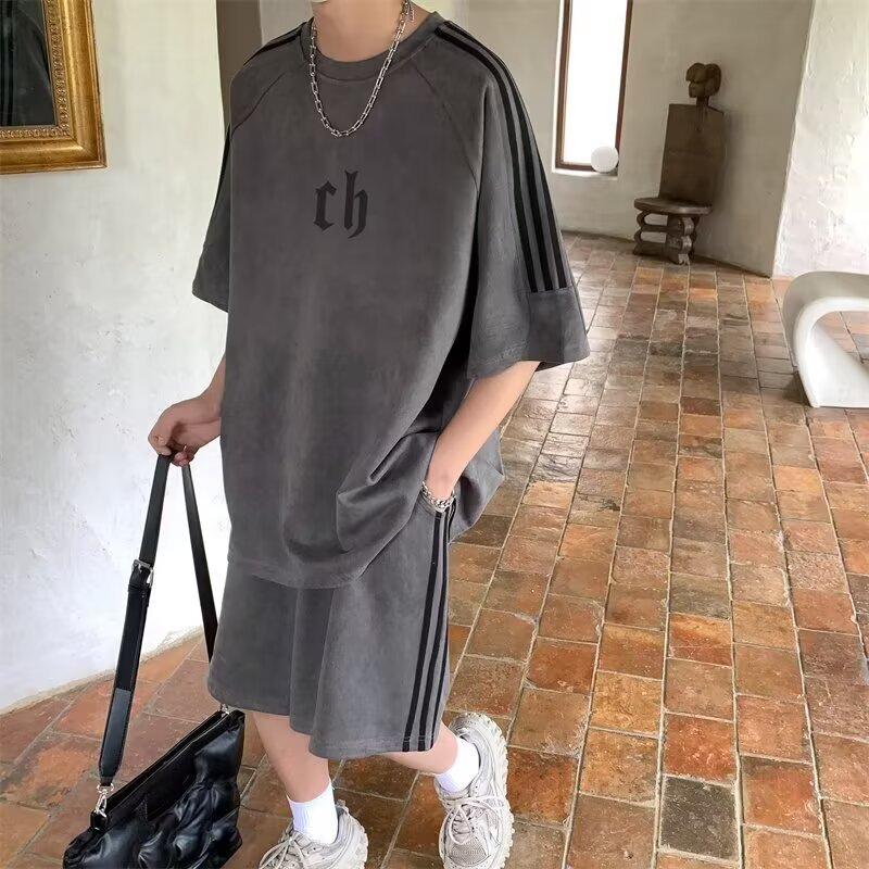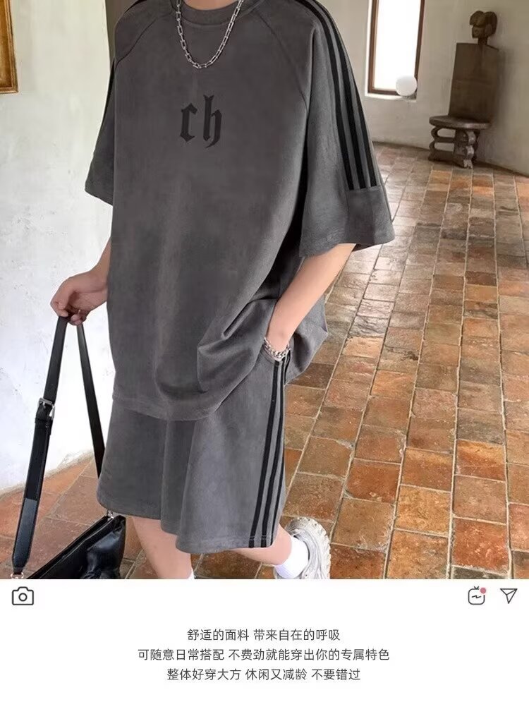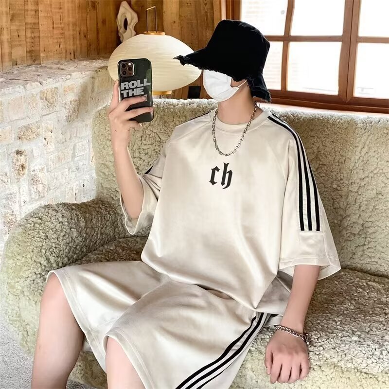여름 얇은 스웨이드 반팔 티셔츠 남성 자수 캐주얼 트렌디 브랜드 일본 스타일 레트로 라운드 넥 트랩톤 핸섬 3 바 티셔츠스토어 가기