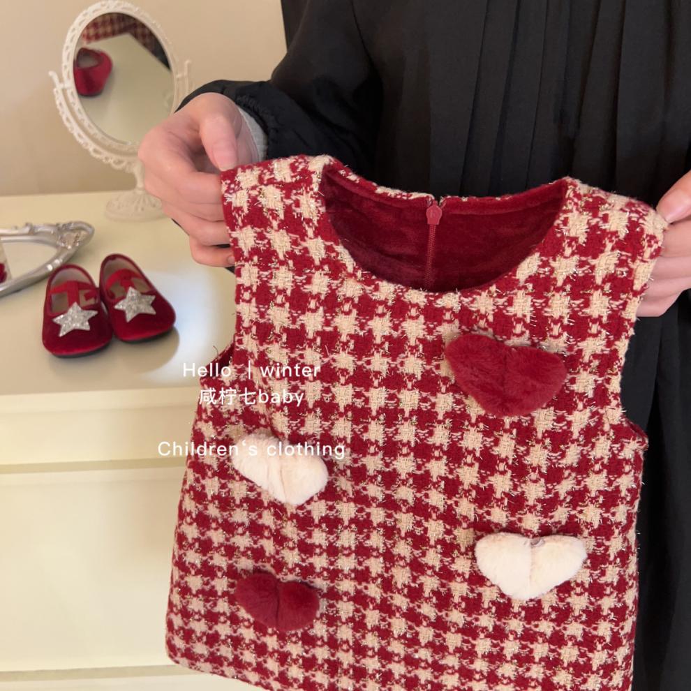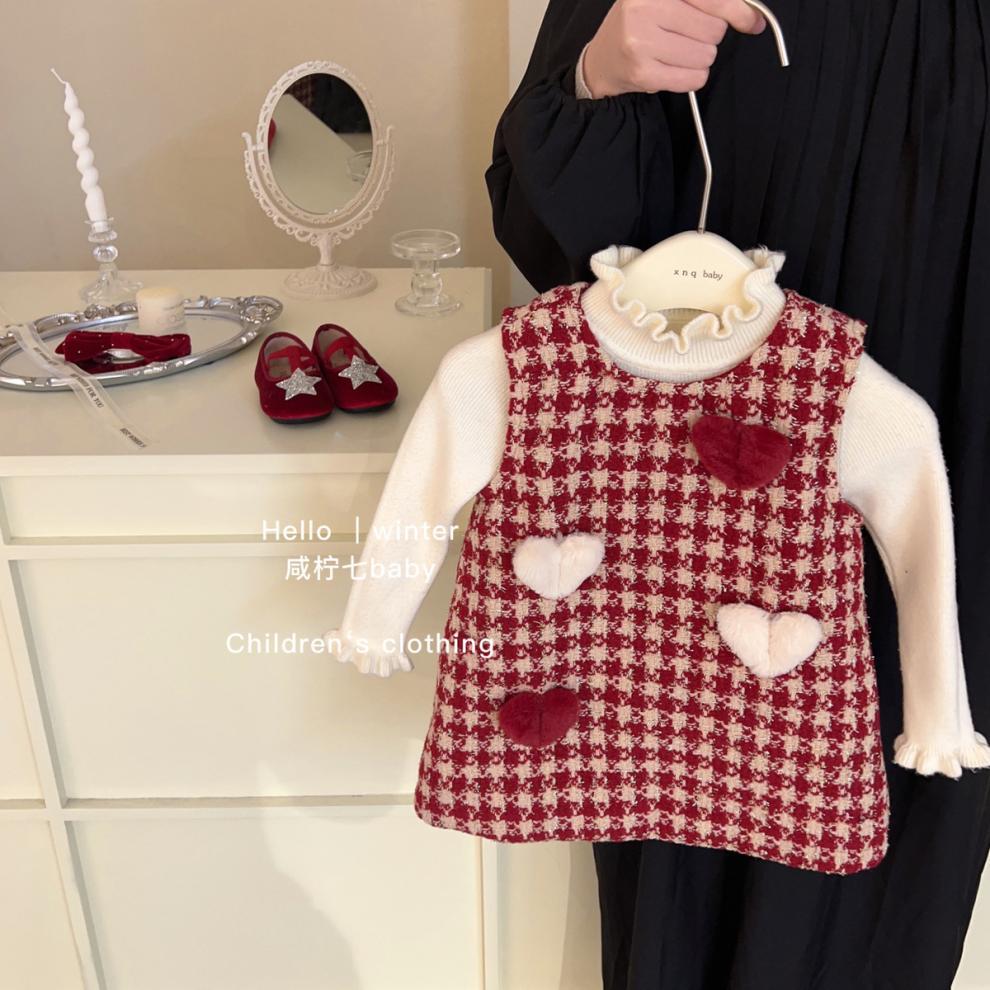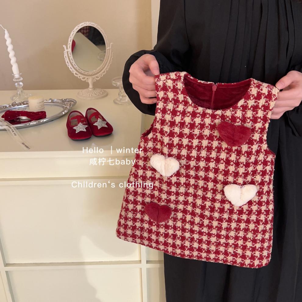 소녀의 향긋한 조끼 원피스 봄과 가을 서양식 공주 원피스 어린이 Houndstooth Love 원피스 아기 원피스스토어 가기