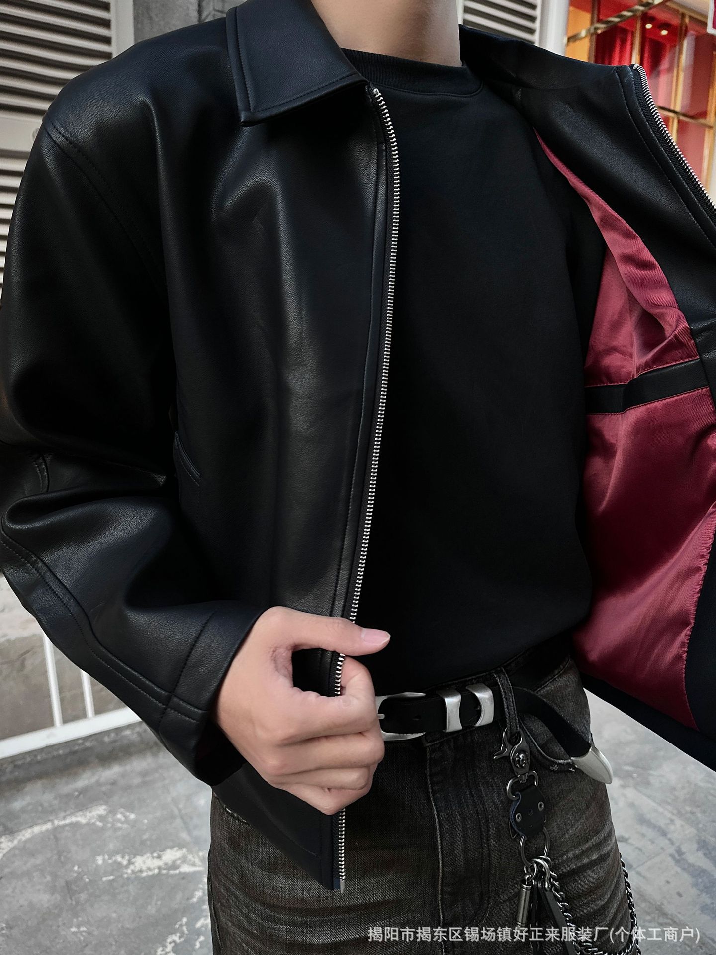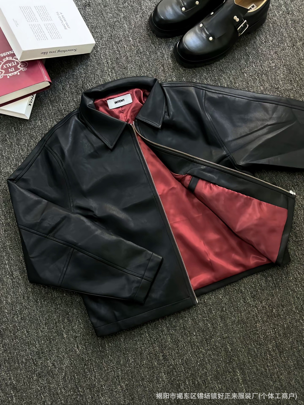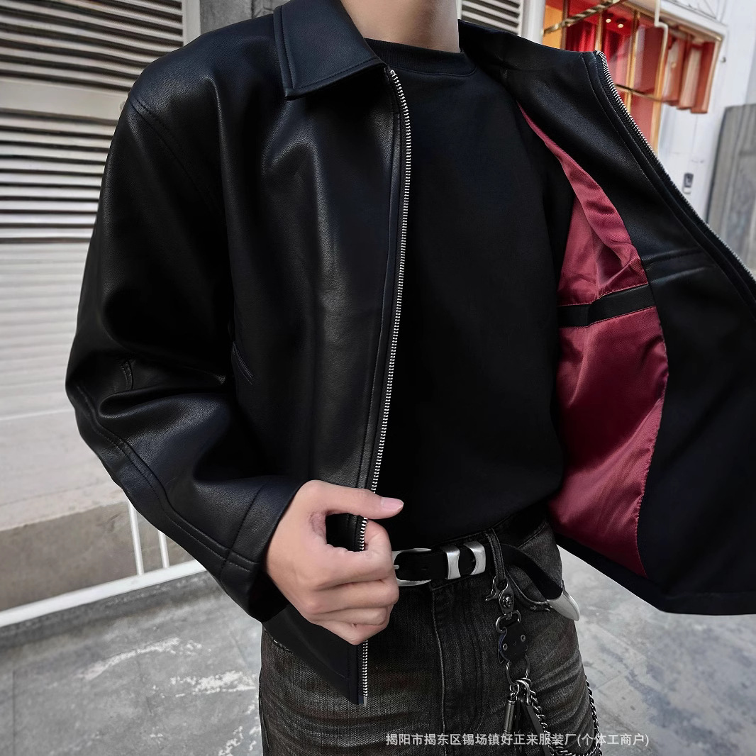 소스 제조 업체 새로운 질감 PU 가죽 짧은 와이드 블랙 가죽 Cleanfit 남성 재킷 코트 Ancora 레드 내부