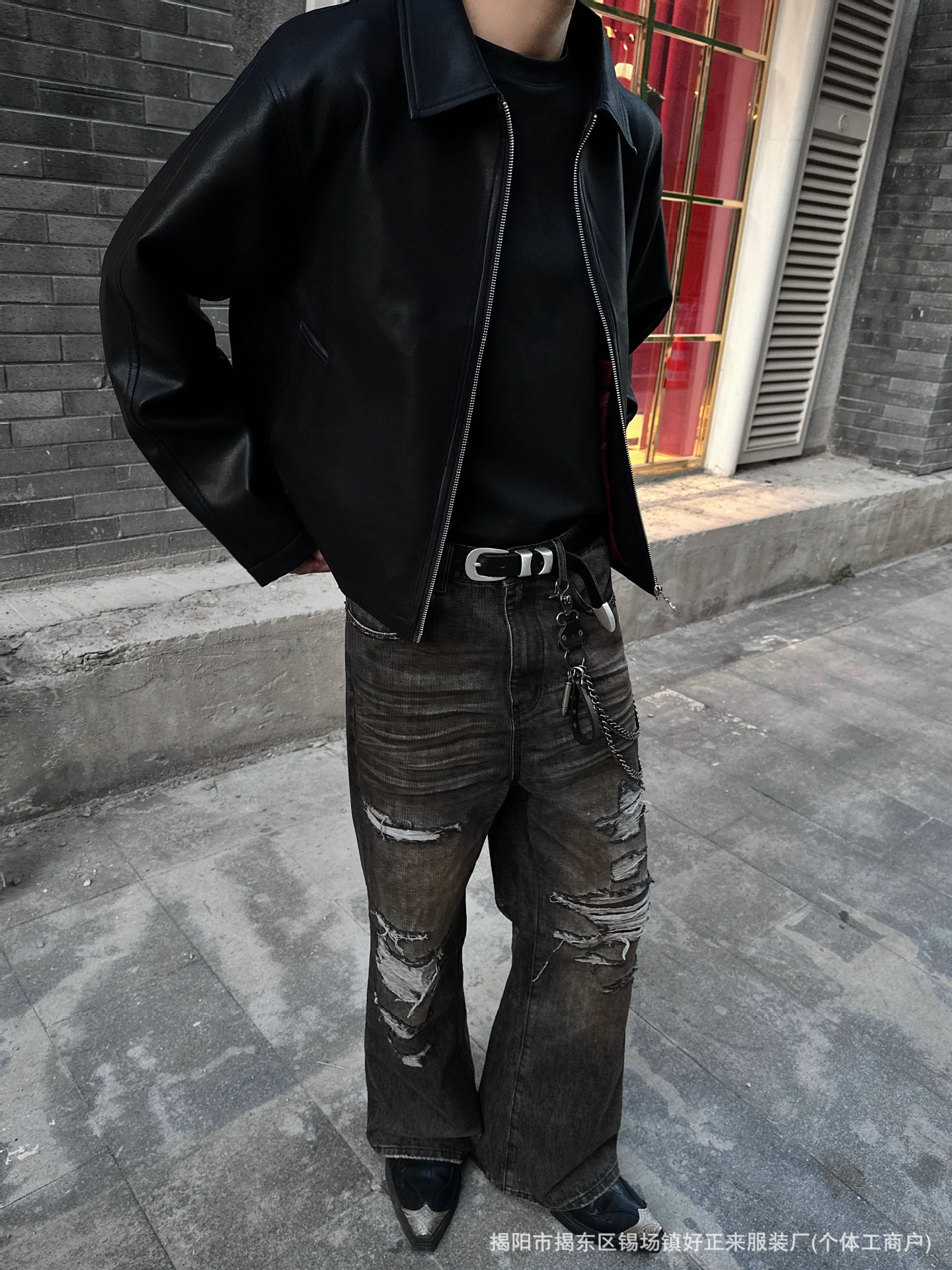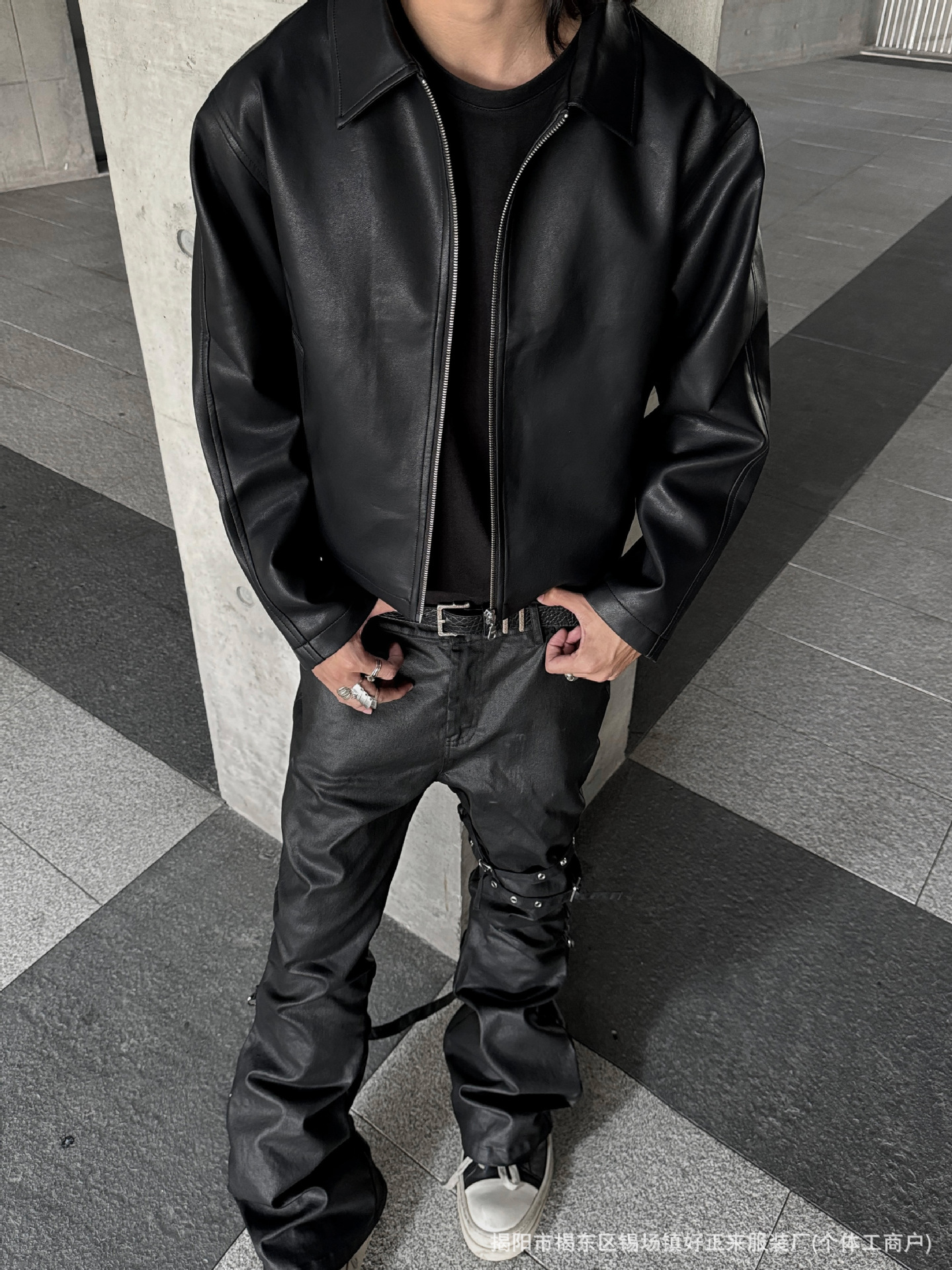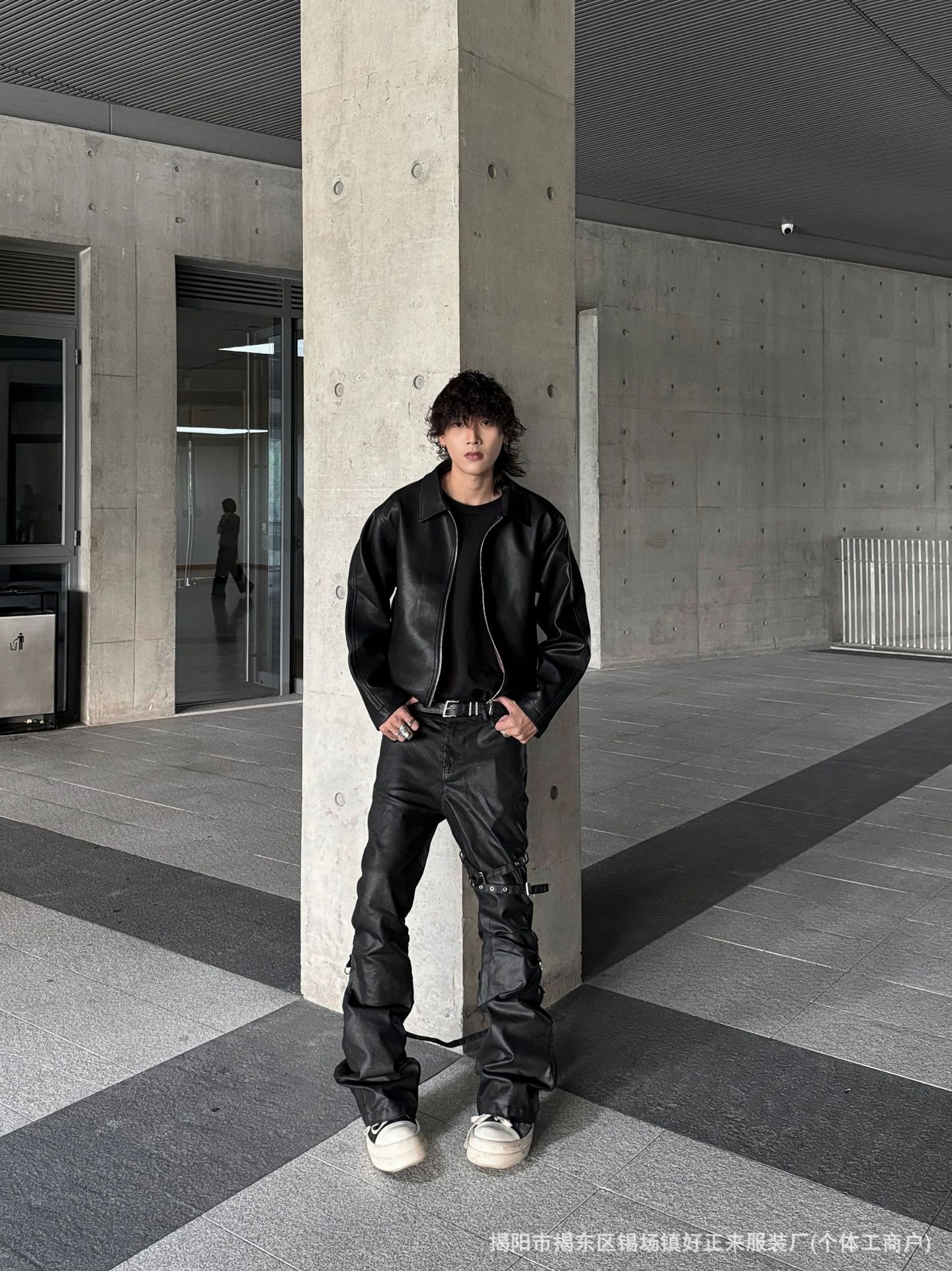 소스 제조 업체 새로운 질감 PU 가죽 짧은 와이드 블랙 가죽 Cleanfit 남성 재킷 코트 Ancora 레드 내부스토어 가기