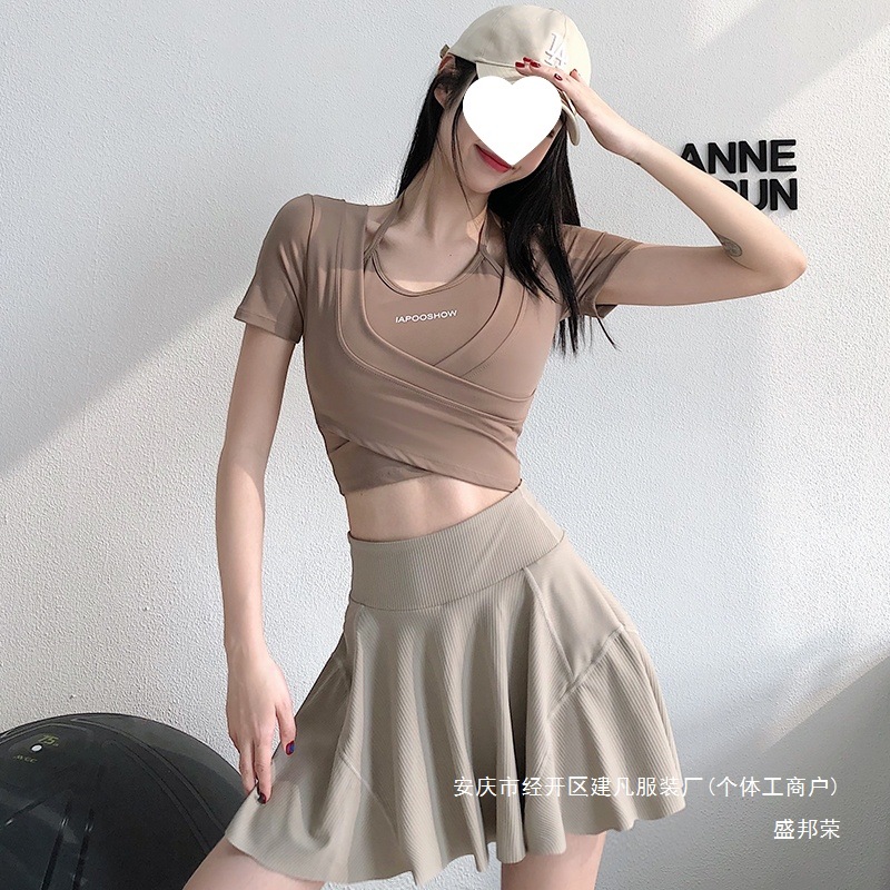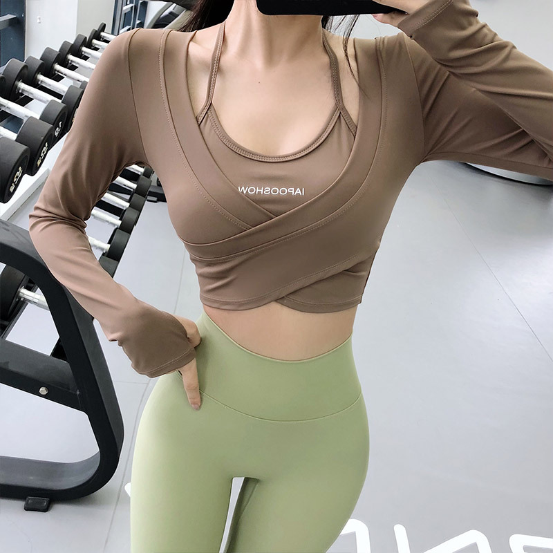슬리밍 요가 옷 가짜 투피스 긴팔 피트니스 옷 스포츠 셔츠 가슴 패드 여성의 배꼽 탑으로 빠른 건조