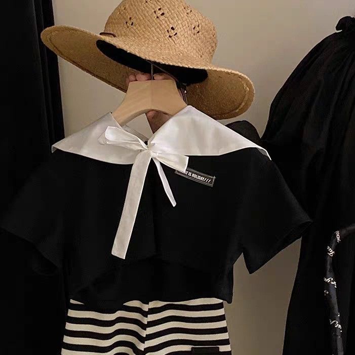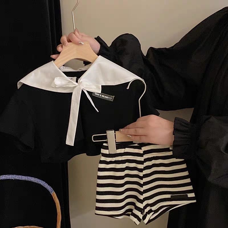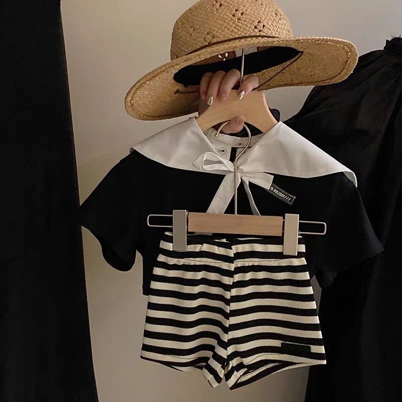 한국식 아동복 2025 여름 신형 소녀 서양식 대학 스타일 짧은 소매 탑 캐주얼 스트라이프 반바지 트렌디 한 세트