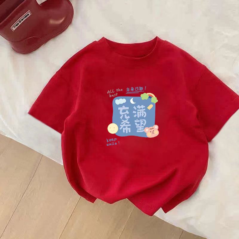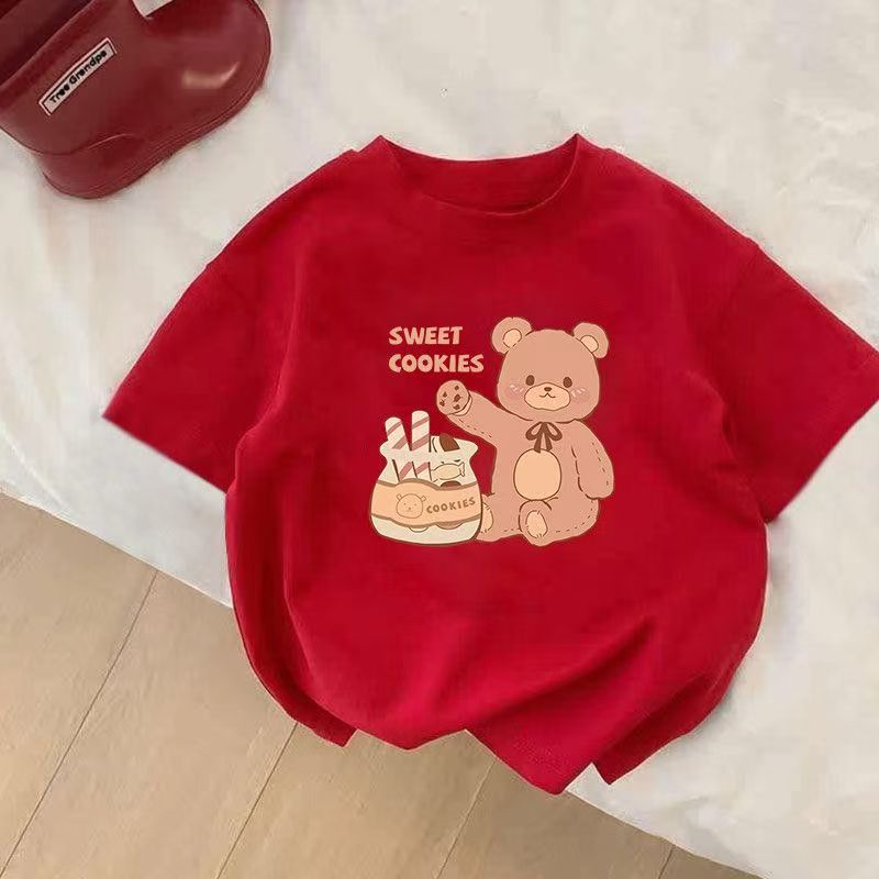 2025 새로운 한국 아동면 반팔 티셔츠 어린이 반소매 빨간 아동복 베이비 캐주얼 프린트 탑 t