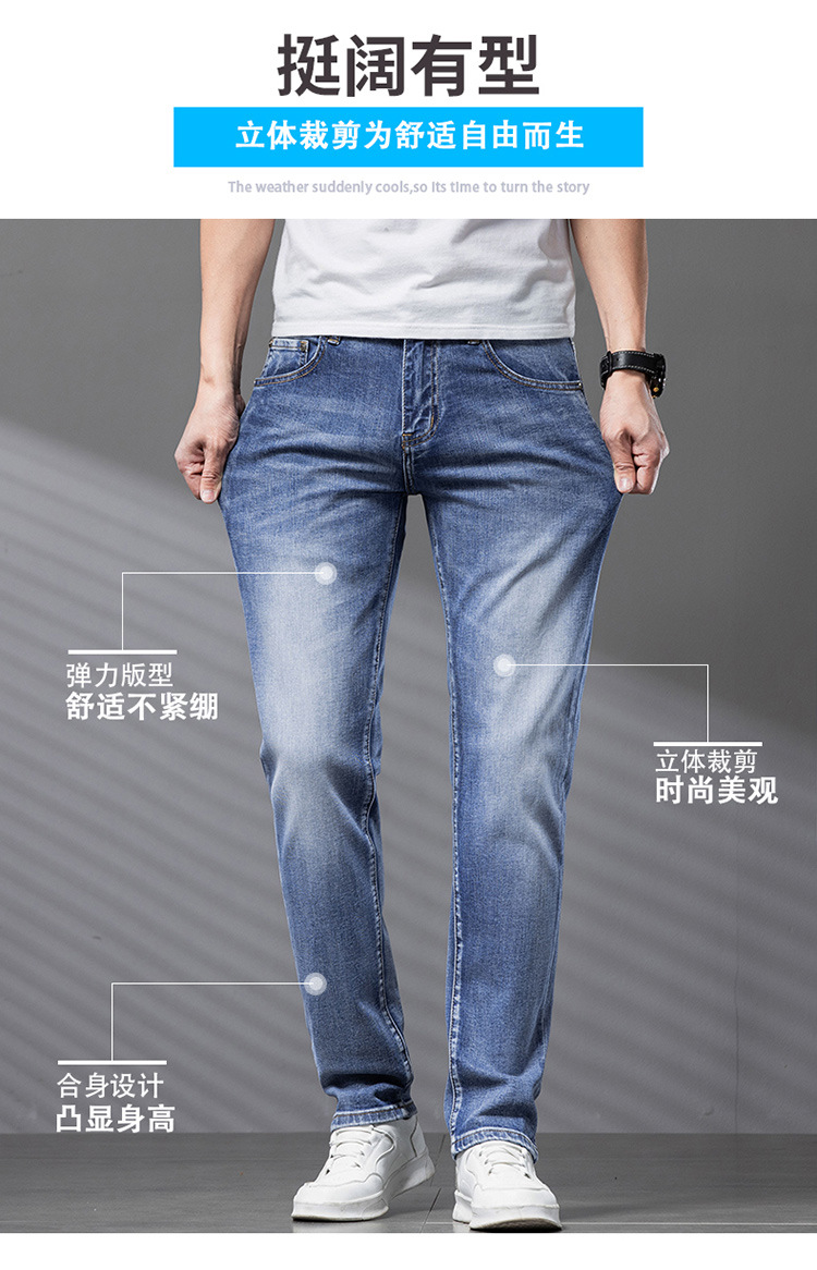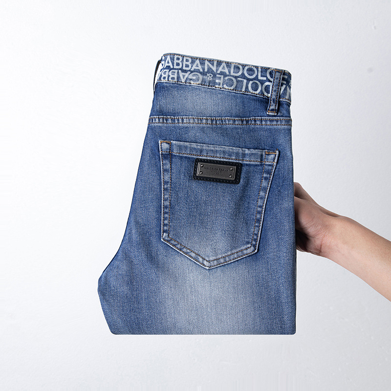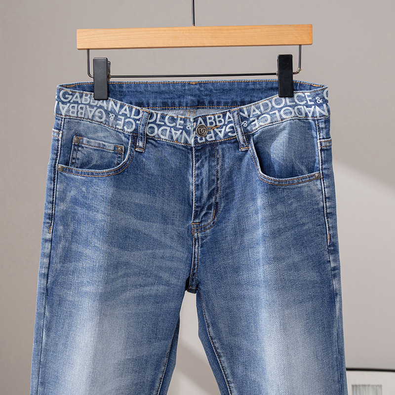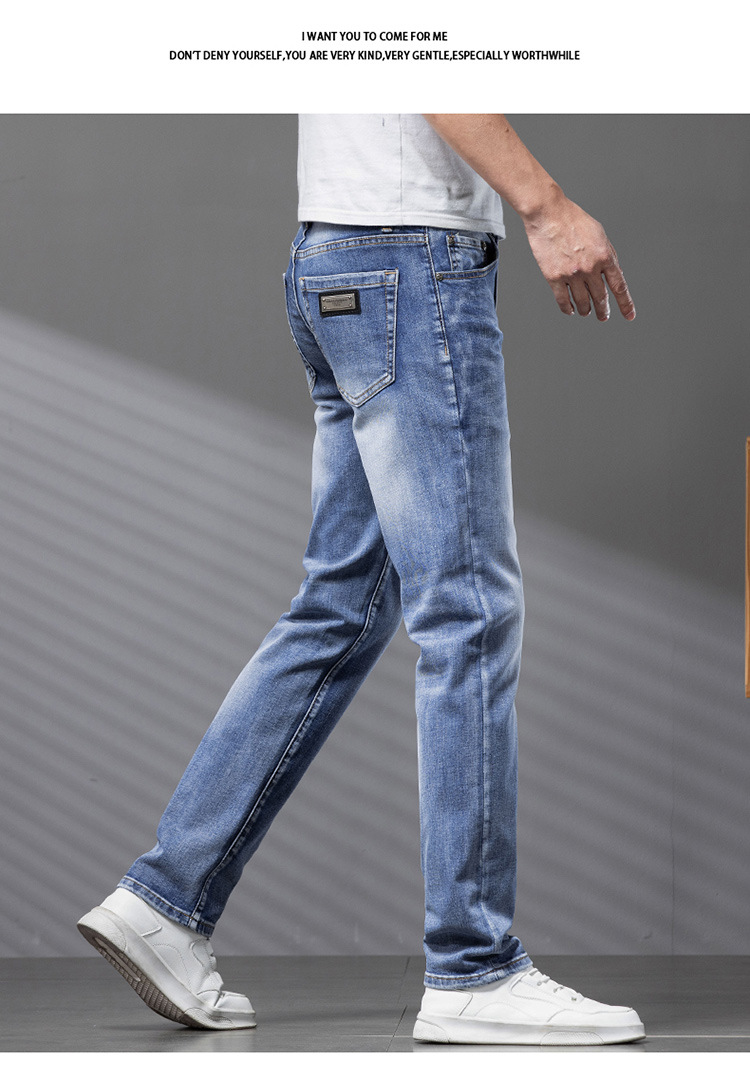 2025 청바지 남성용 한국식 슬림 핏 작은 발 국경 대외 무역 브랜드 얇은 세척 인쇄 표준 유럽과 미국 바지