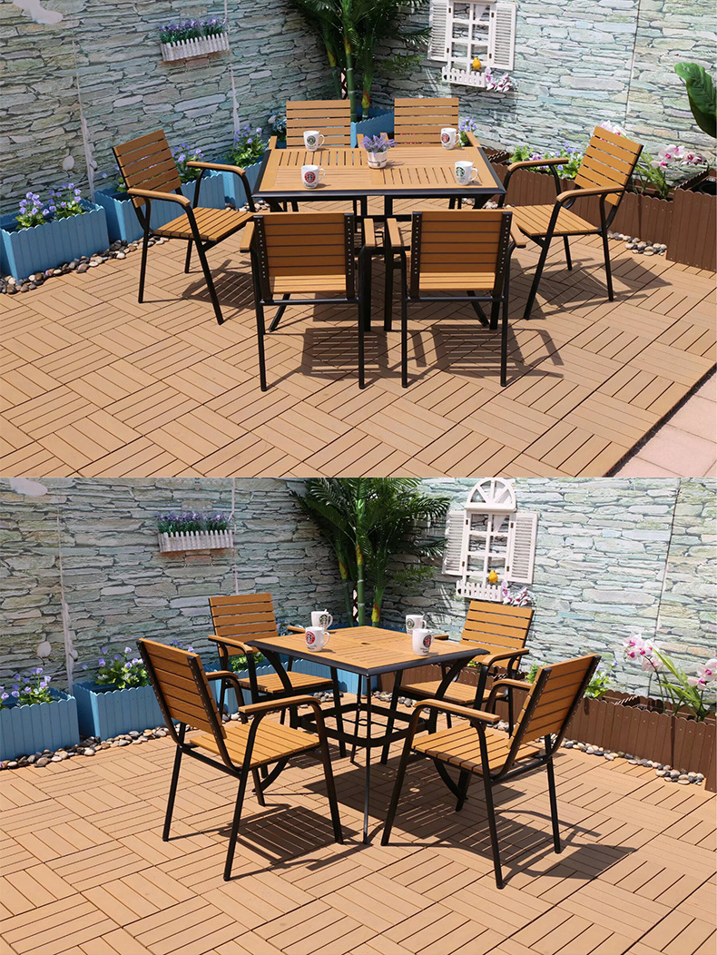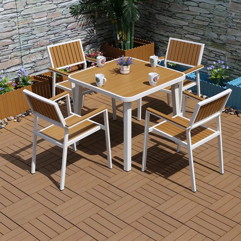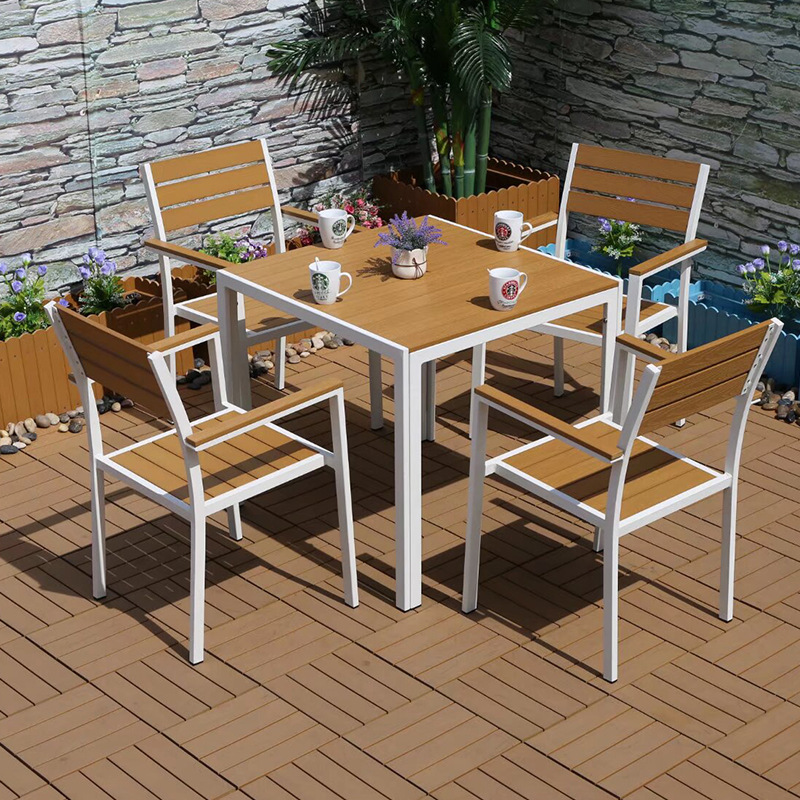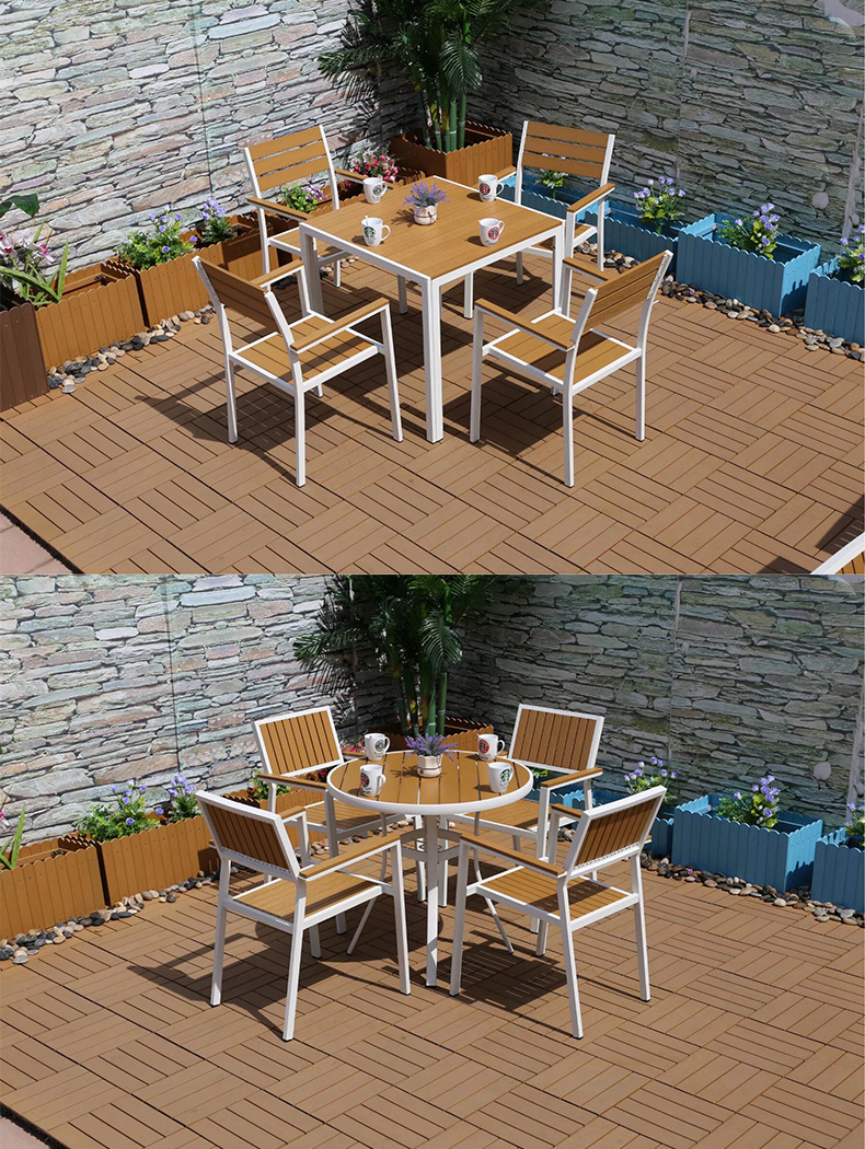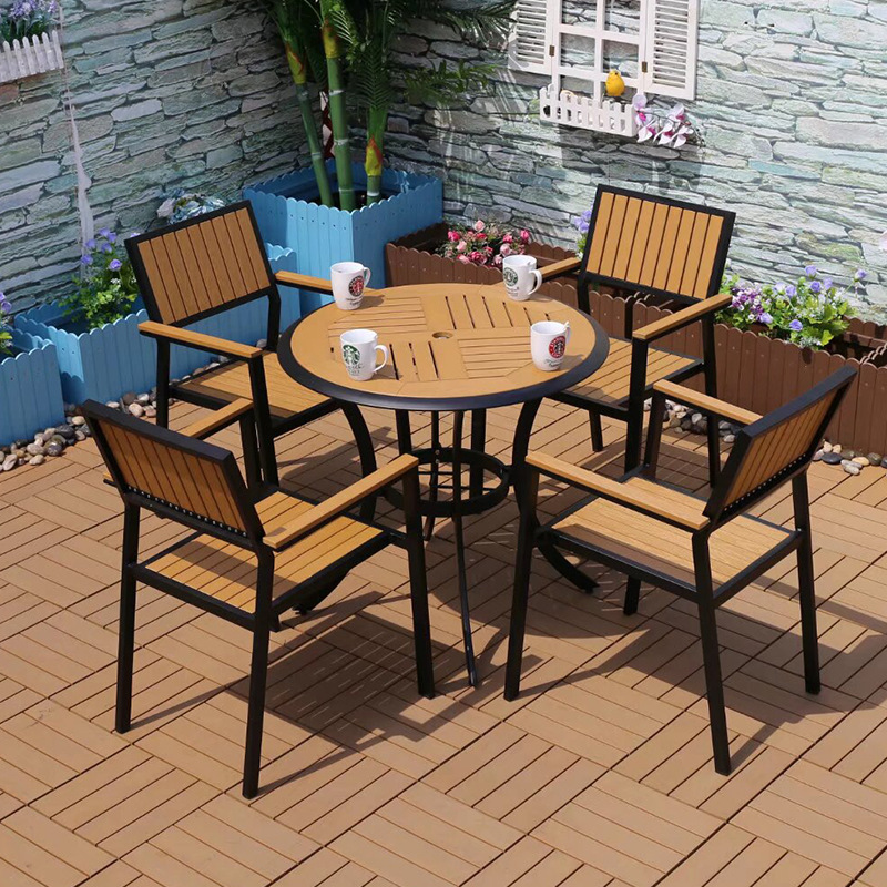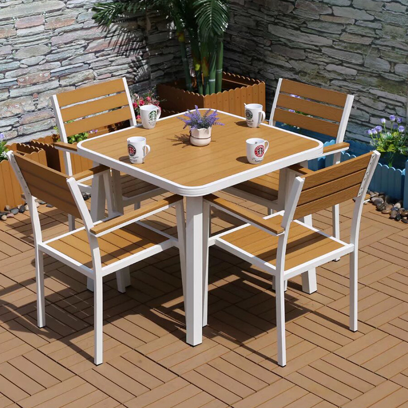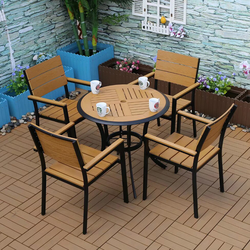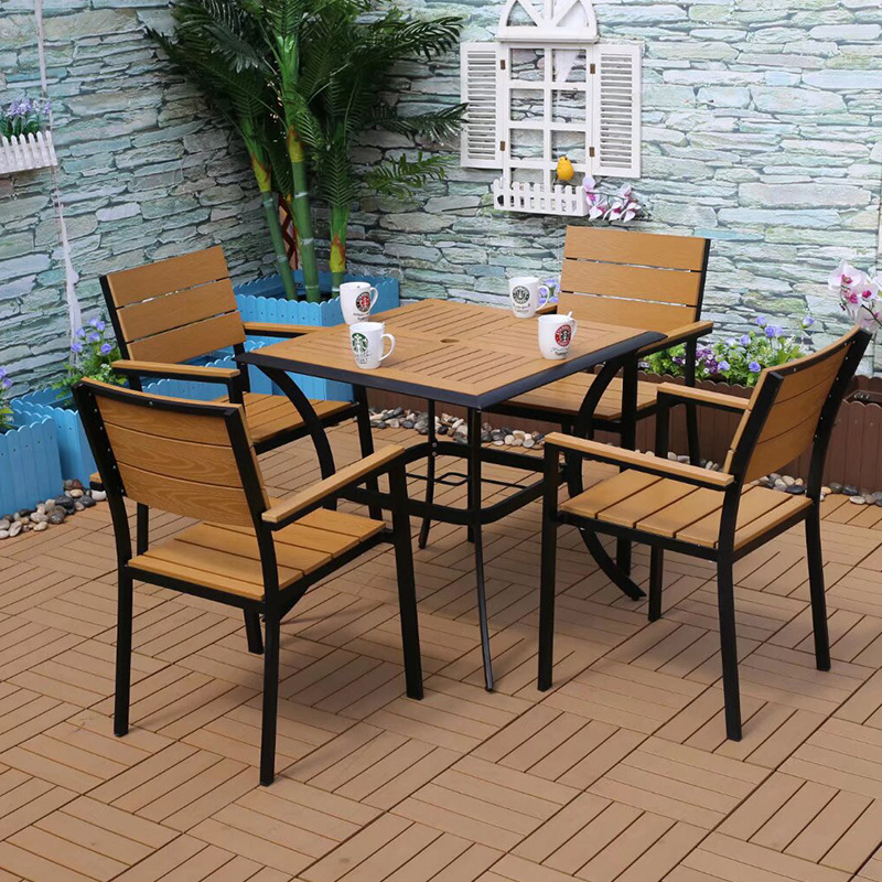 야외 플라스틱 목재 캐주얼 테이블 및 의자 조합 안뜰 방수 선 스크린 가든 테라스 카페 호텔 부식 방지 나무 테이블 및 의자스토어 가기