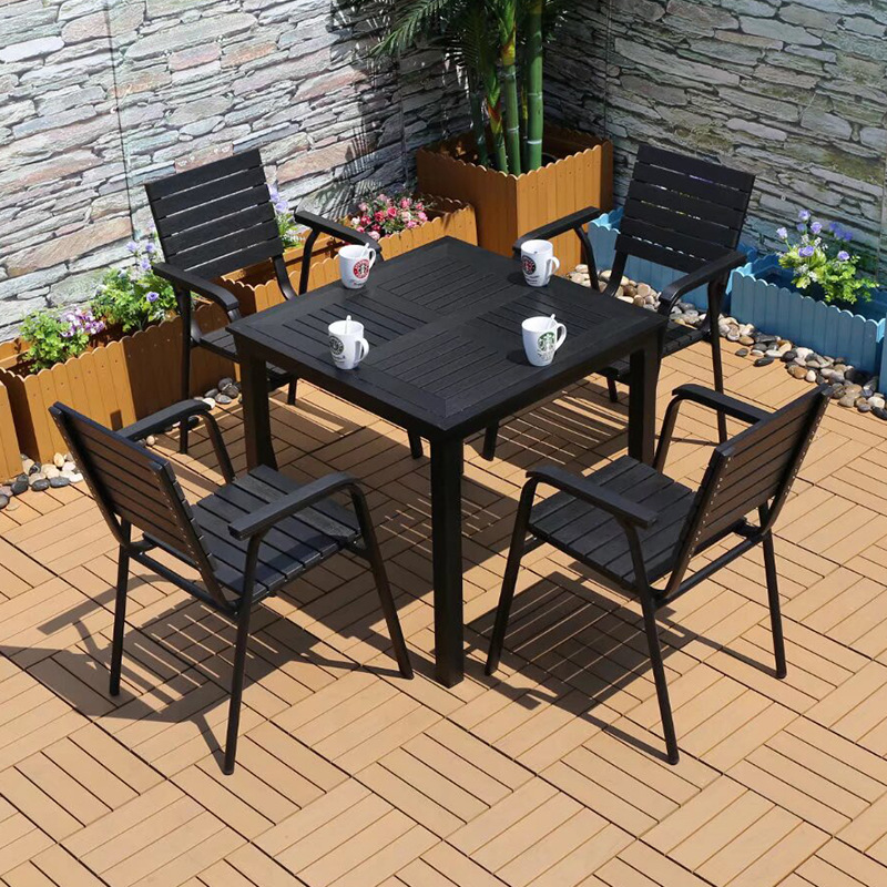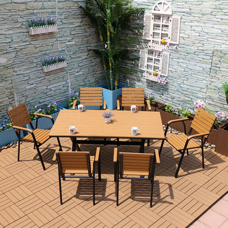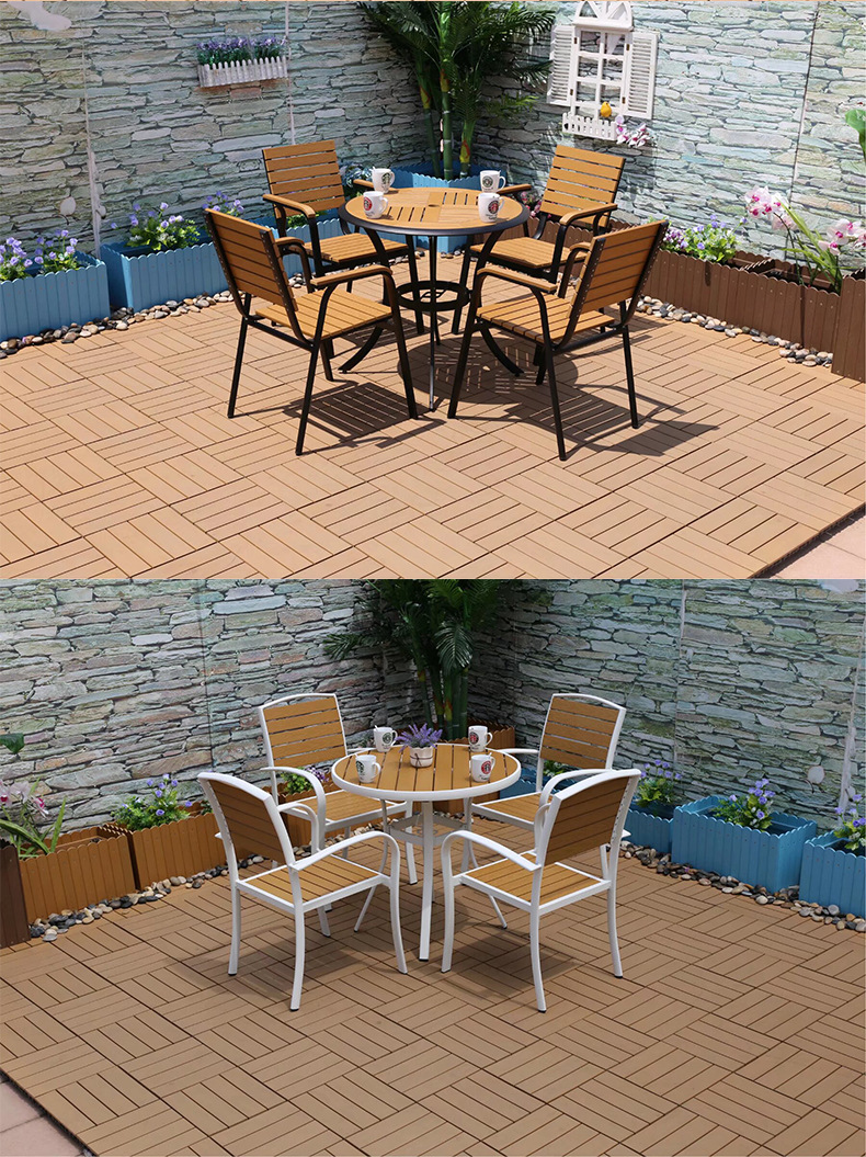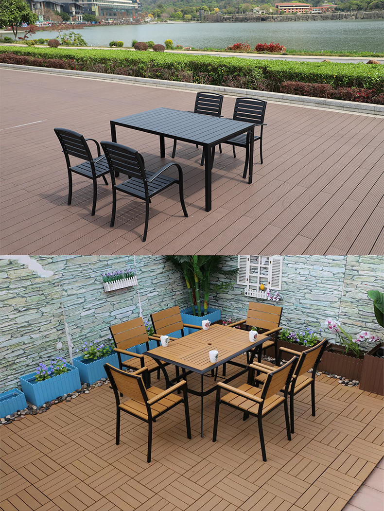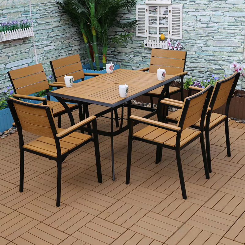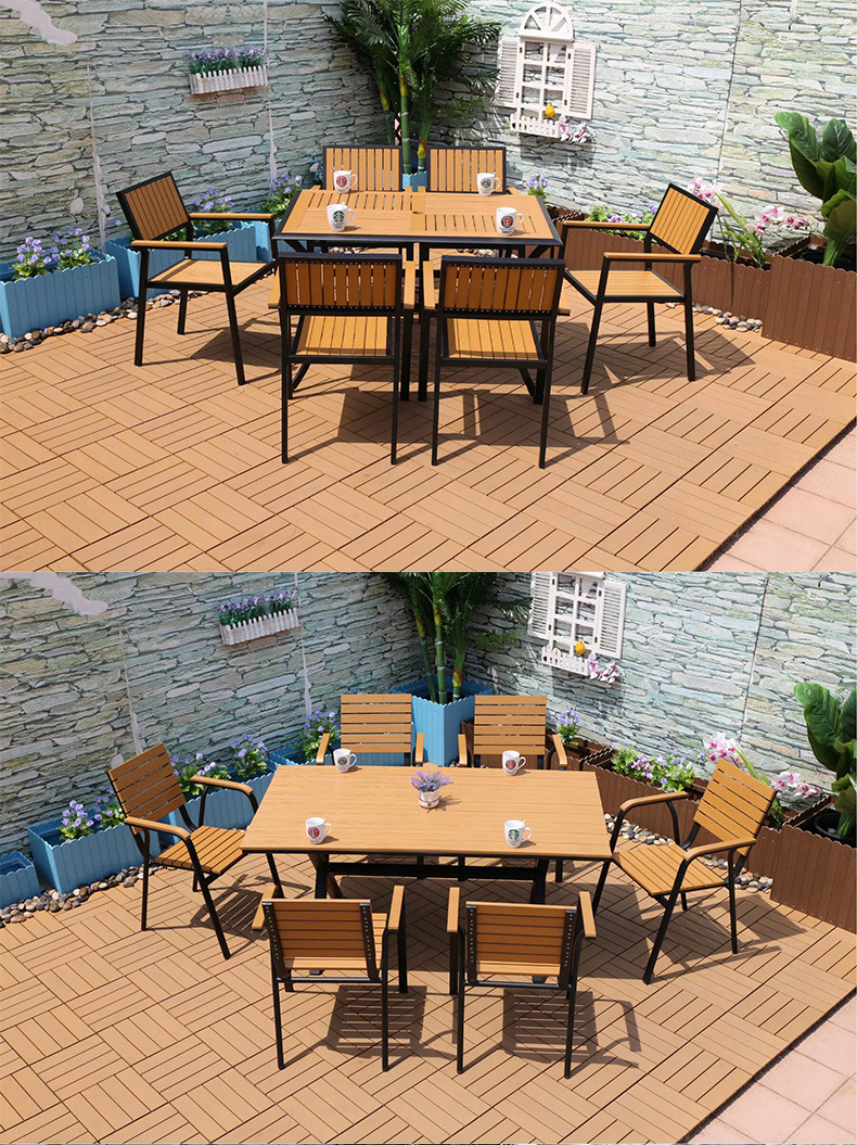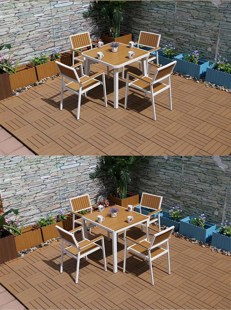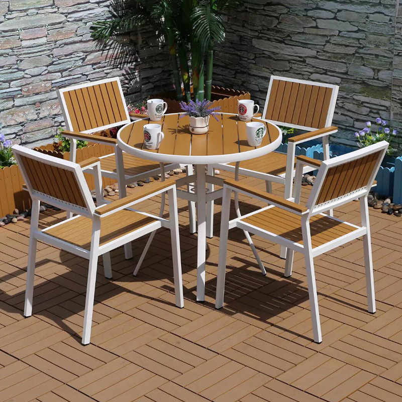 야외 플라스틱 목재 캐주얼 테이블 및 의자 조합 안뜰 방수 선 스크린 가든 테라스 카페 호텔 부식 방지 나무 테이블 및 의자스토어 가기