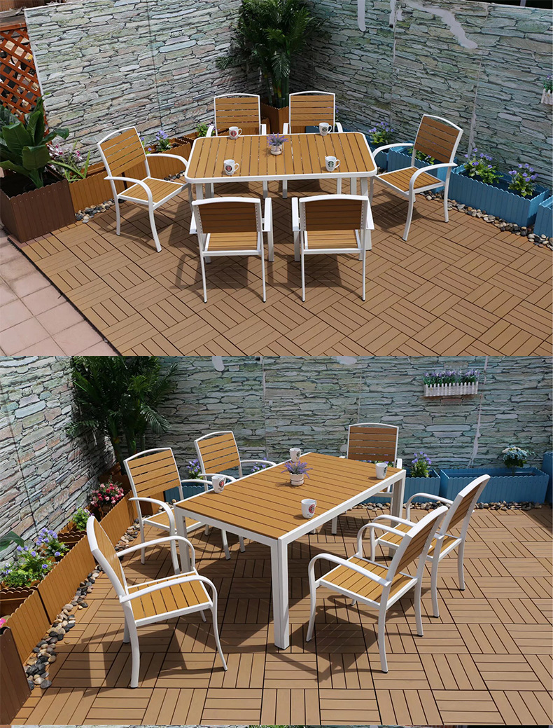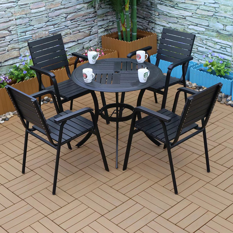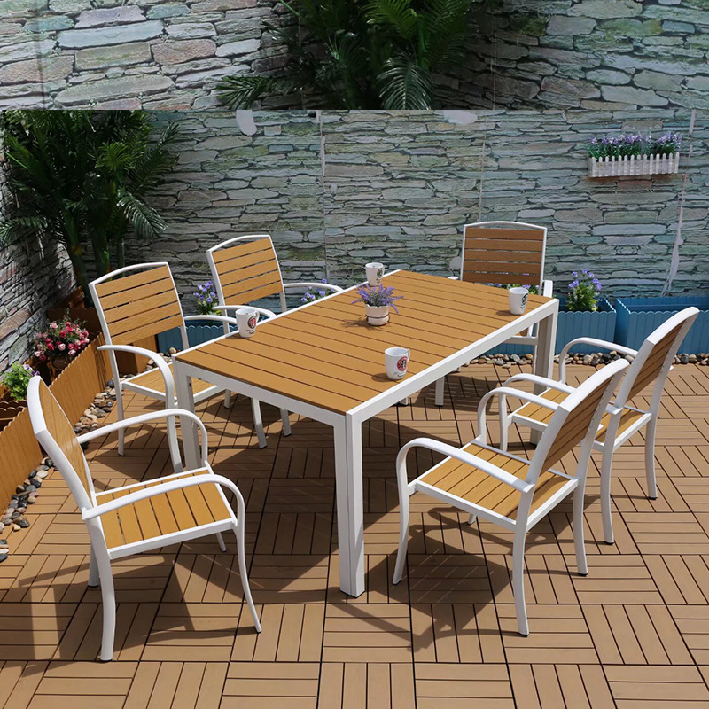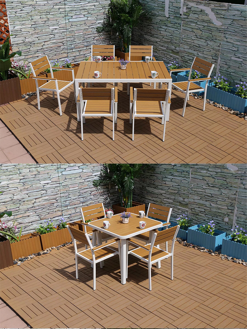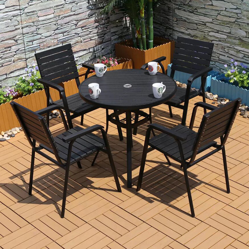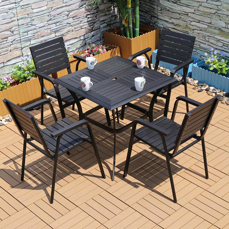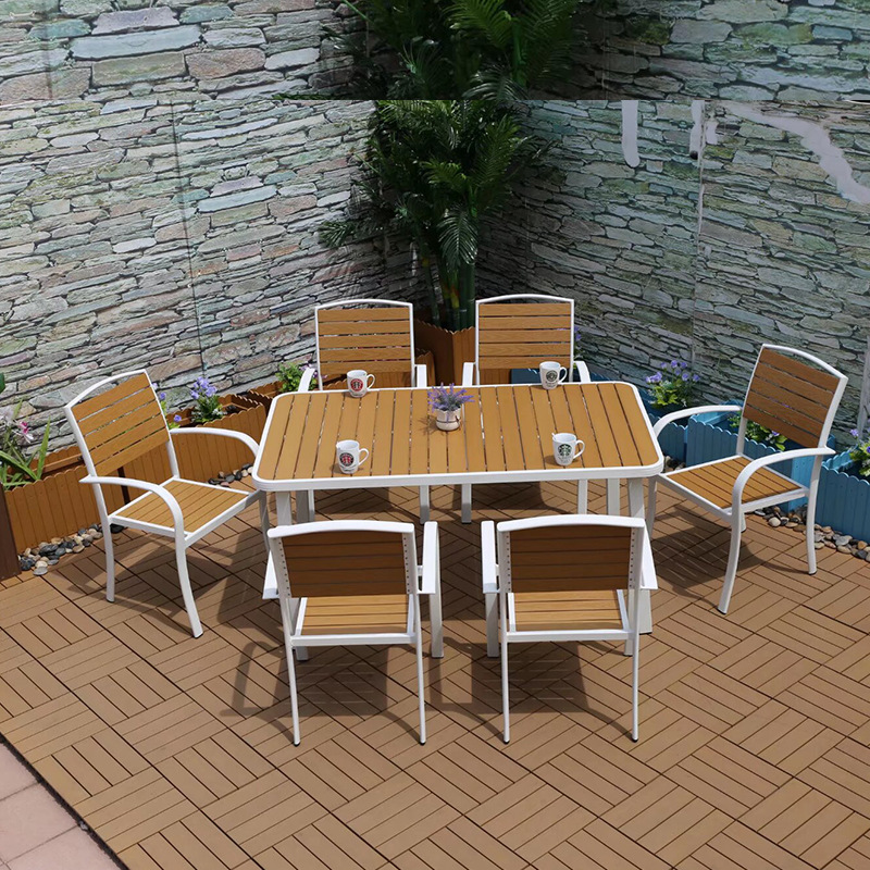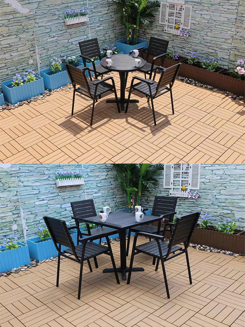 야외 플라스틱 목재 캐주얼 테이블 및 의자 조합 안뜰 방수 선 스크린 가든 테라스 카페 호텔 부식 방지 나무 테이블 및 의자스토어 가기