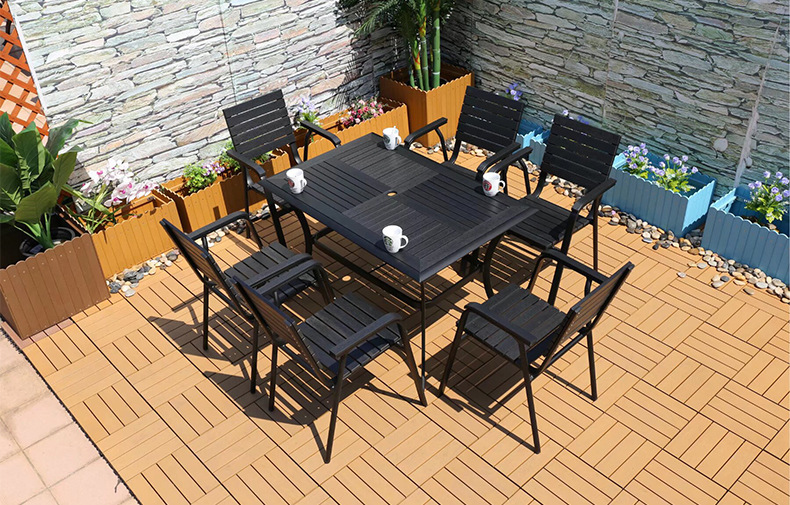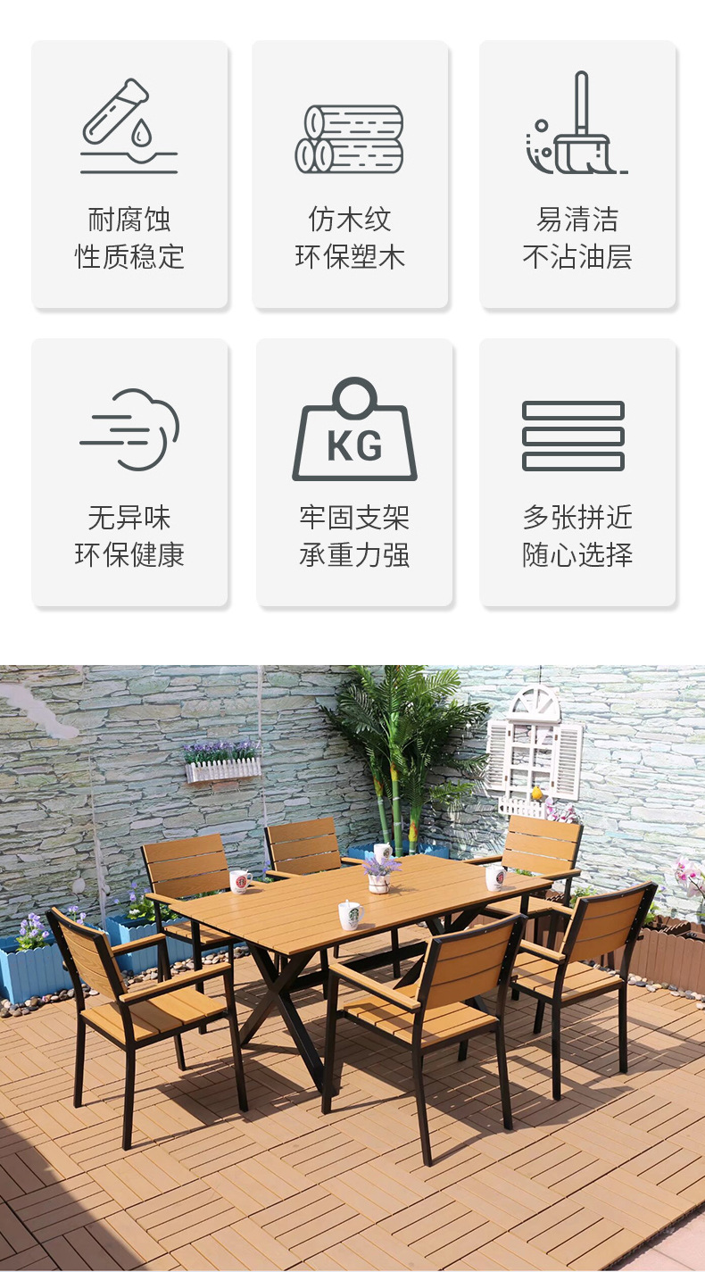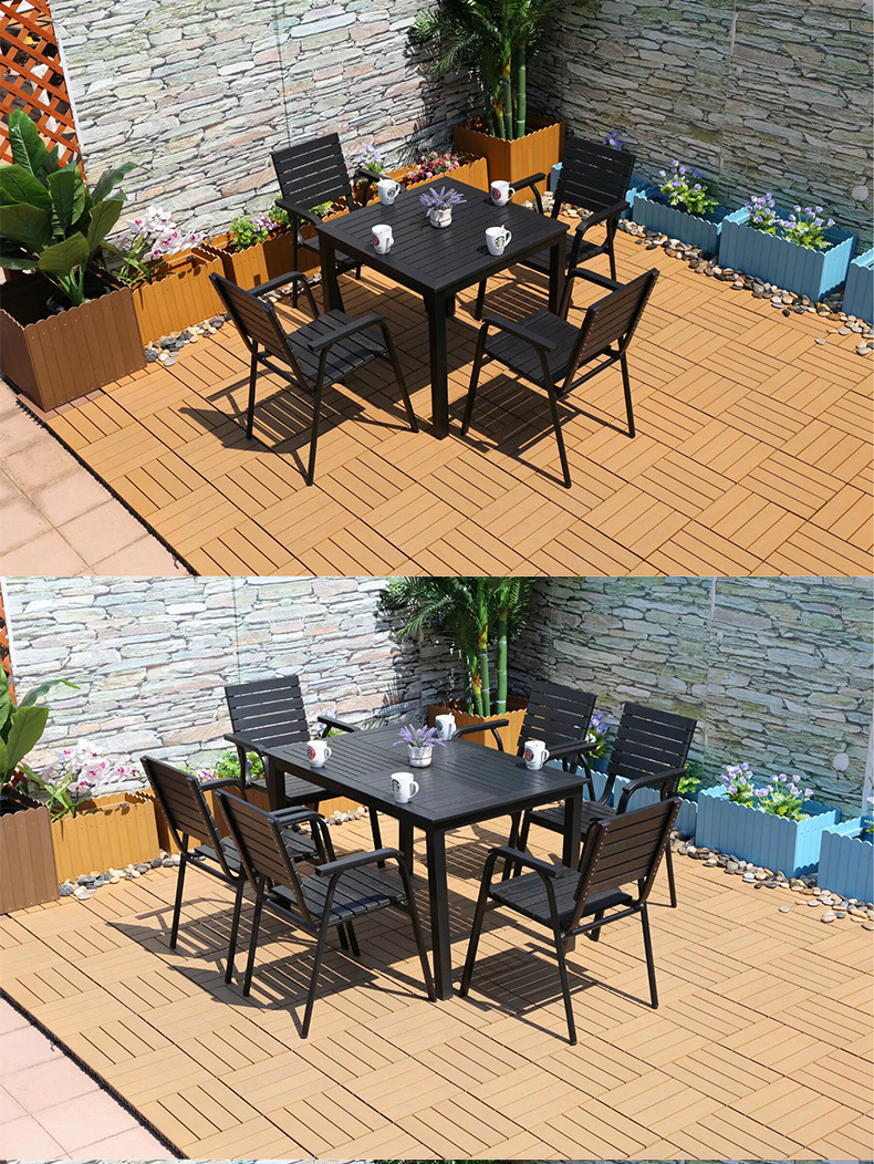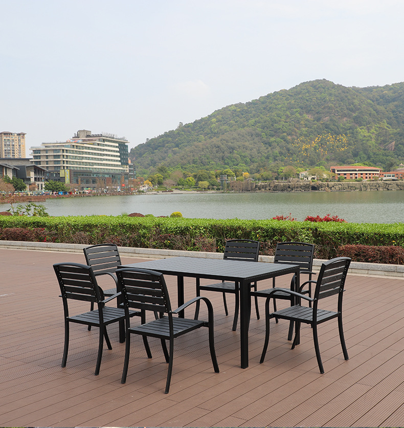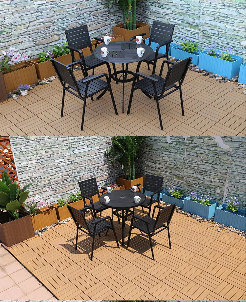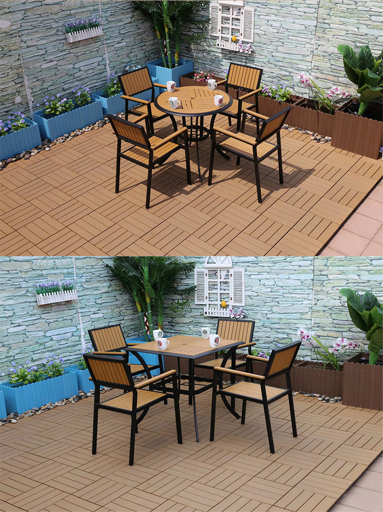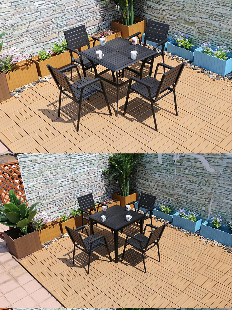 야외 플라스틱 목재 캐주얼 테이블 및 의자 조합 안뜰 방수 선 스크린 가든 테라스 카페 호텔 부식 방지 나무 테이블 및 의자스토어 가기