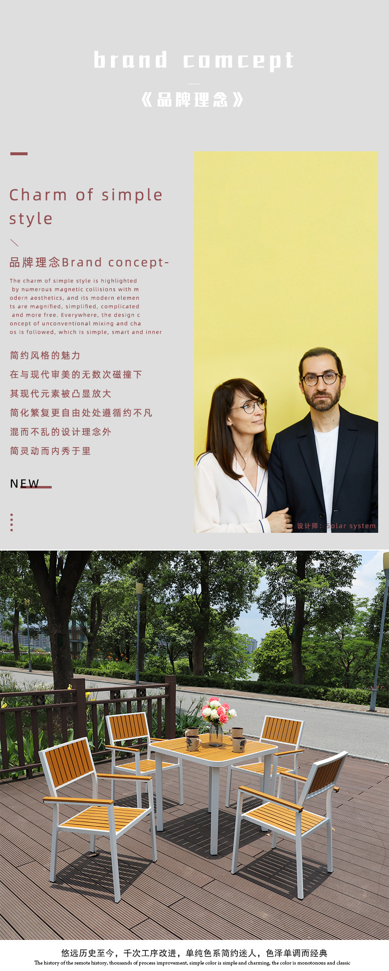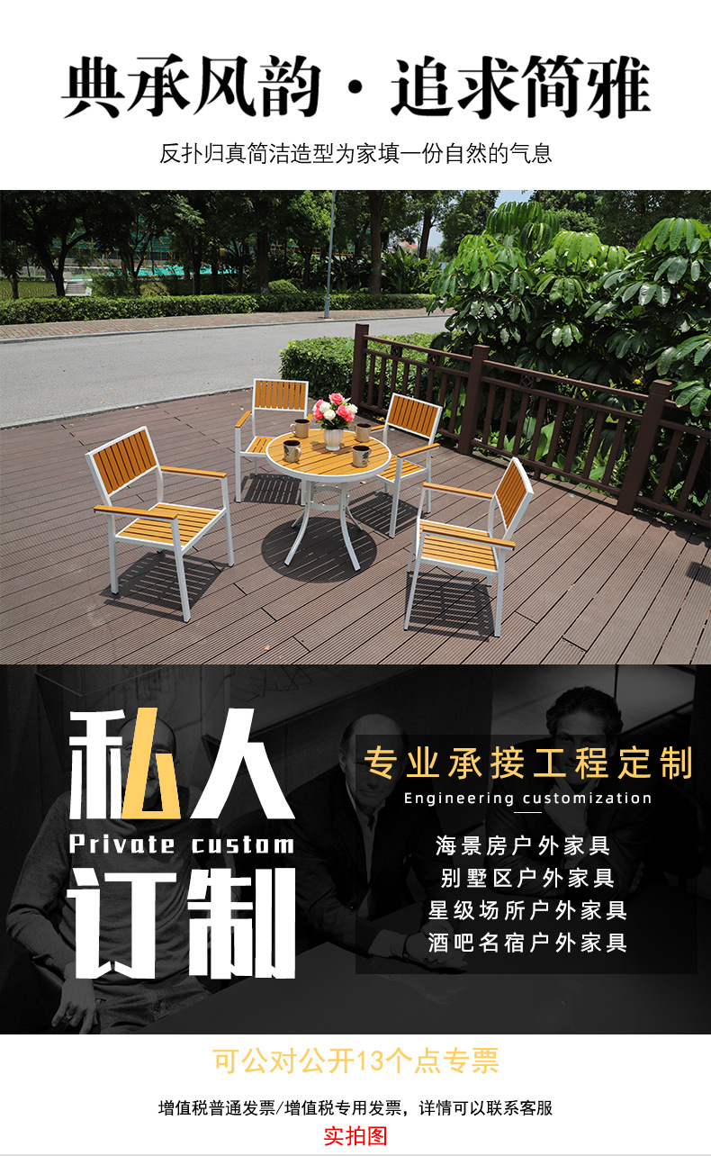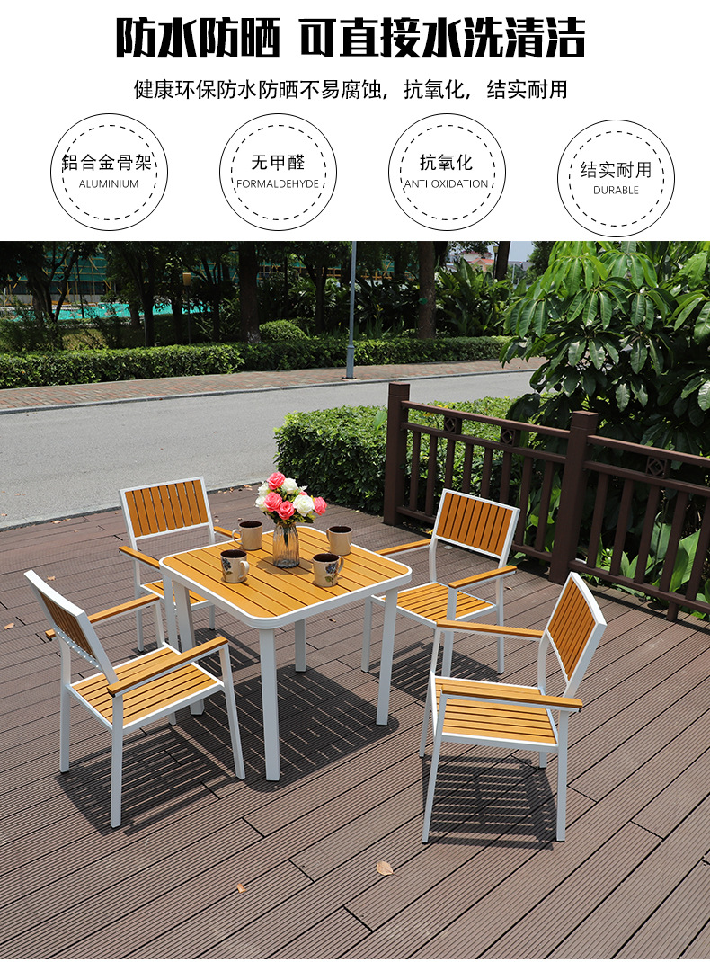야외 플라스틱 목재 캐주얼 테이블 및 의자 조합 안뜰 방수 선 스크린 가든 테라스 카페 호텔 부식 방지 나무 테이블 및 의자