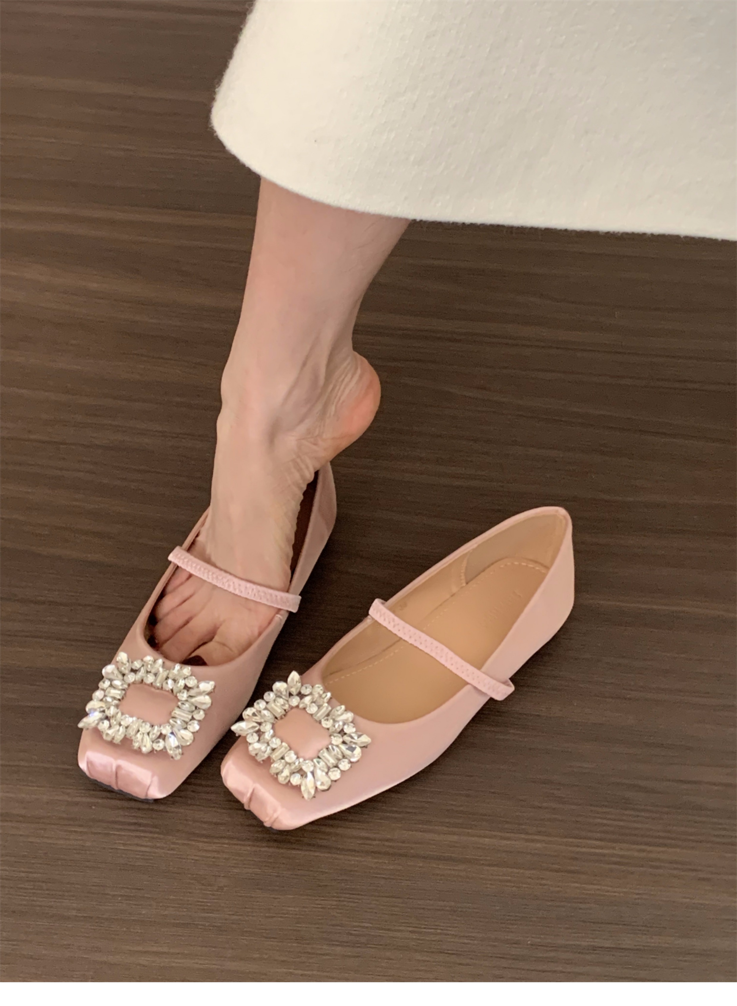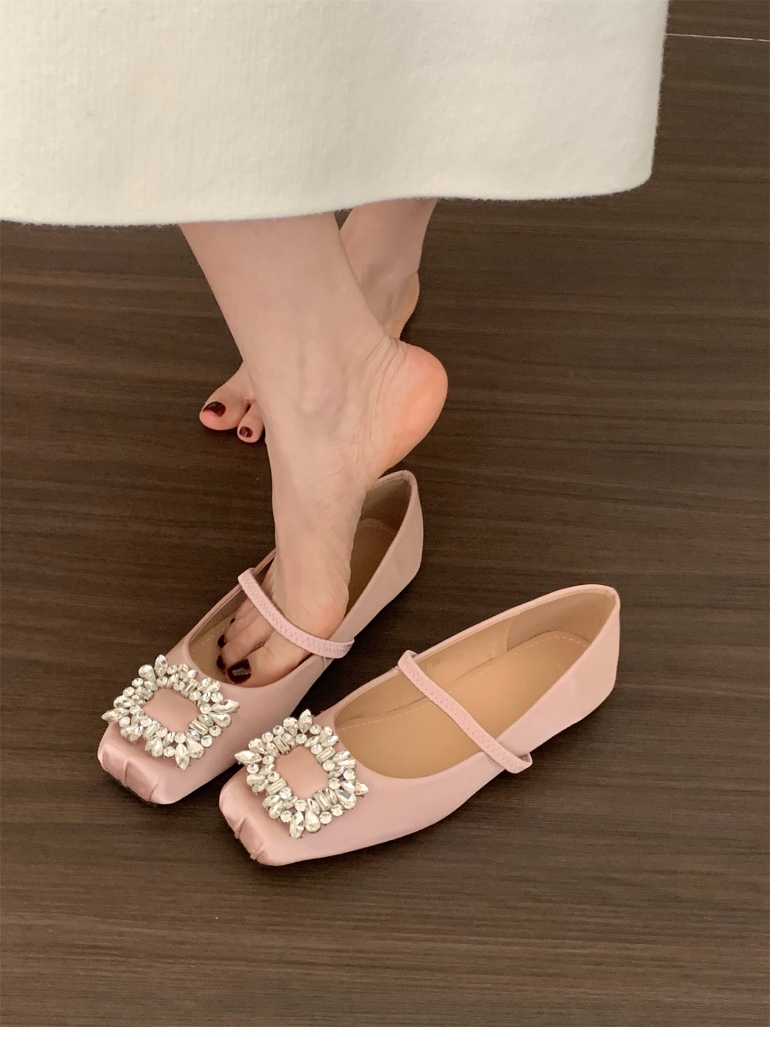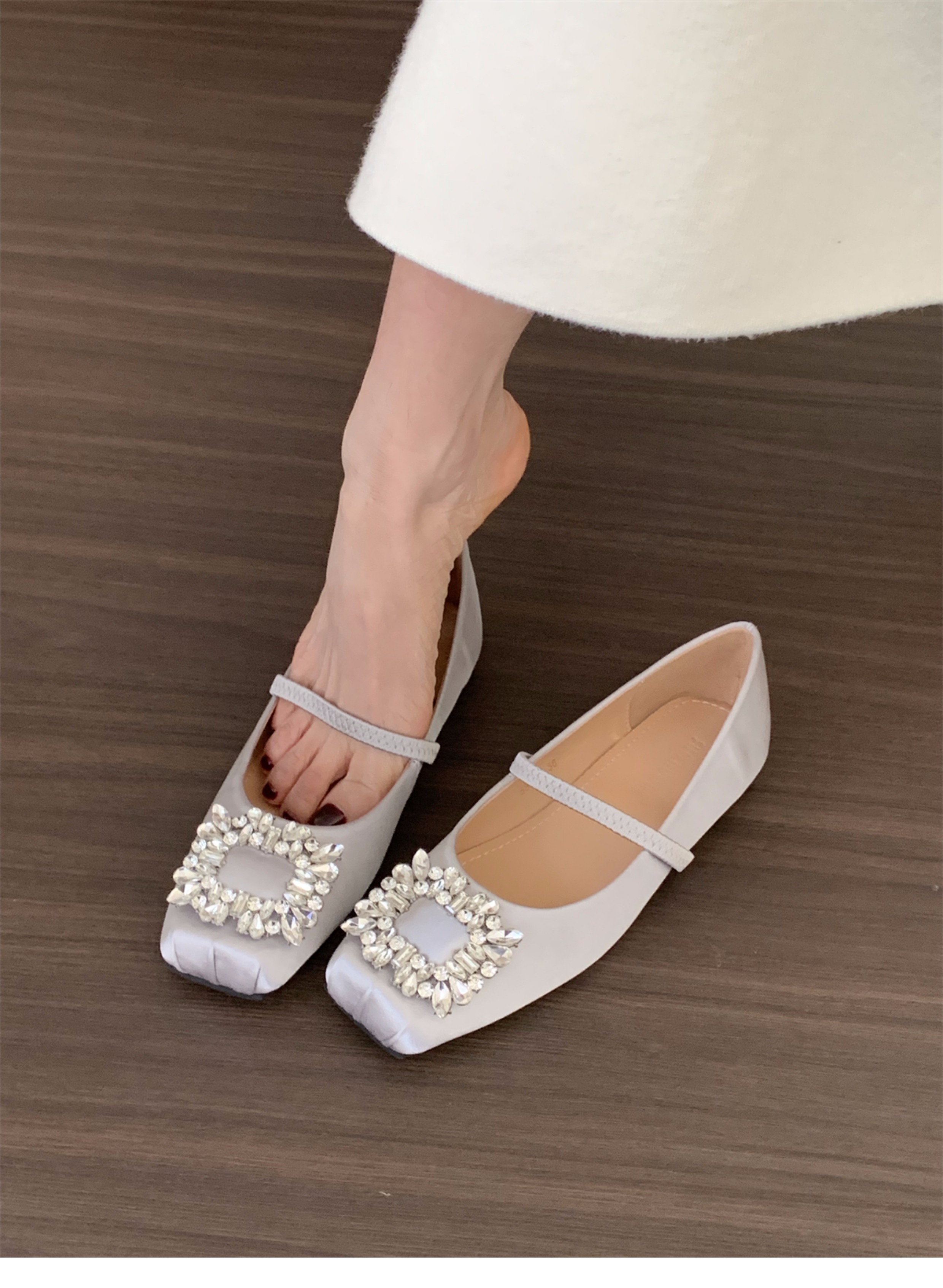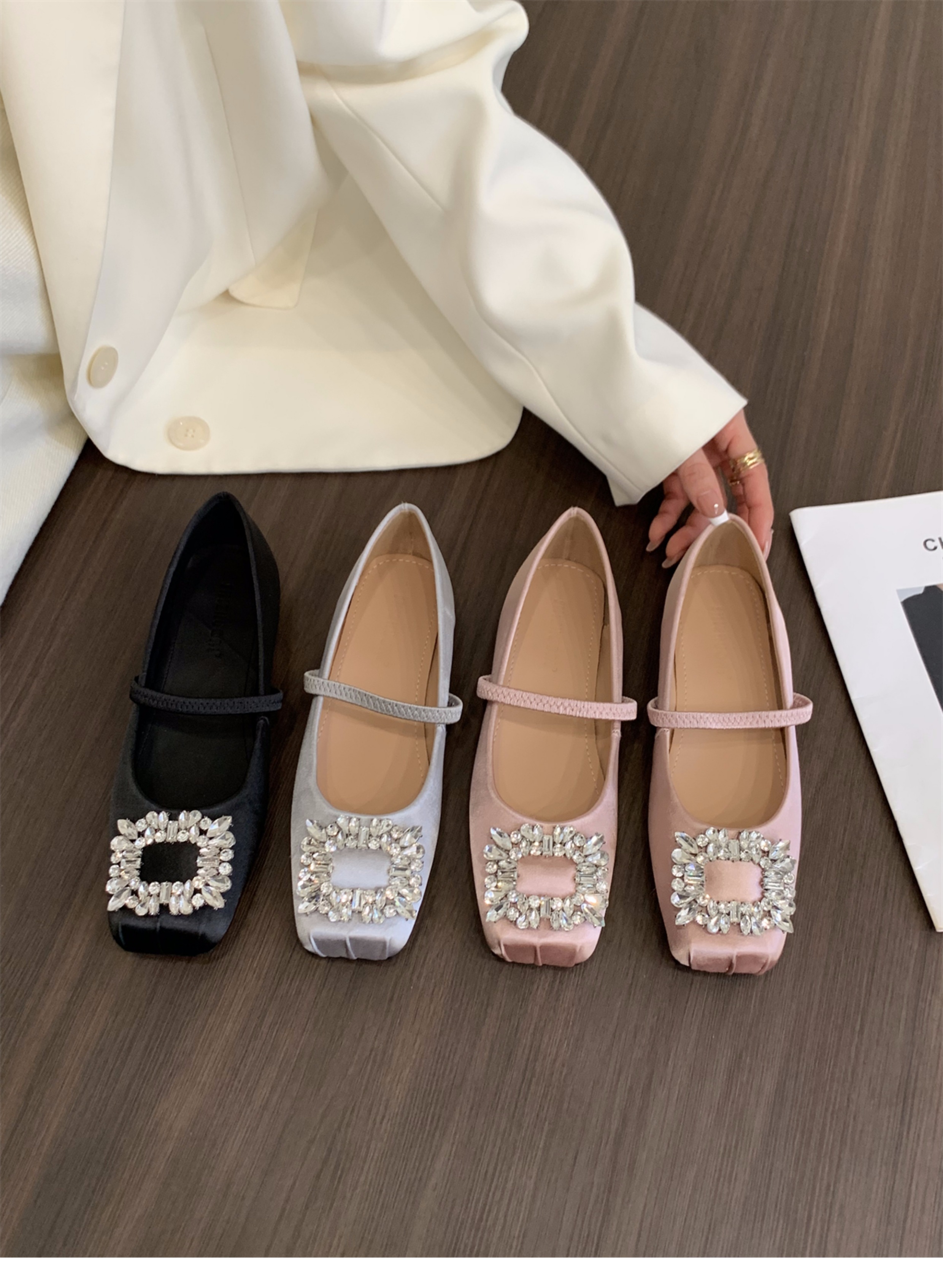 플랫 프렌치 스퀘어 토 라인스톤 신발 여성 신발 2025 새로운 봄 새틴 발레 메리 제인 이브닝 슈즈스토어 가기