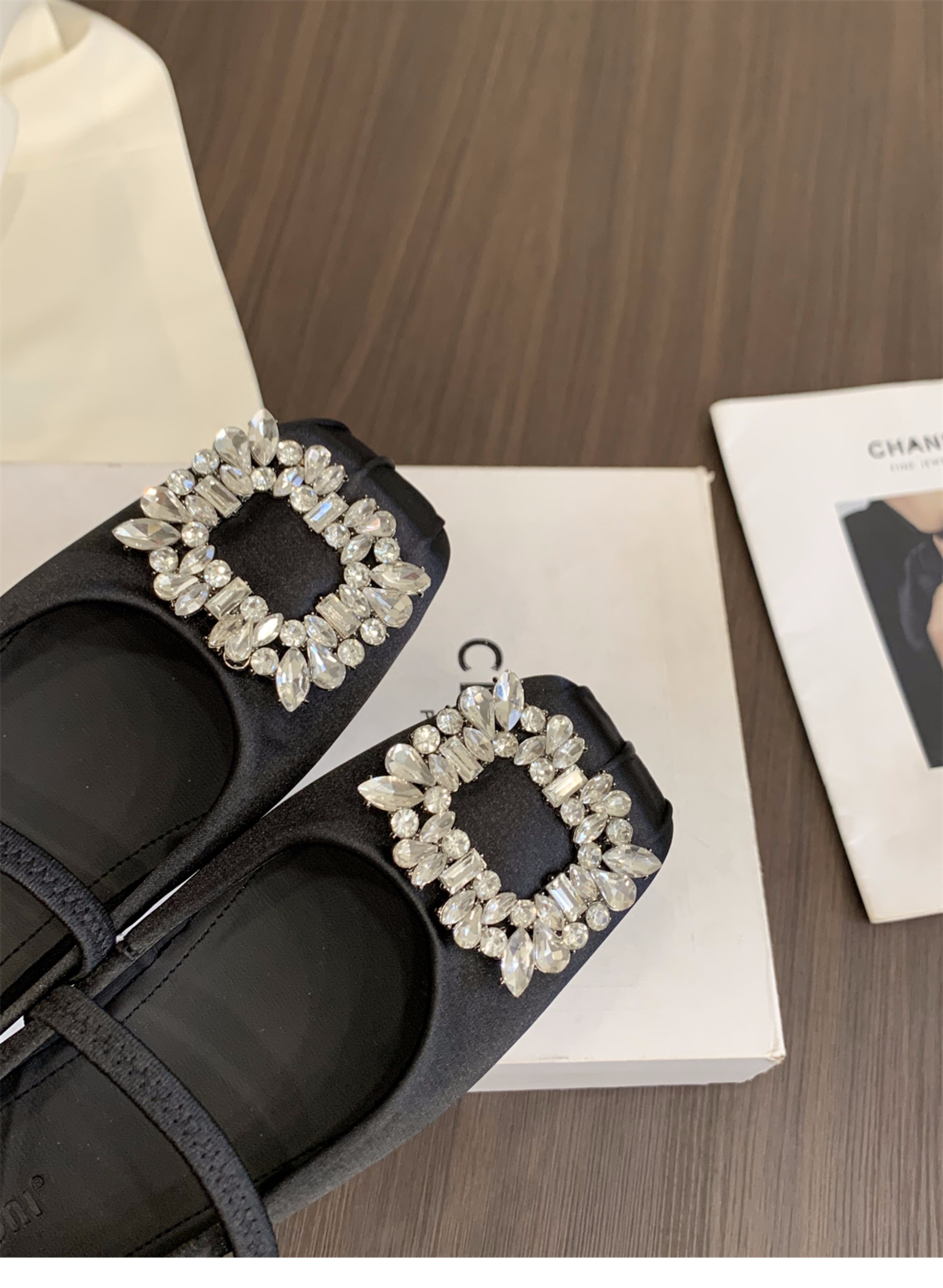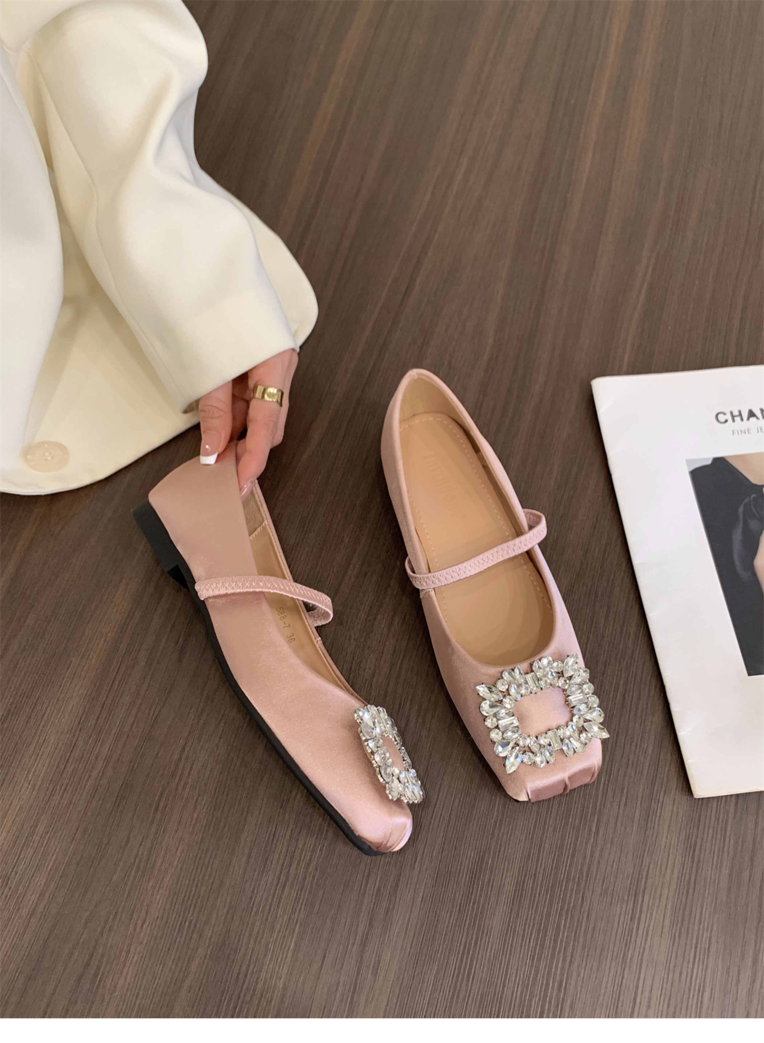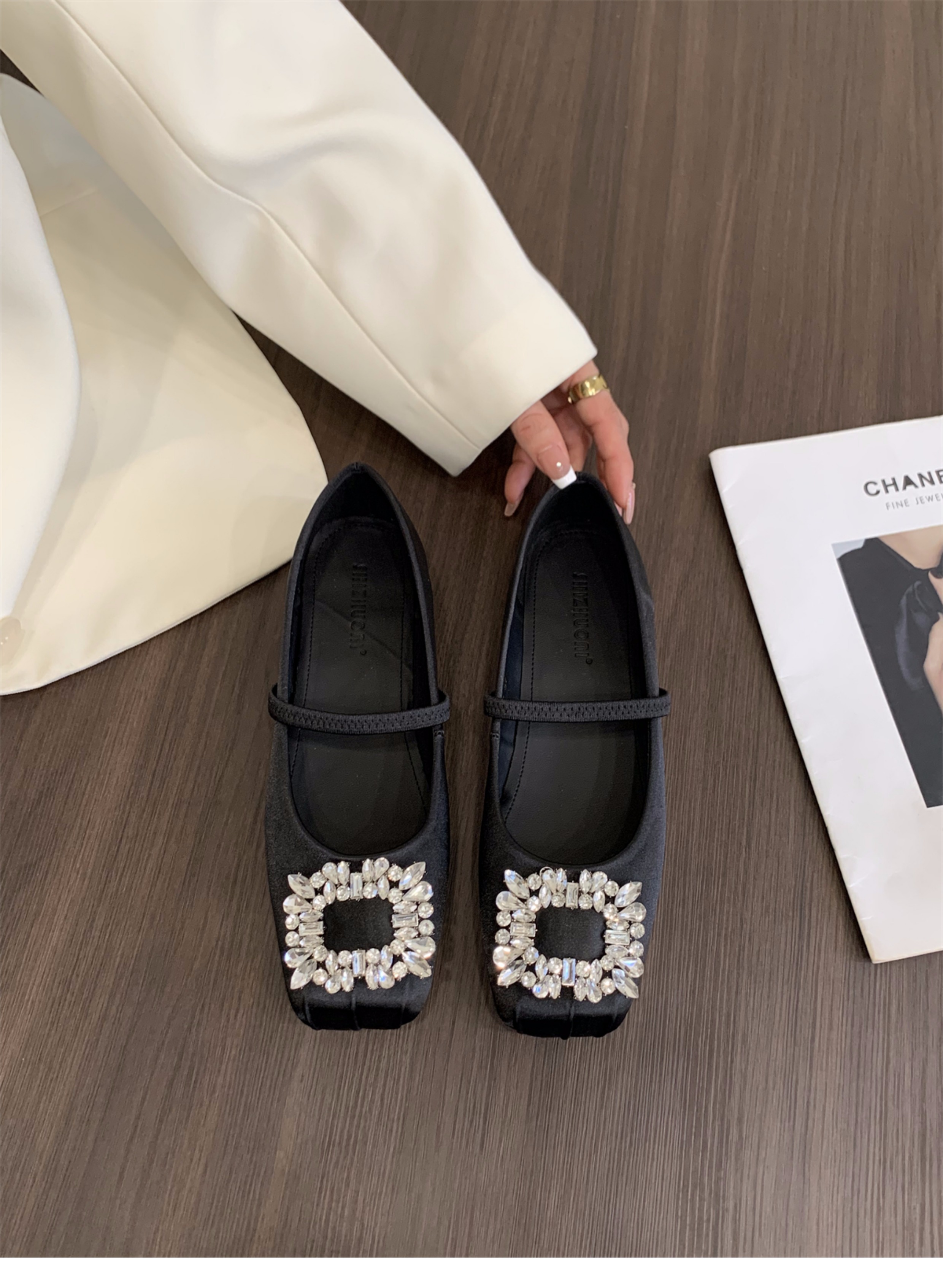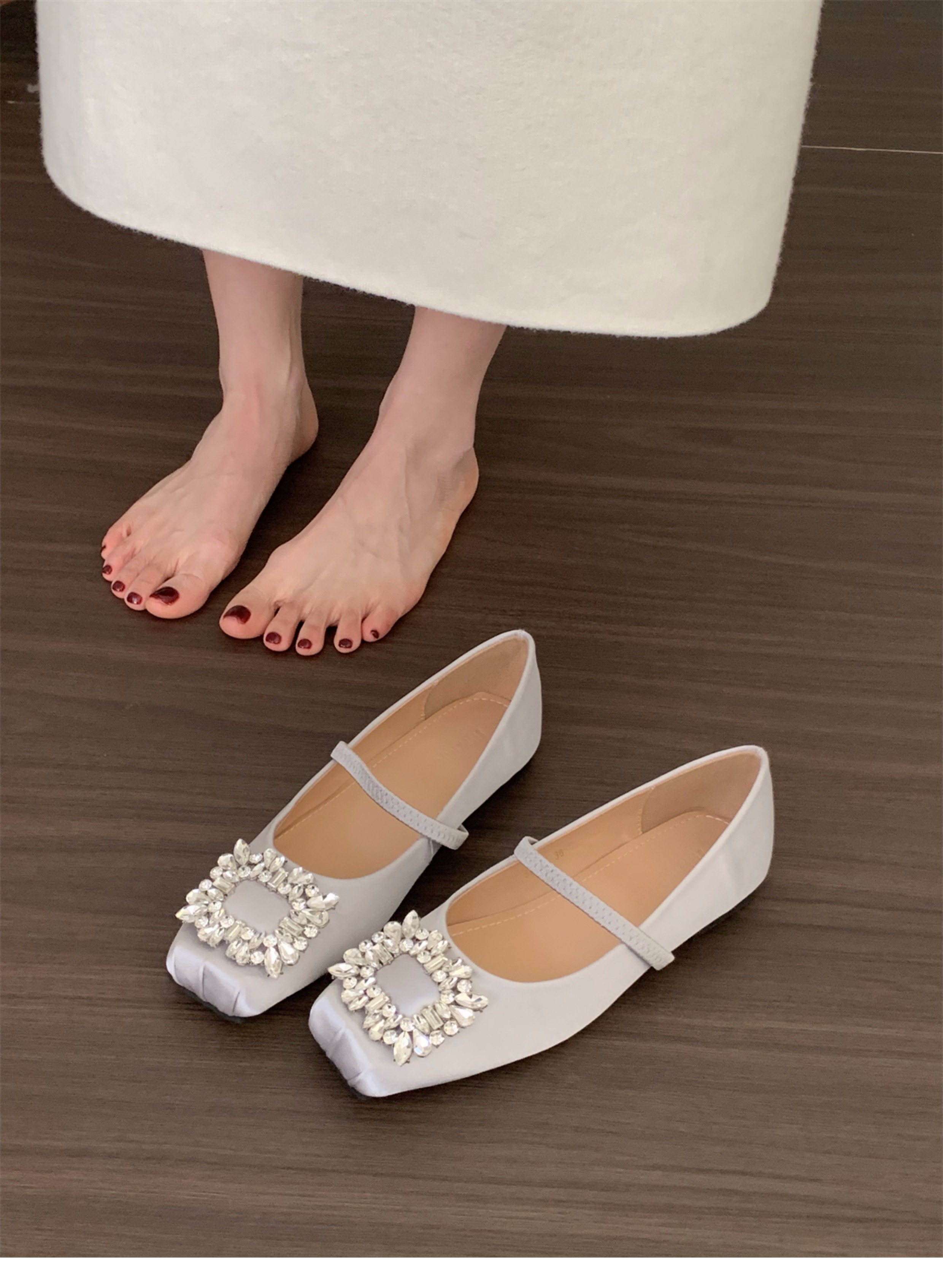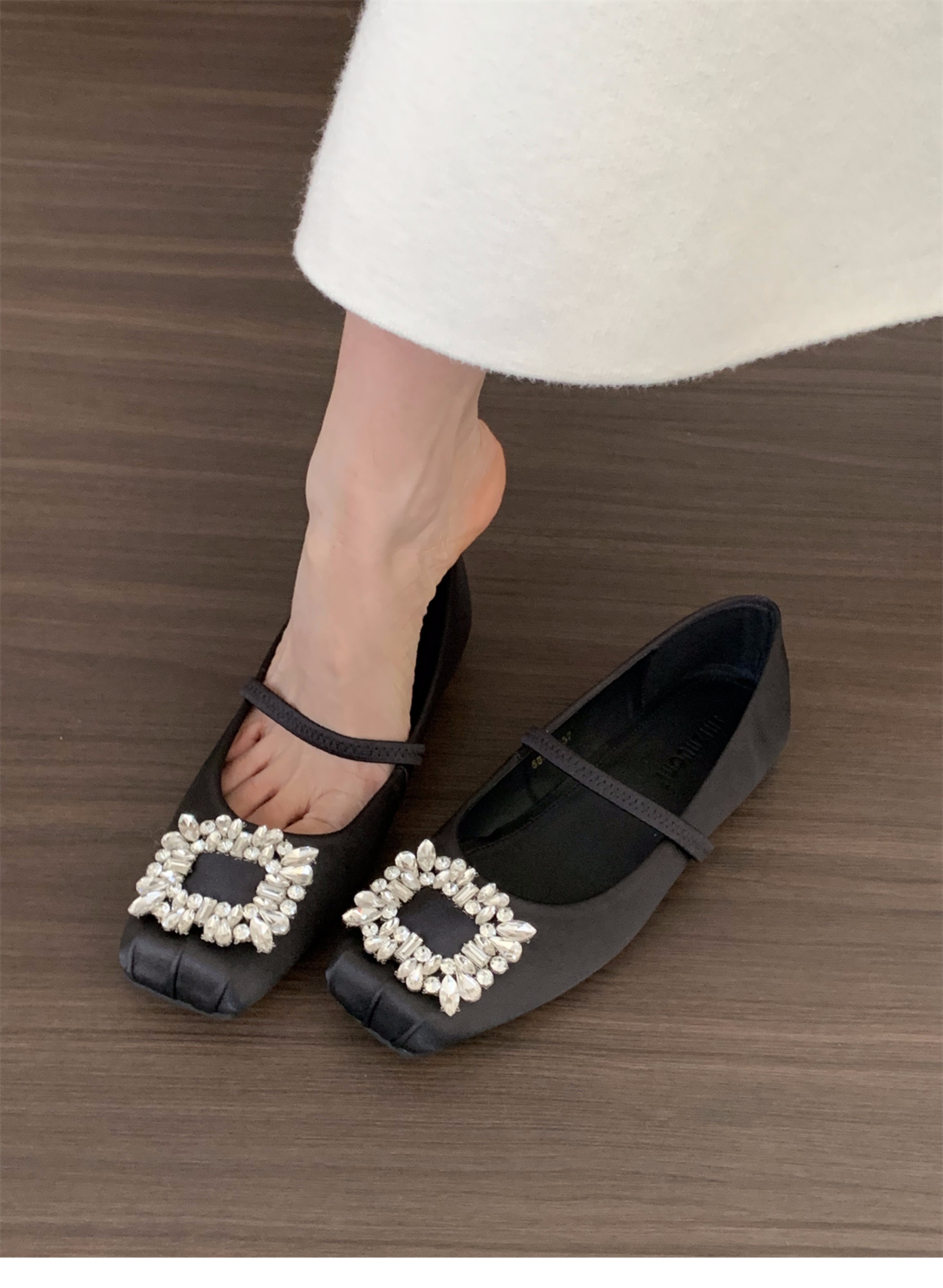 플랫 프렌치 스퀘어 토 라인스톤 신발 여성 신발 2025 새로운 봄 새틴 발레 메리 제인 이브닝 슈즈스토어 가기