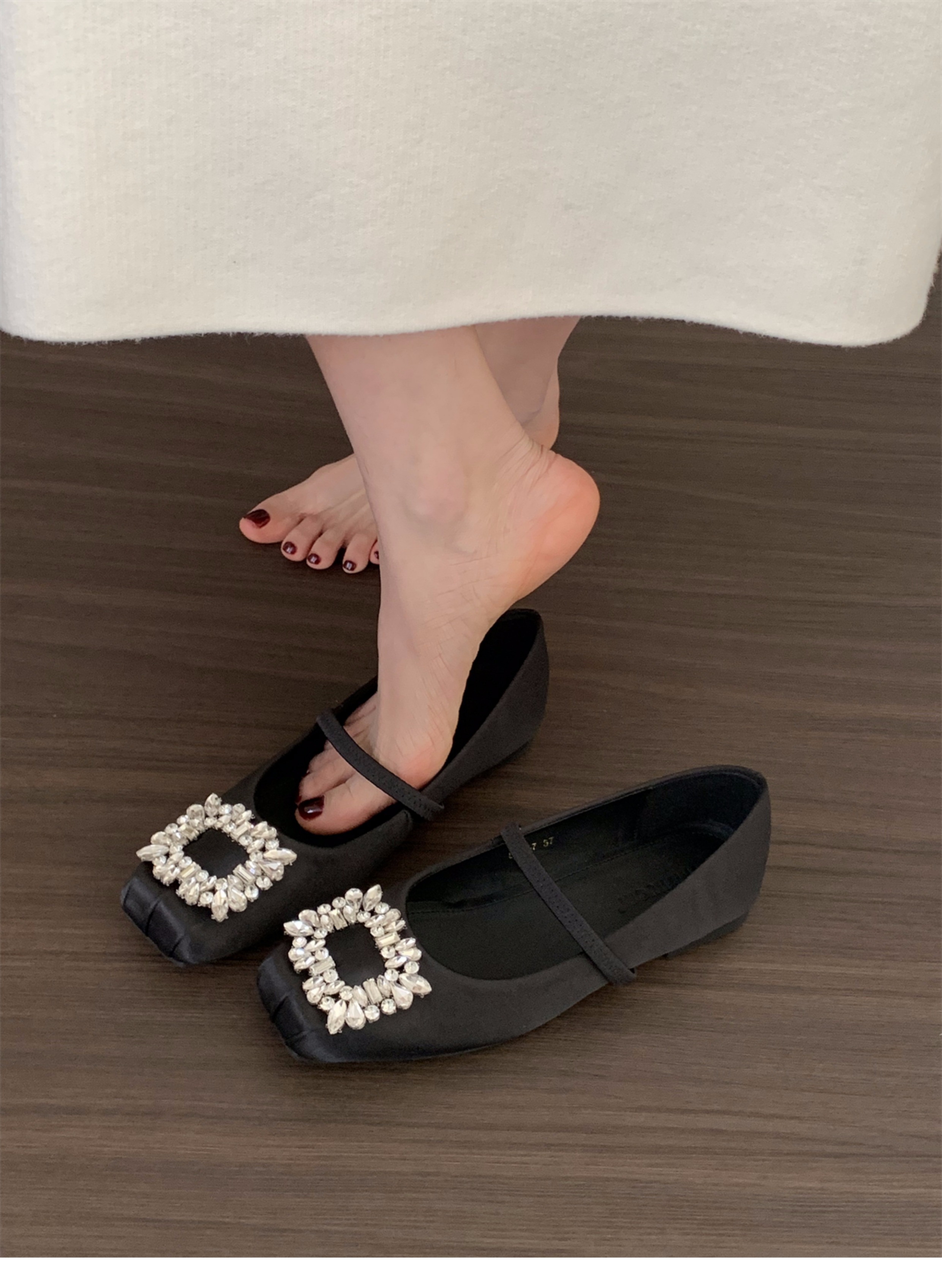 플랫 프렌치 스퀘어 토 라인스톤 신발 여성 신발 2025 새로운 봄 새틴 발레 메리 제인 이브닝 슈즈