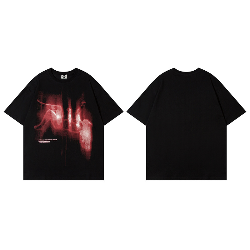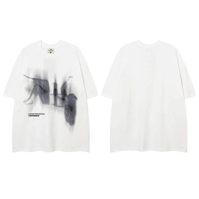 유럽과 미국의 인기있는 떨어지는 그림 인쇄 디자인 센스 오버 사이즈 어깨 드롭 느슨한 둥근 목 티셔츠 코튼 인 짧은 소매 남성