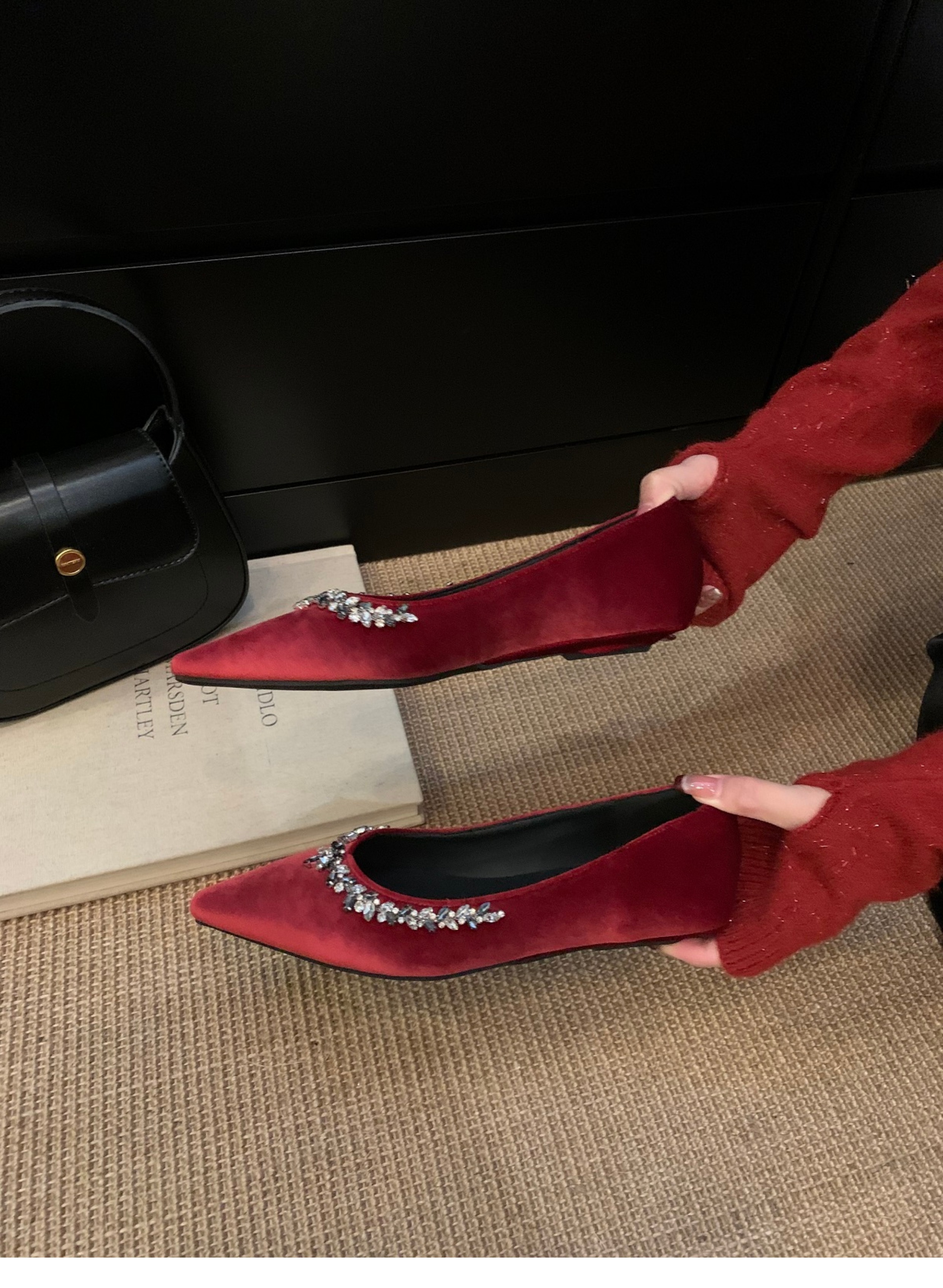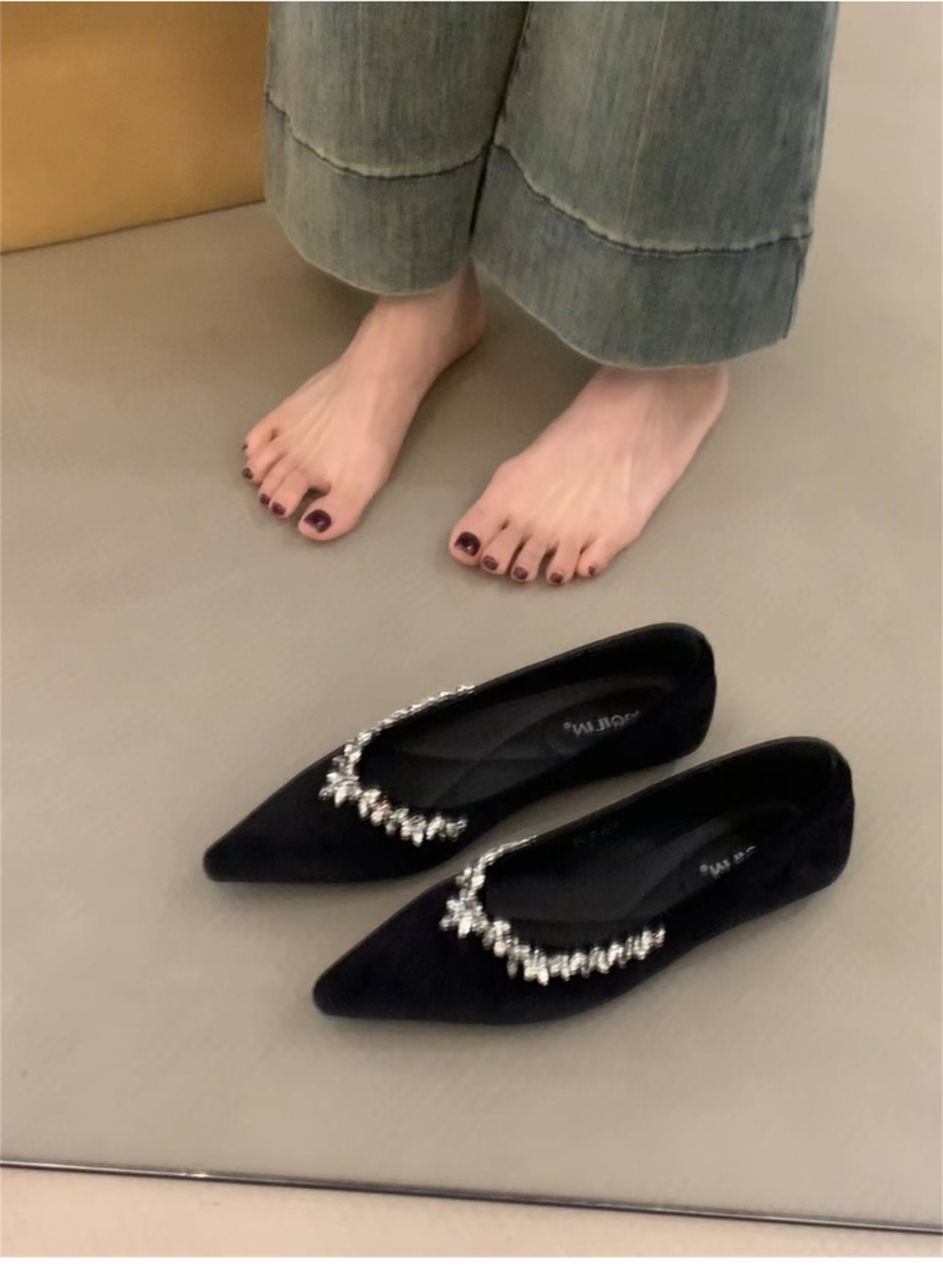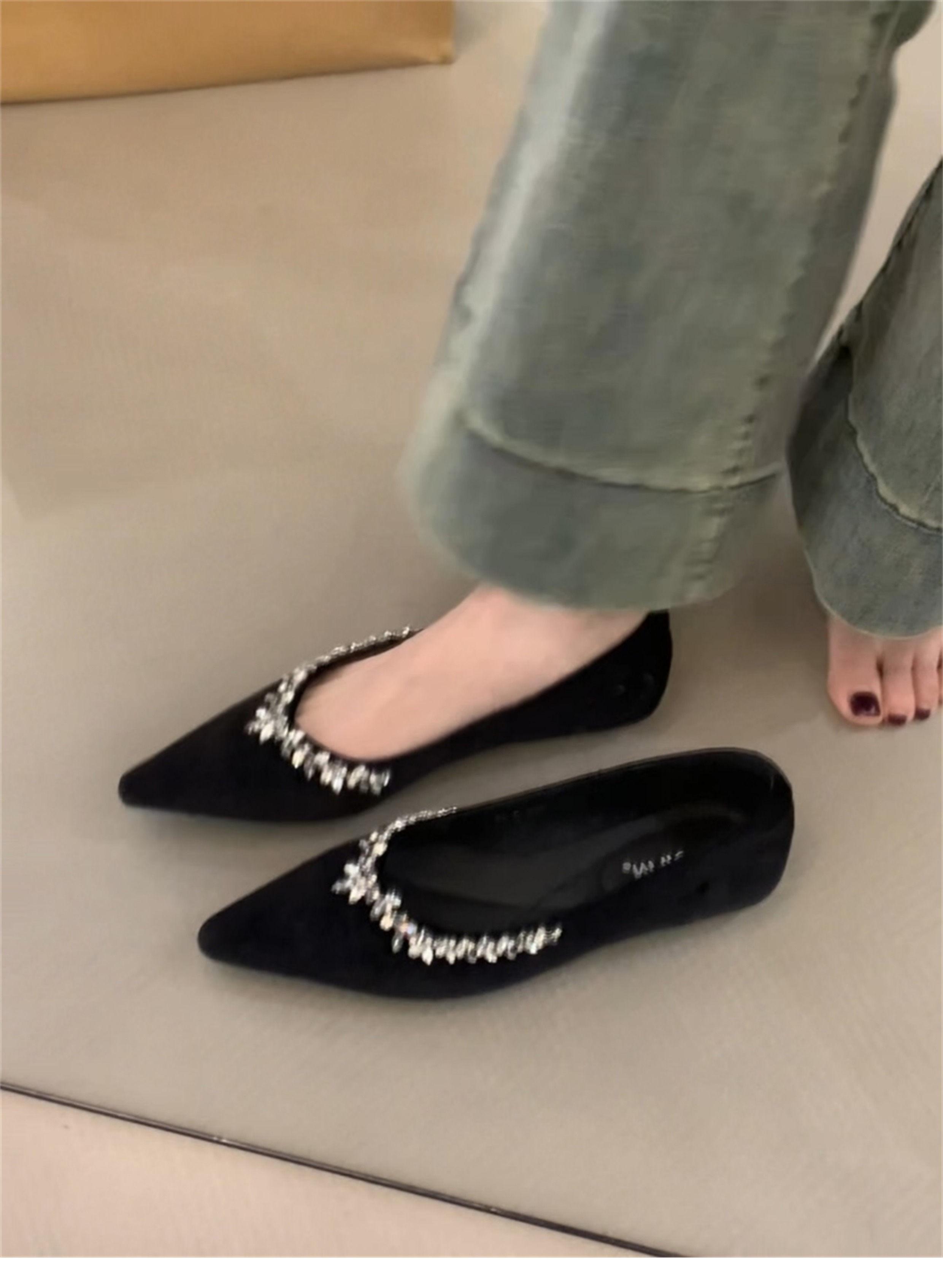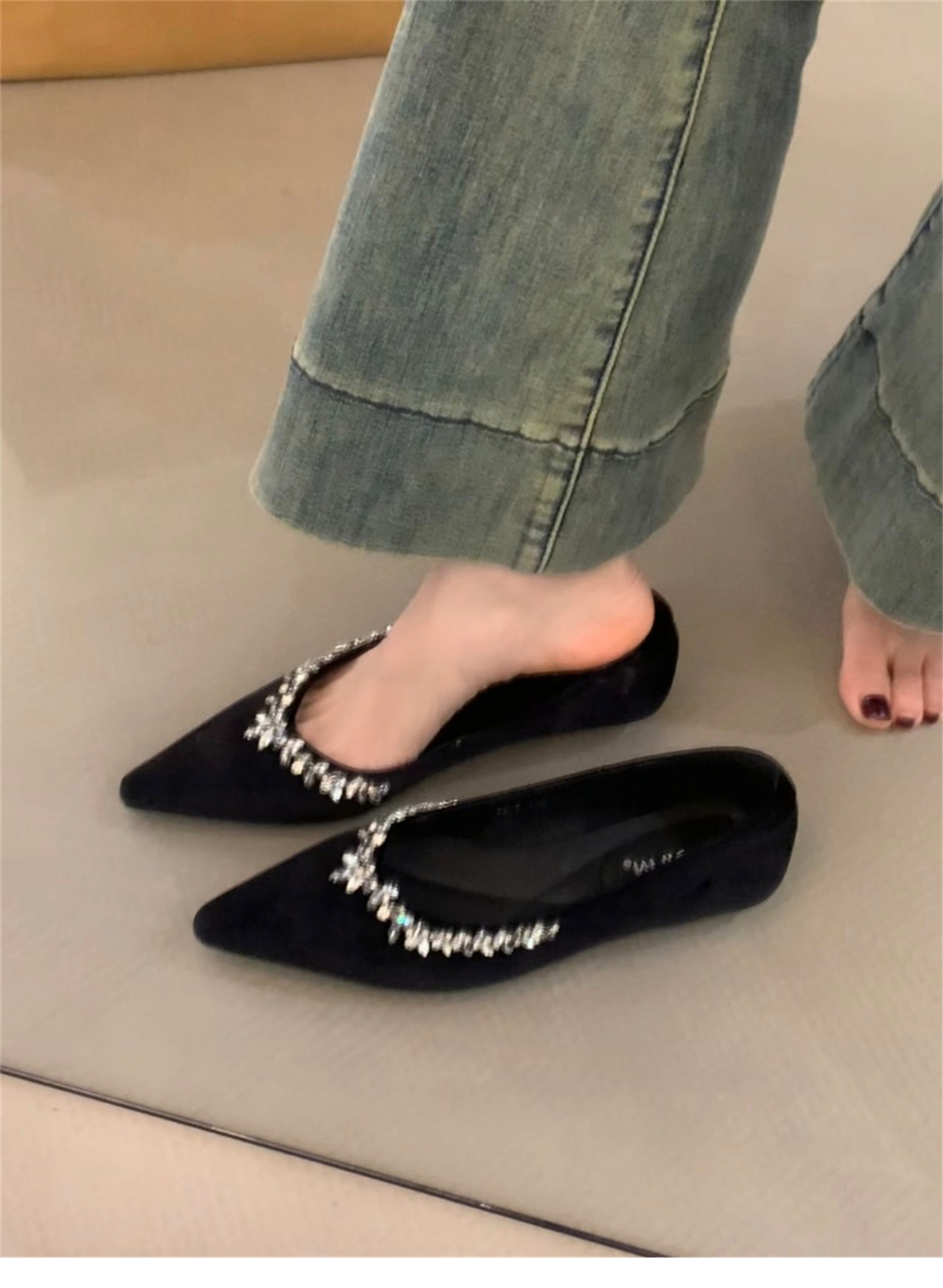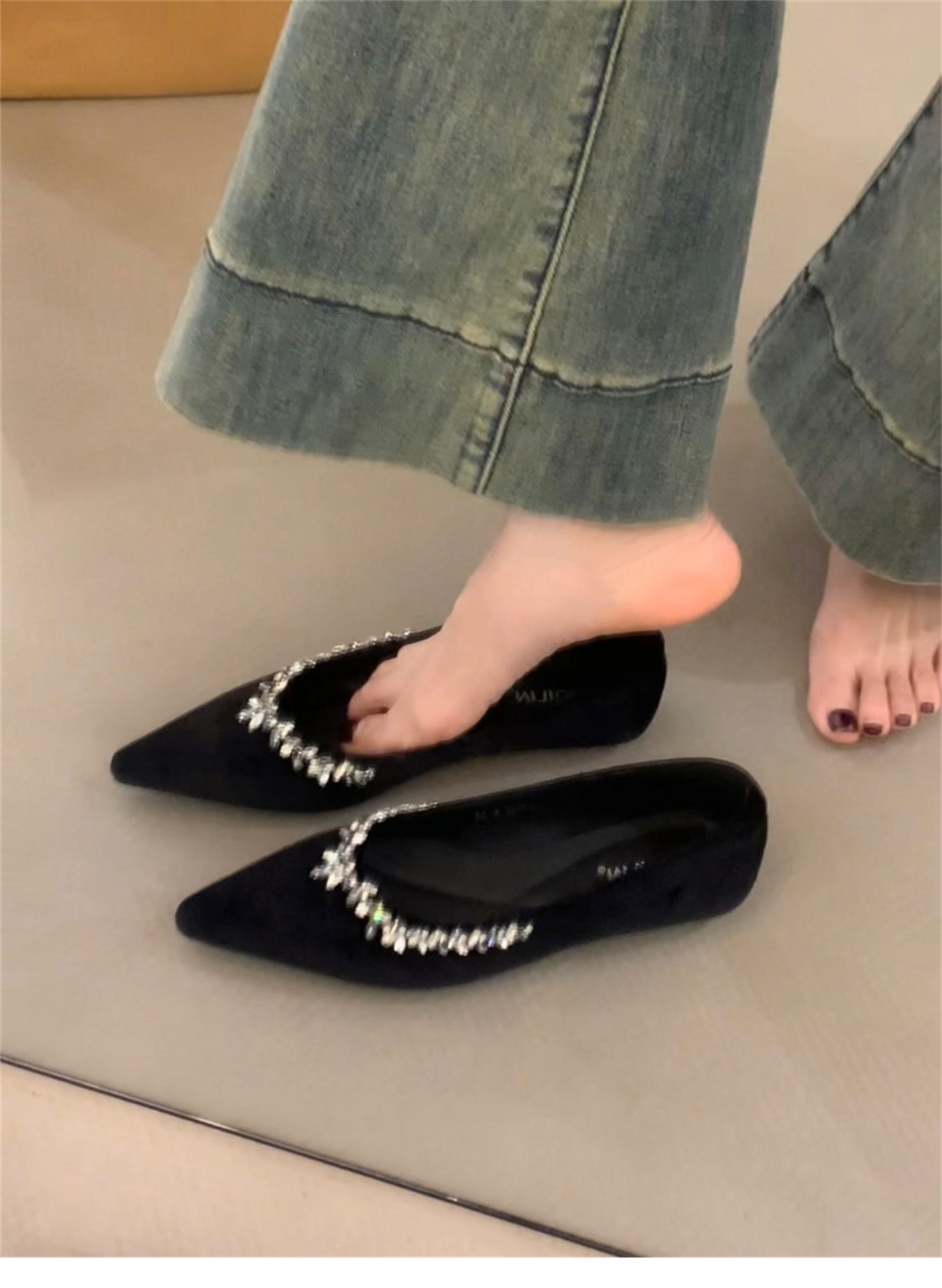 프랑스 로우 힐 뾰족한 스웨이드 모조 다이아몬드 신발 여성 신발 2025 새 봄 우아한 부드러운 바닥 검은 통근 신발