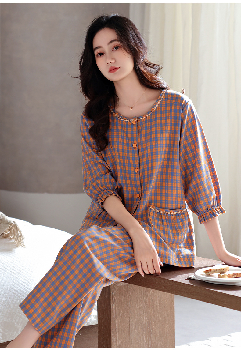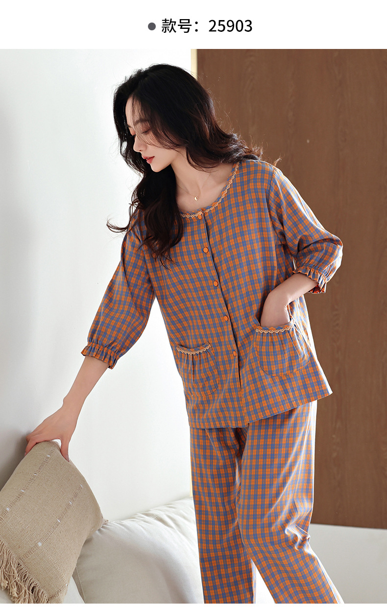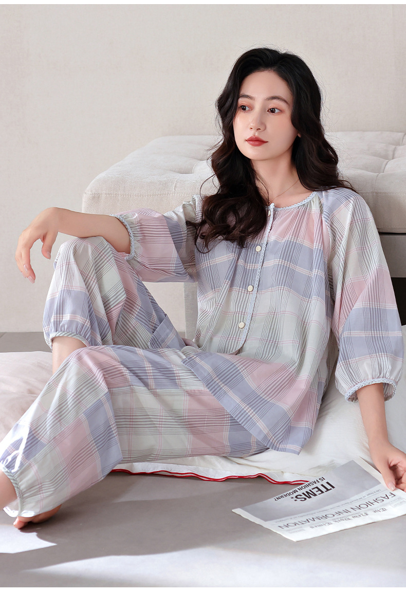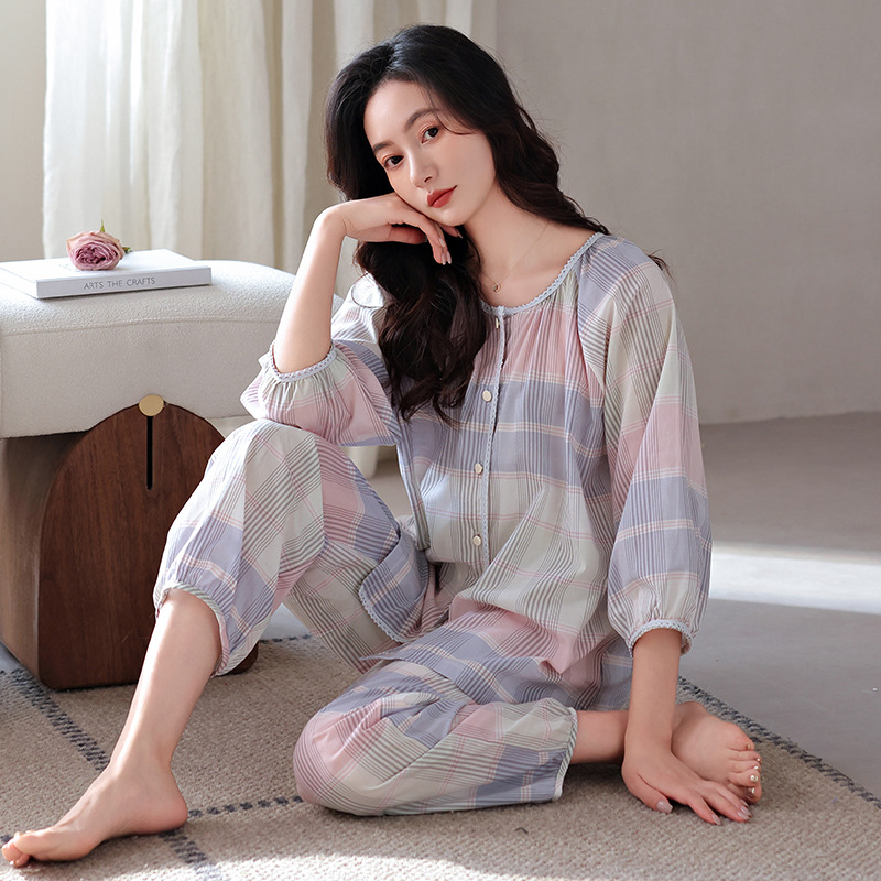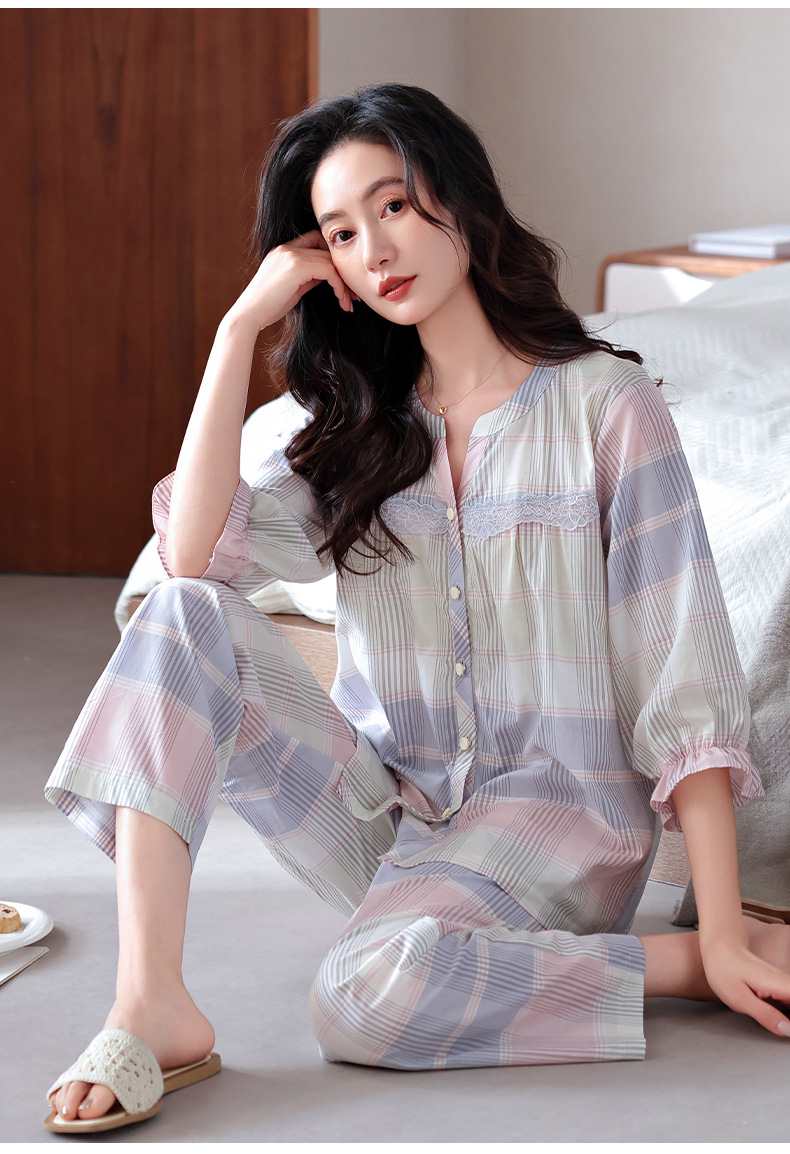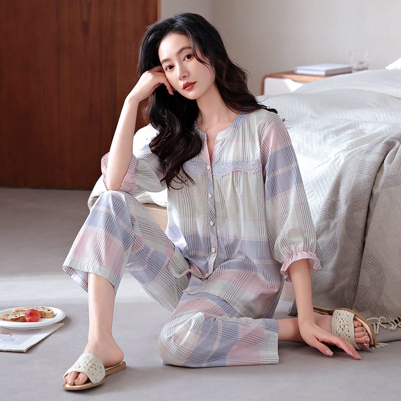 잠옷 여성의 봄과 가을 짠 순면 7 점 소매 가을 면 얇은 중년 어머니 여름 플러스 사이즈 홈 옷스토어 가기
