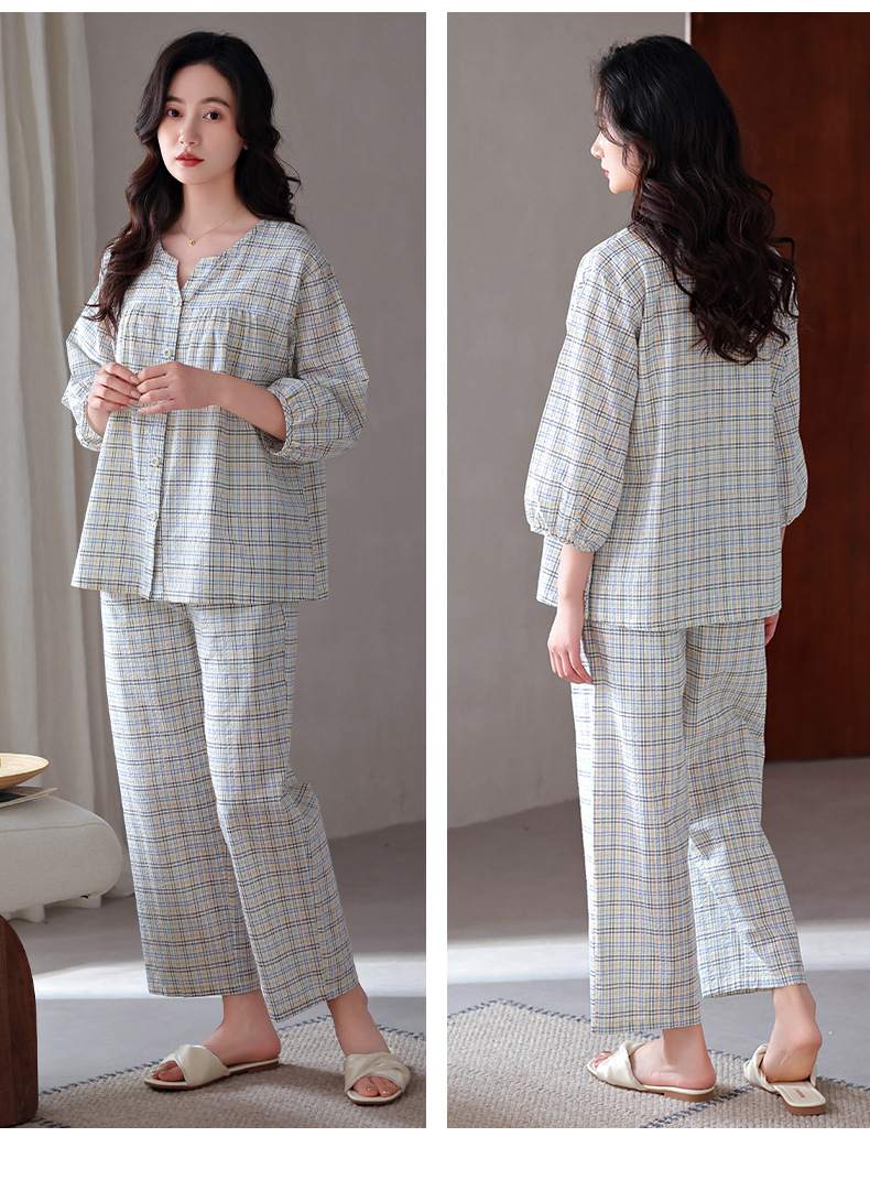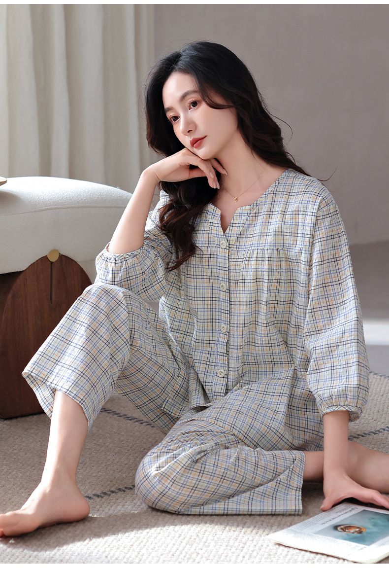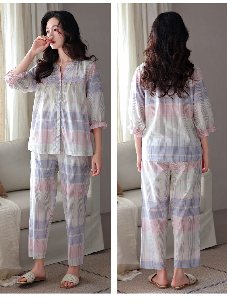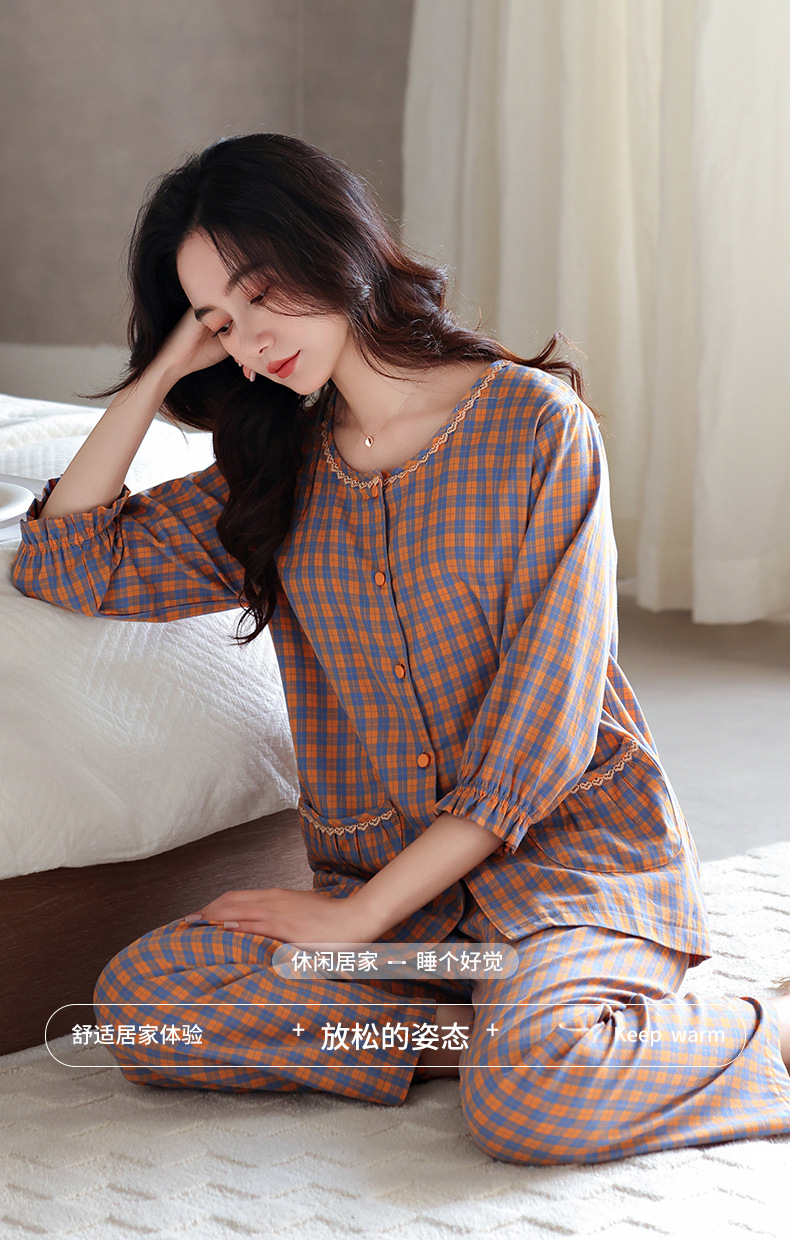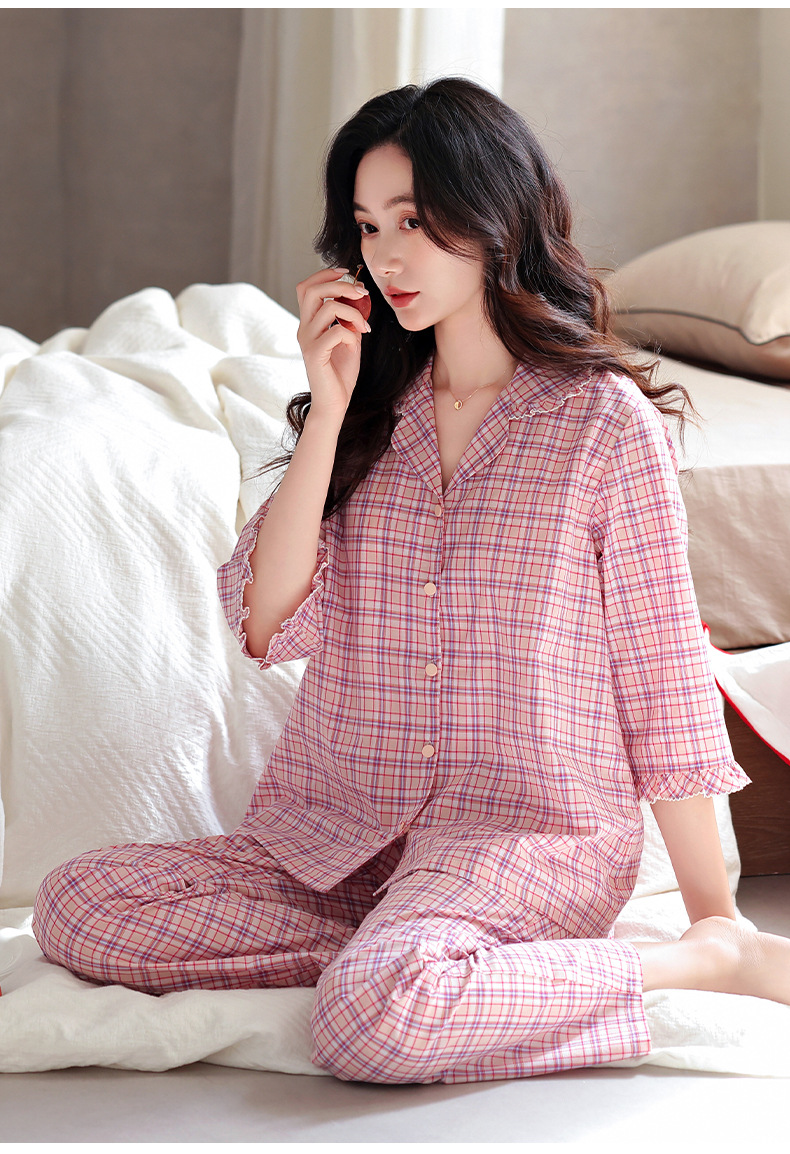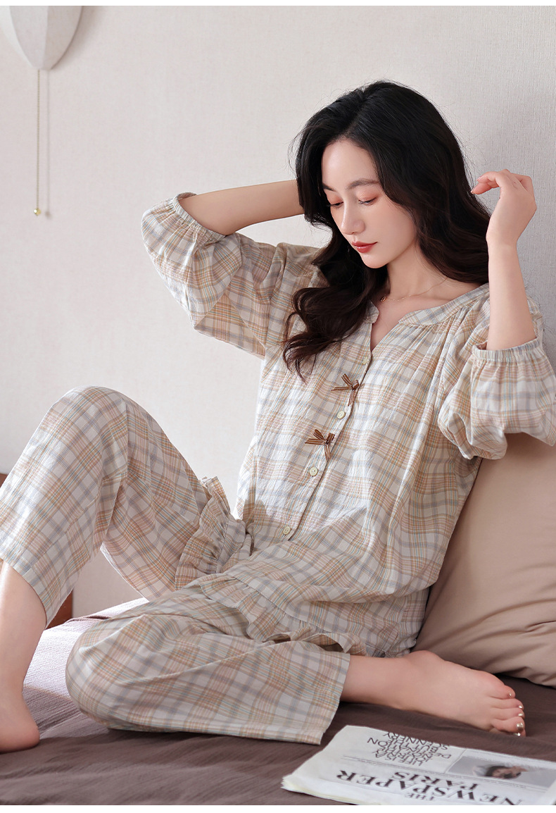 잠옷 여성의 봄과 가을 짠 순면 7 점 소매 가을 면 얇은 중년 어머니 여름 플러스 사이즈 홈 옷스토어 가기