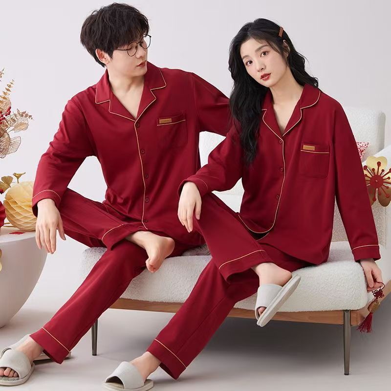 신혼 커플 잠옷 봄과 가을 순수 코튼 긴팔 빅 레드 축제 웨딩 부르고뉴 코튼 홈웨어스토어 가기
