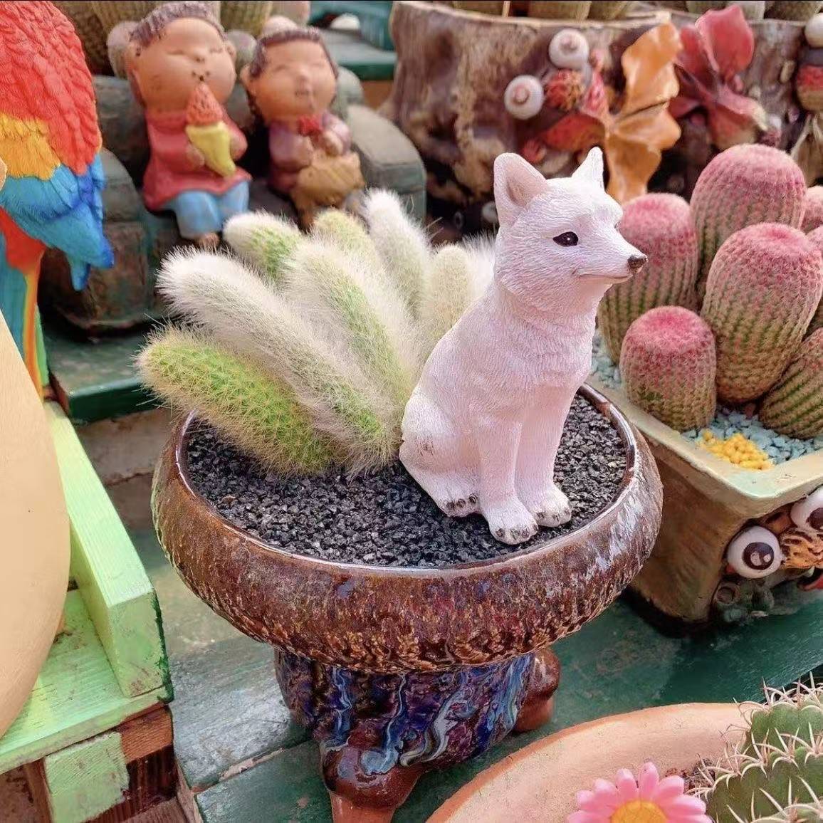 국경 간 정원 아홉 꼬리 여우 다육 장식 고양이 새 피더 수지 장식품 공예 새 마시는 물 장식품