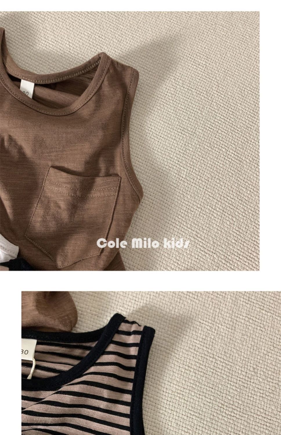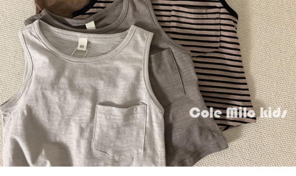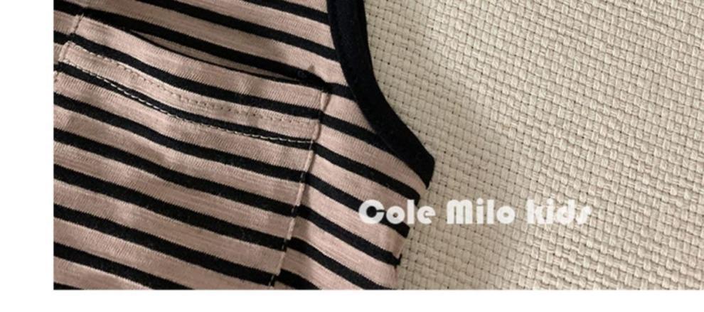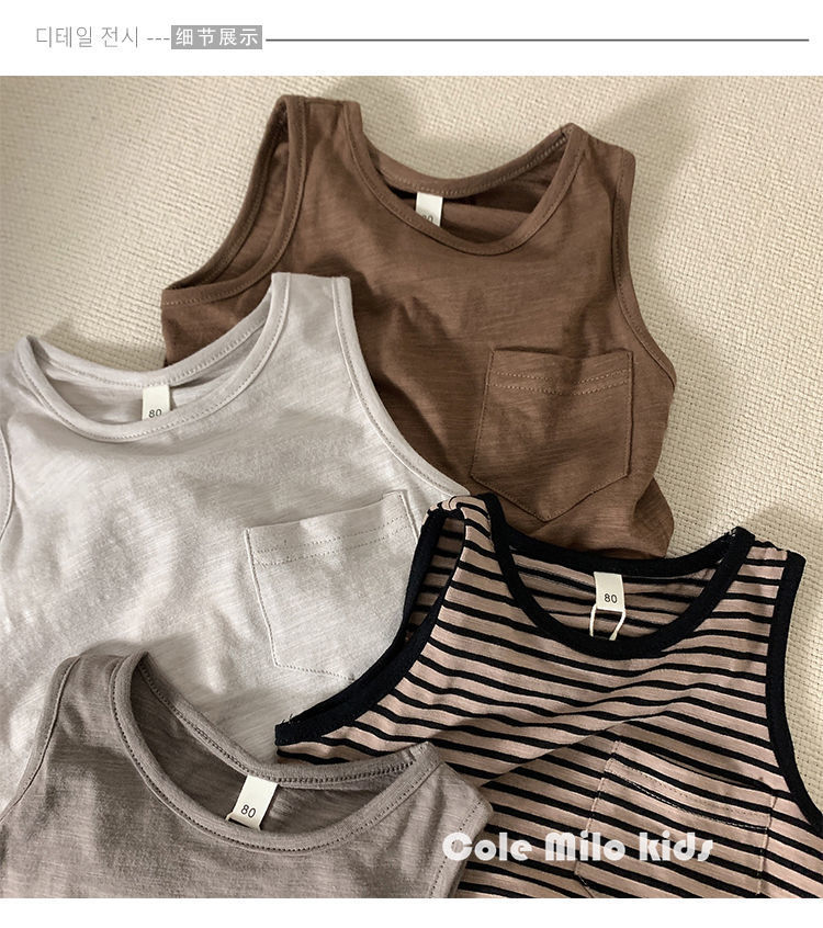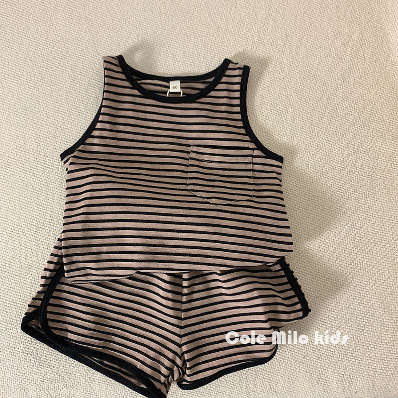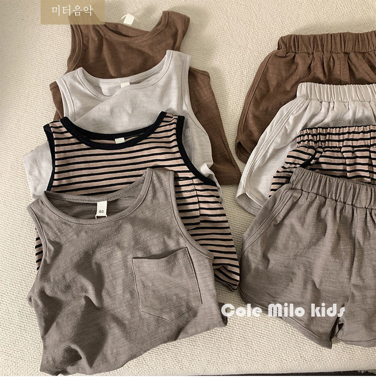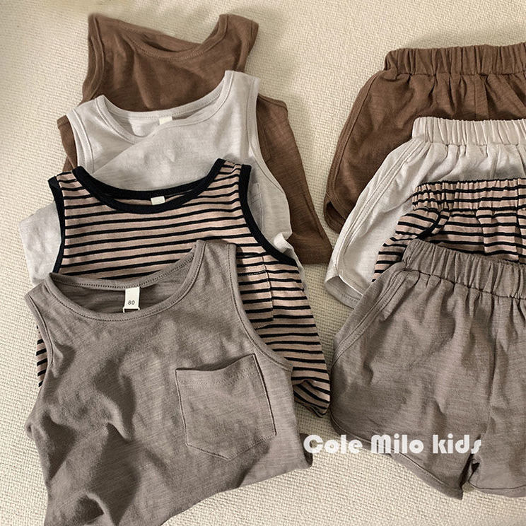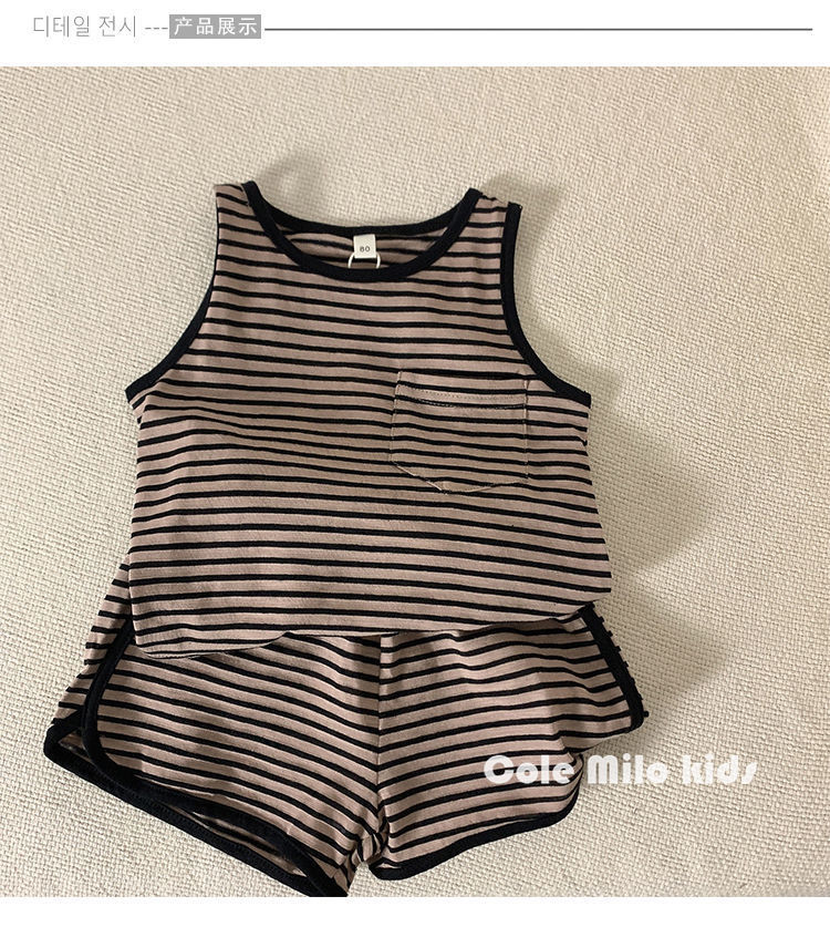 여름 어린이 조끼 민소매 소년 소녀 반팔 티셔츠 얇은 통기성 스트라이프 탑 바지 세트 투피스 세트스토어 가기
