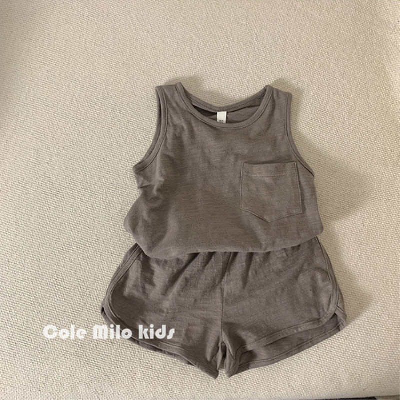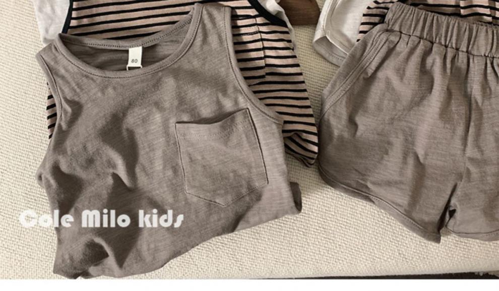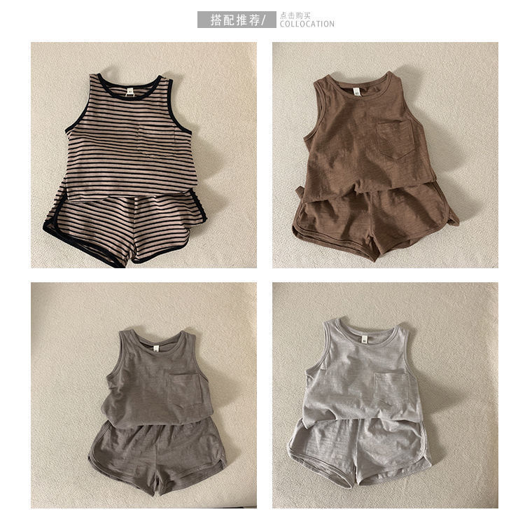 여름 어린이 조끼 민소매 소년 소녀 반팔 티셔츠 얇은 통기성 스트라이프 탑 바지 세트 투피스 세트