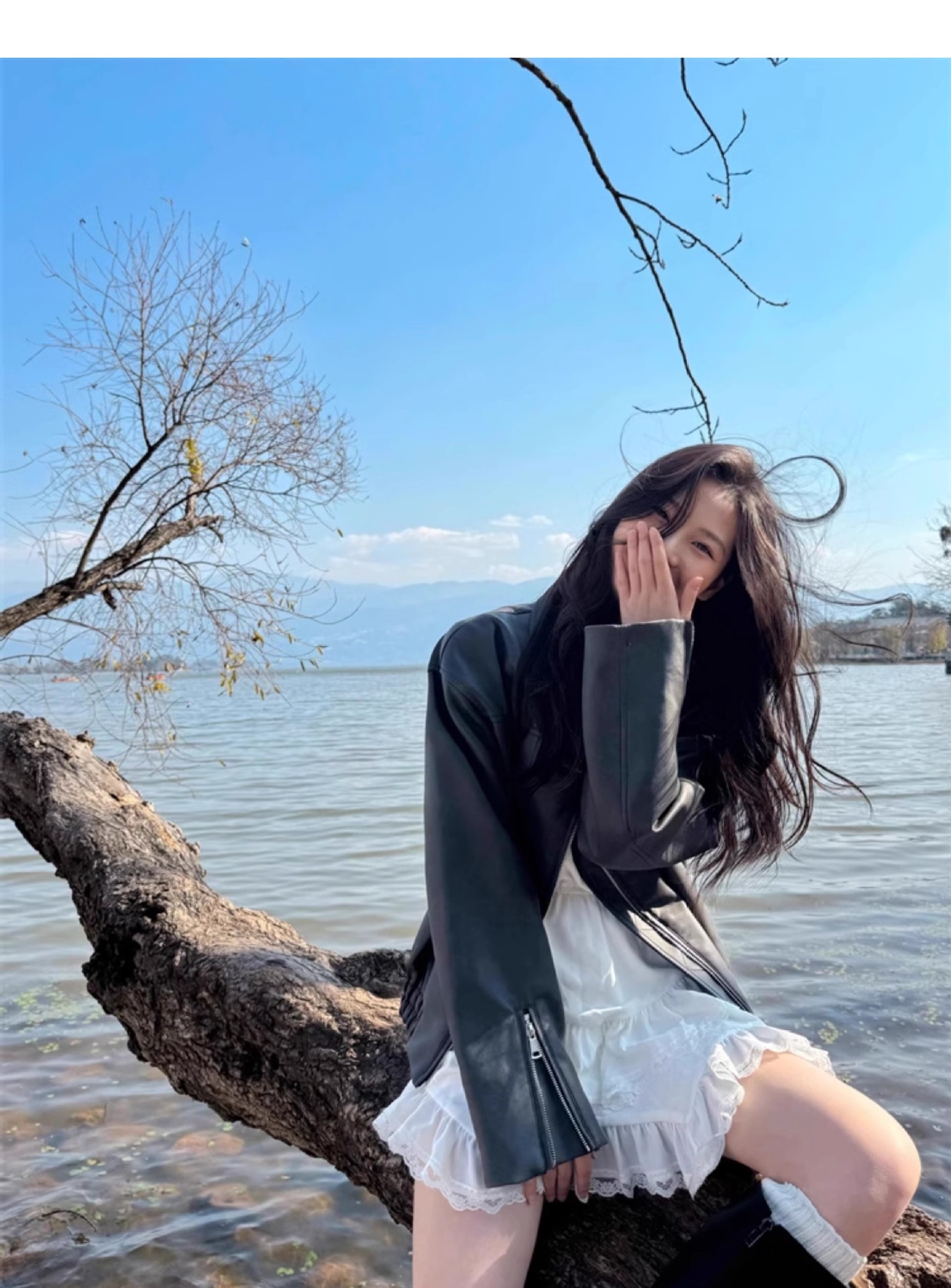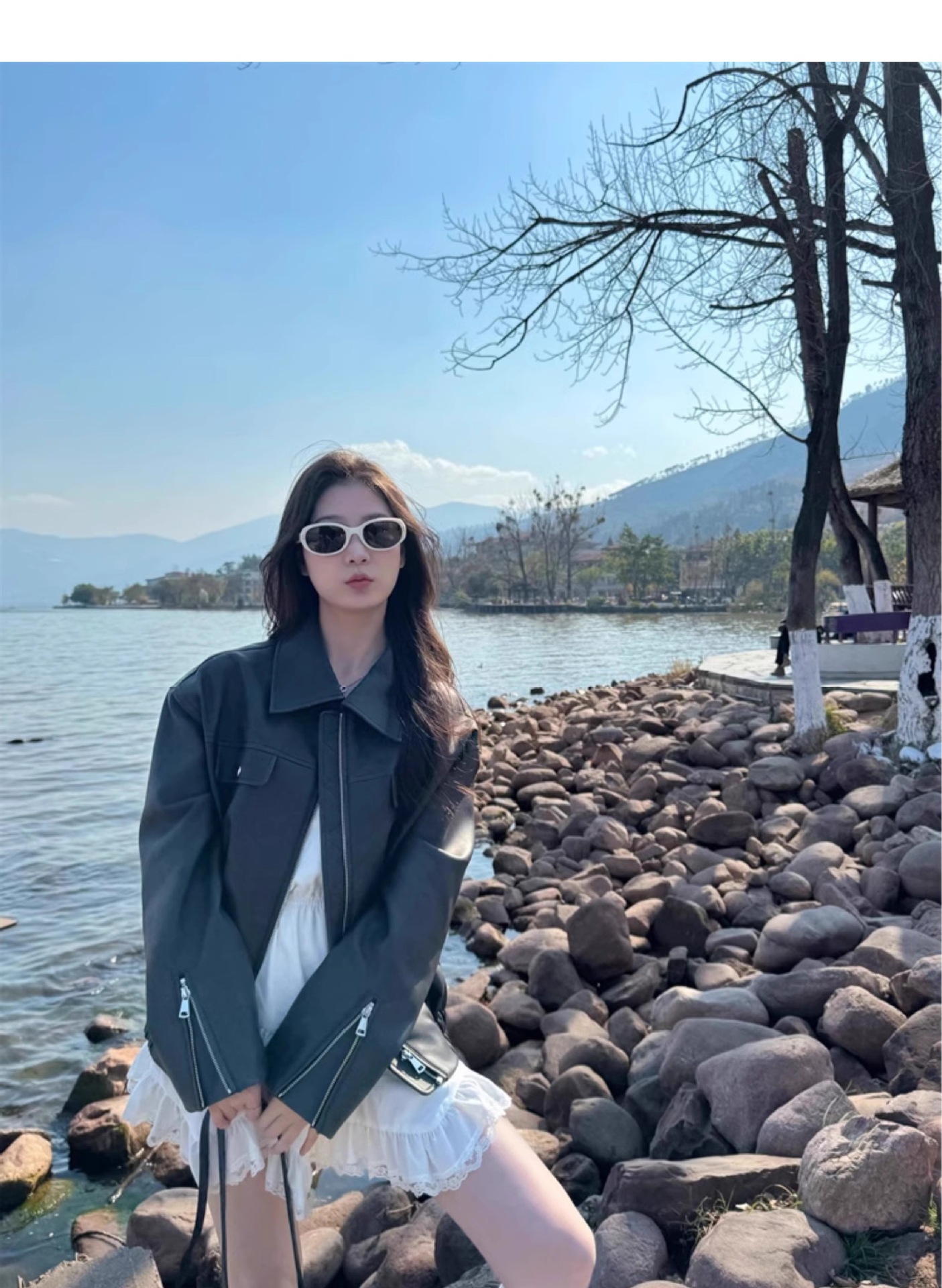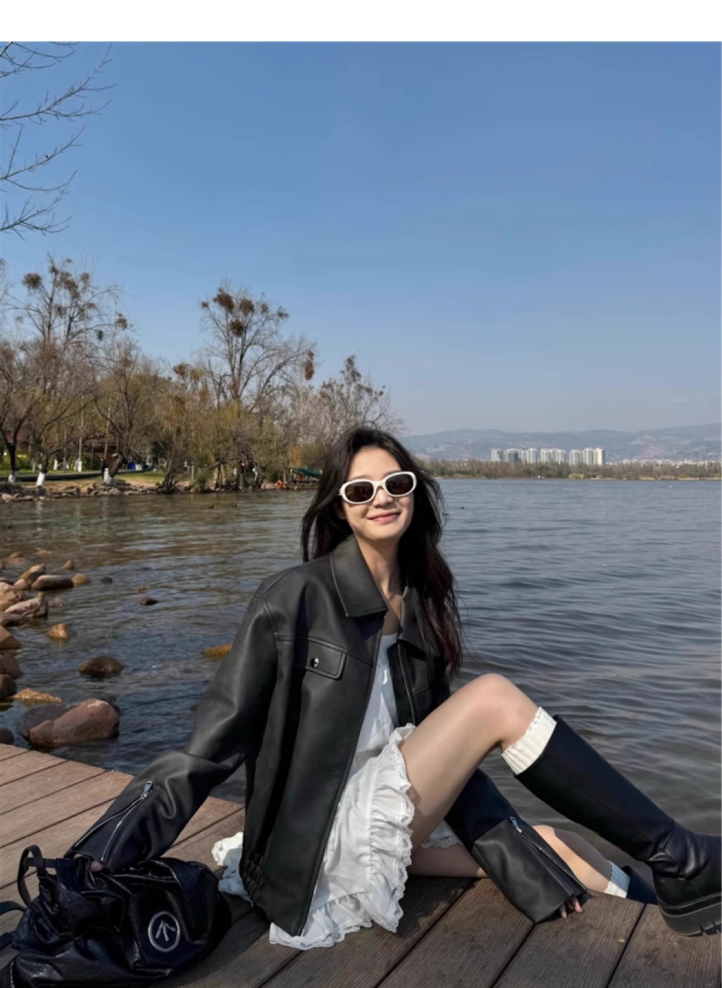 [재고] 2025 봄 가을 미국 레트로 다크 브라운 가죽 자켓 올드 머니 윈드 재킷 여성 마일라드웨어