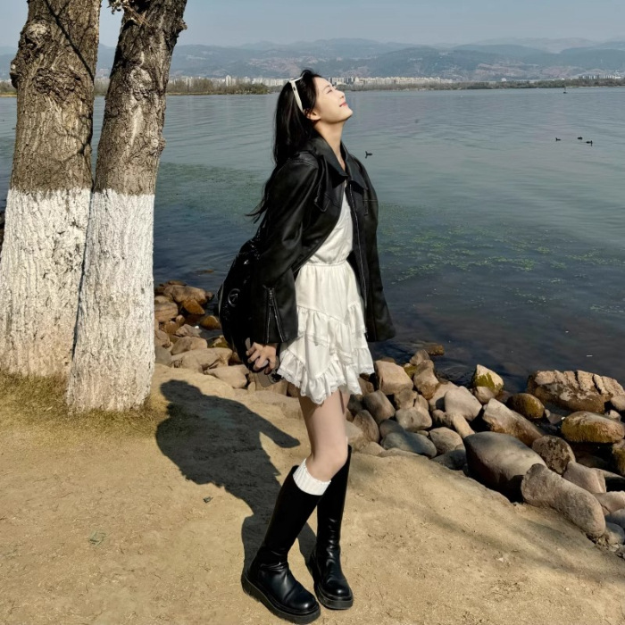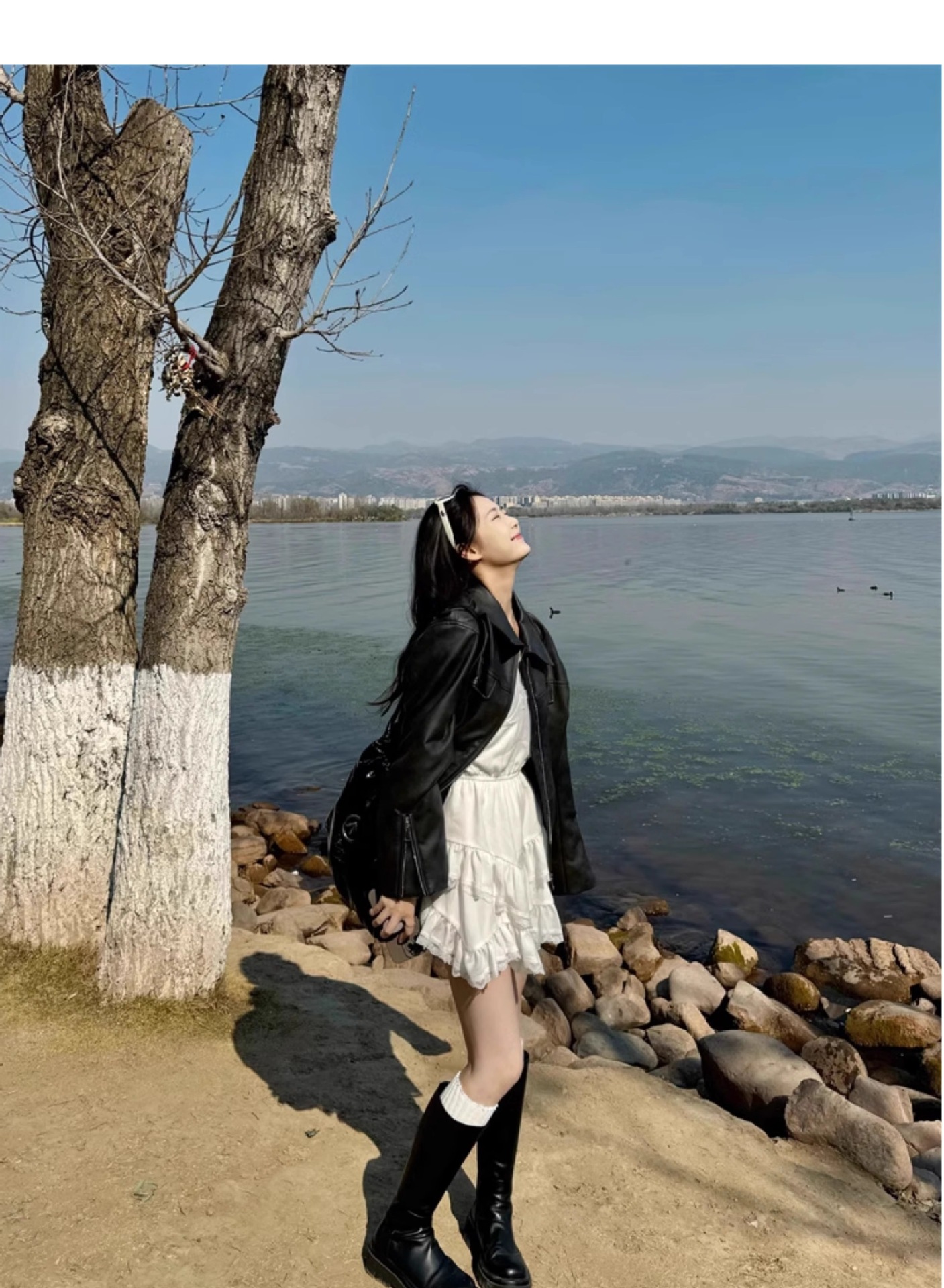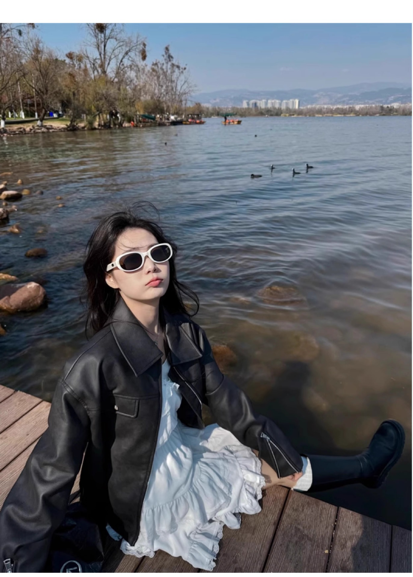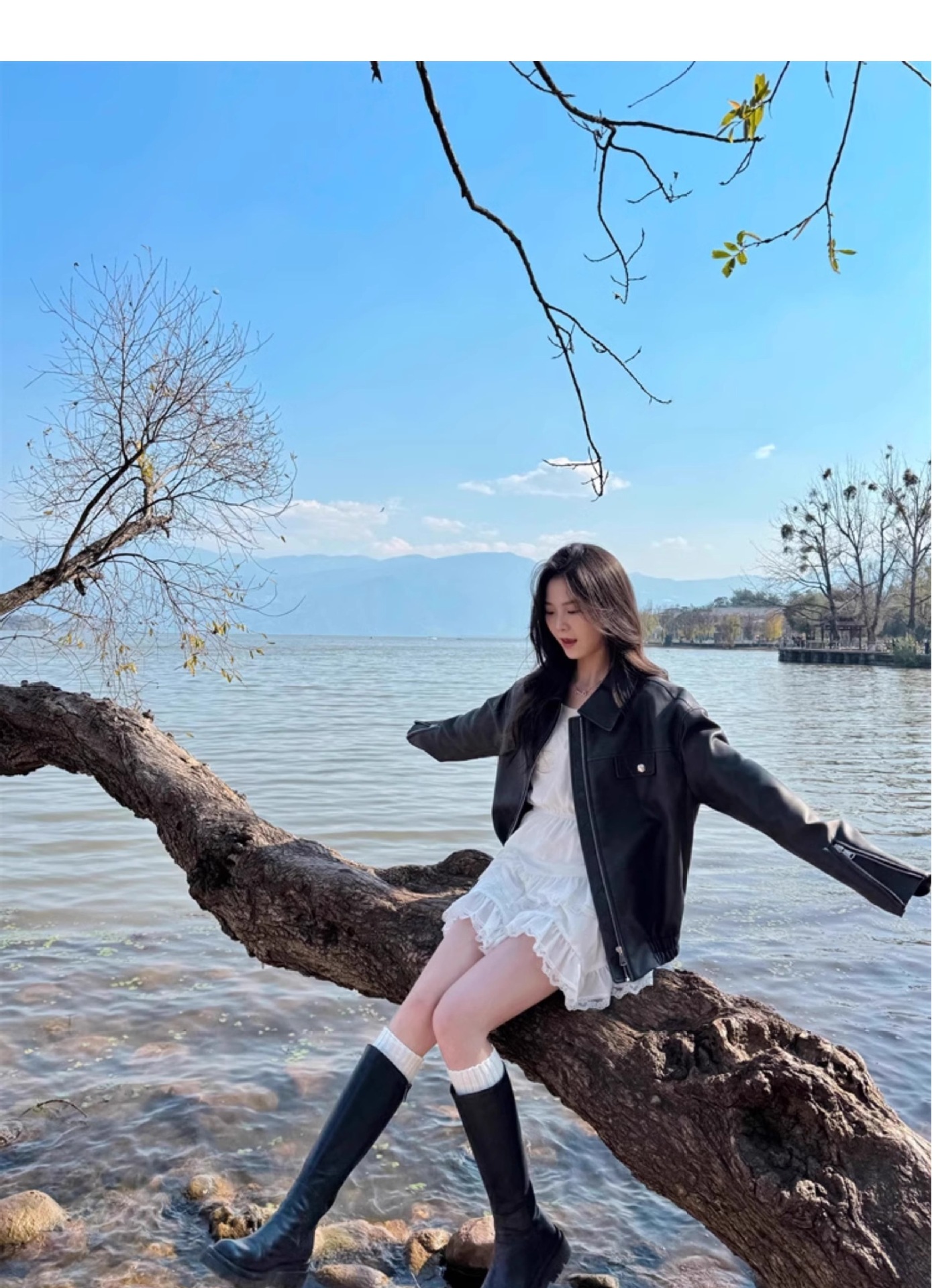 [재고] 2025 봄 가을 미국 레트로 다크 브라운 가죽 자켓 올드 머니 윈드 재킷 여성 마일라드웨어