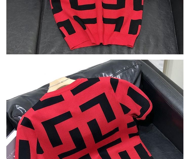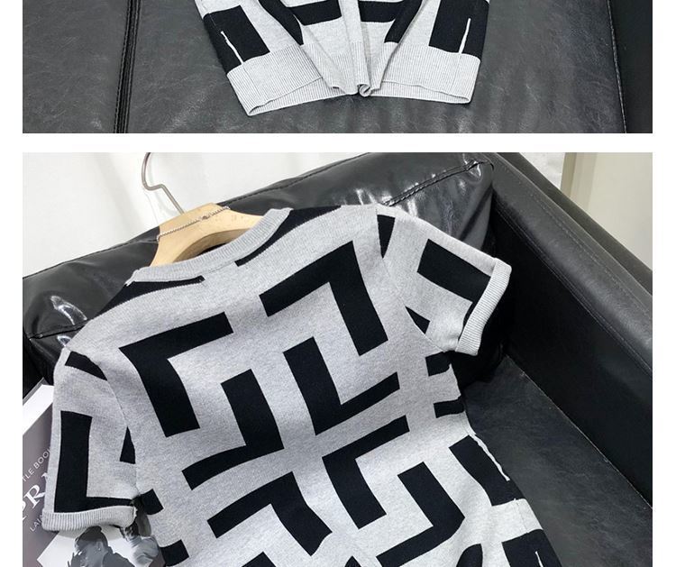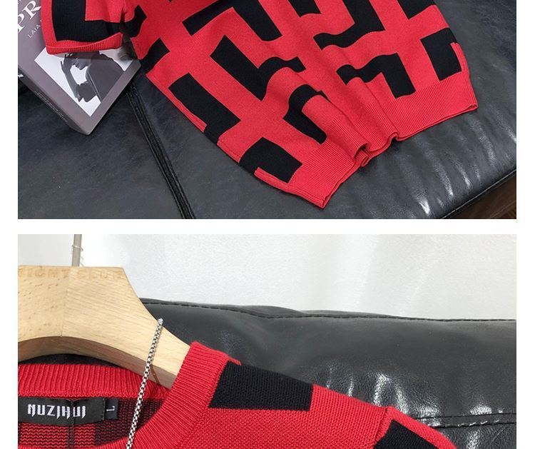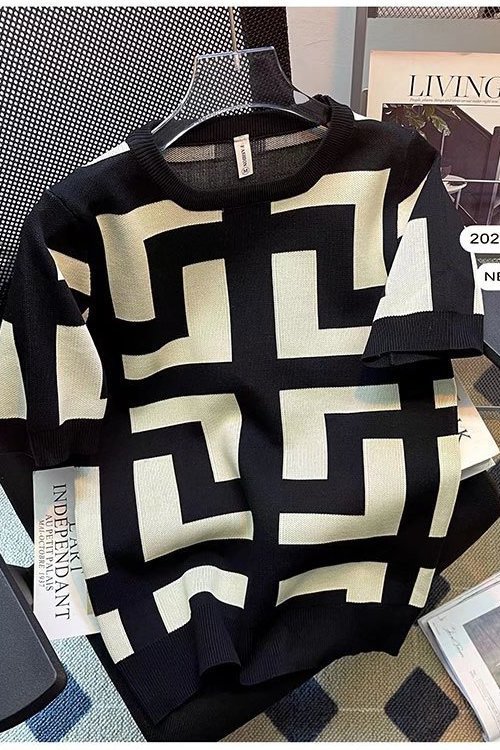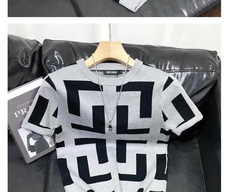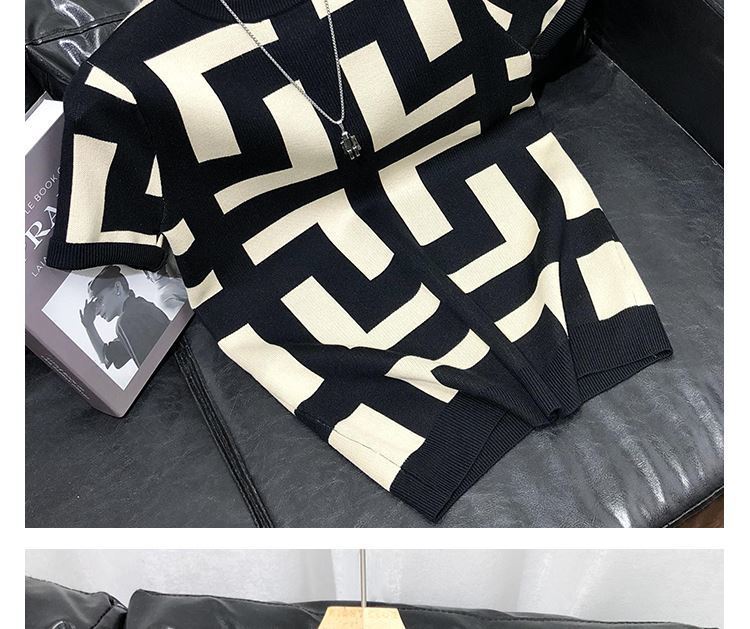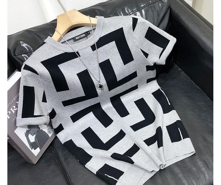 봄과 여름 아이스 실크 새로운 반팔 스웨터 남자 니트 반소매 기하학 자카드 스웨터 라운드 넥베이스 셔츠 슬림 핏스토어 가기