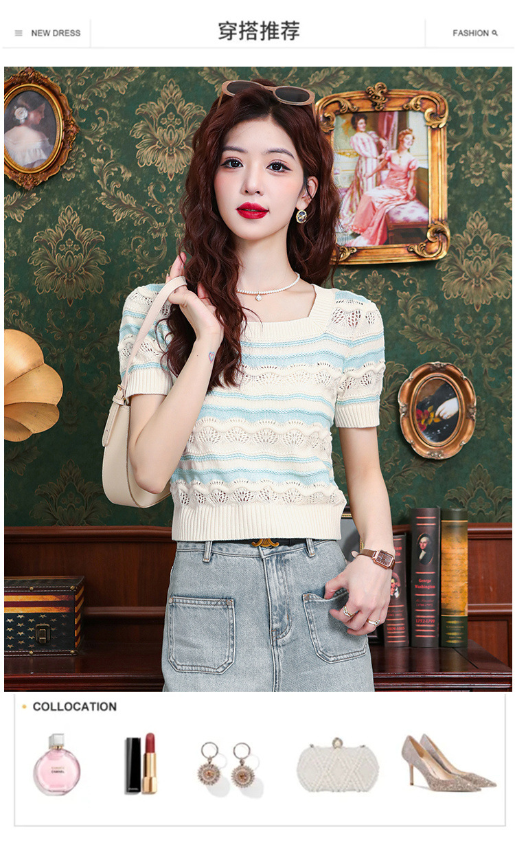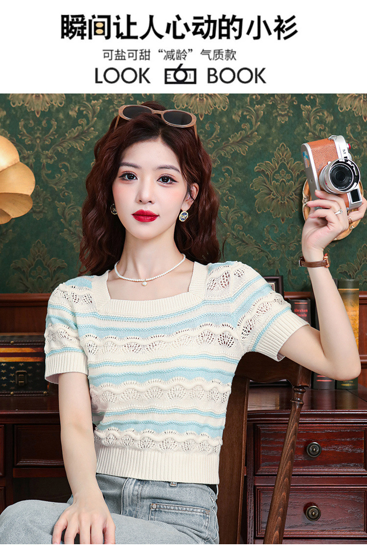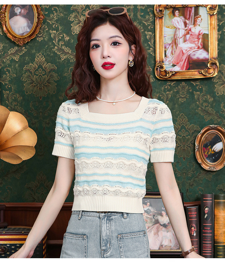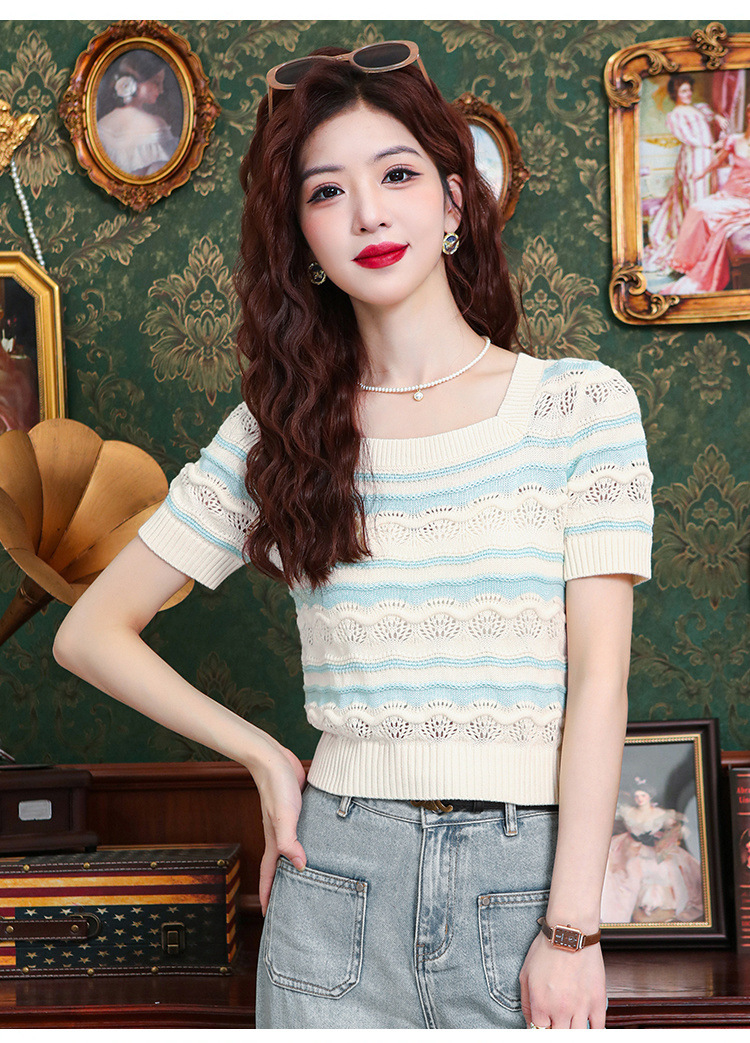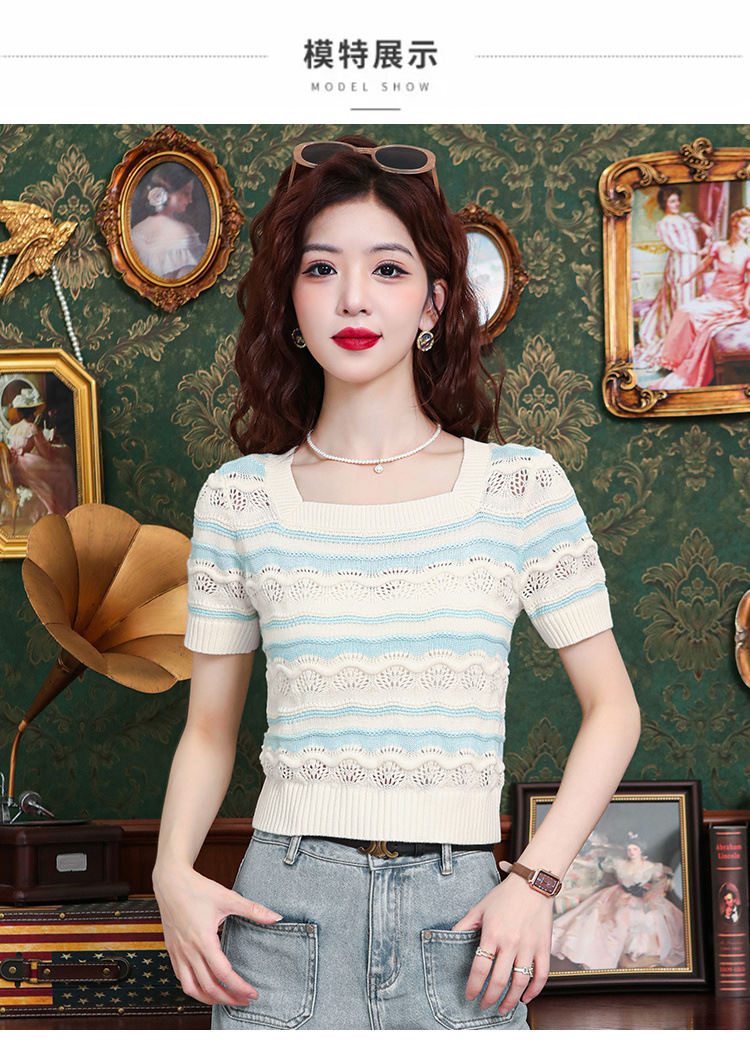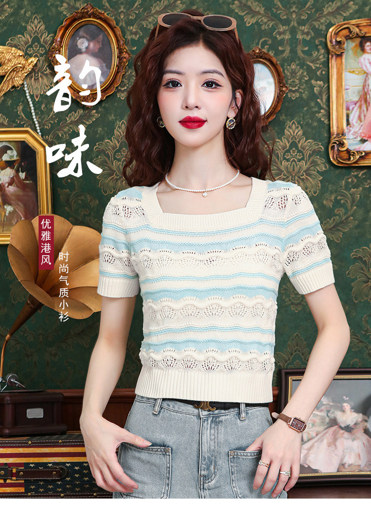 아이스 실크 반팔 티셔츠 여성의 2025 새로운 폭발 여름 줄무늬 니트 셔츠 패션 웨스턴 스타일 쇼트 탑 여름스토어 가기
