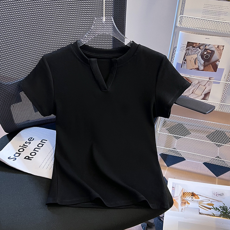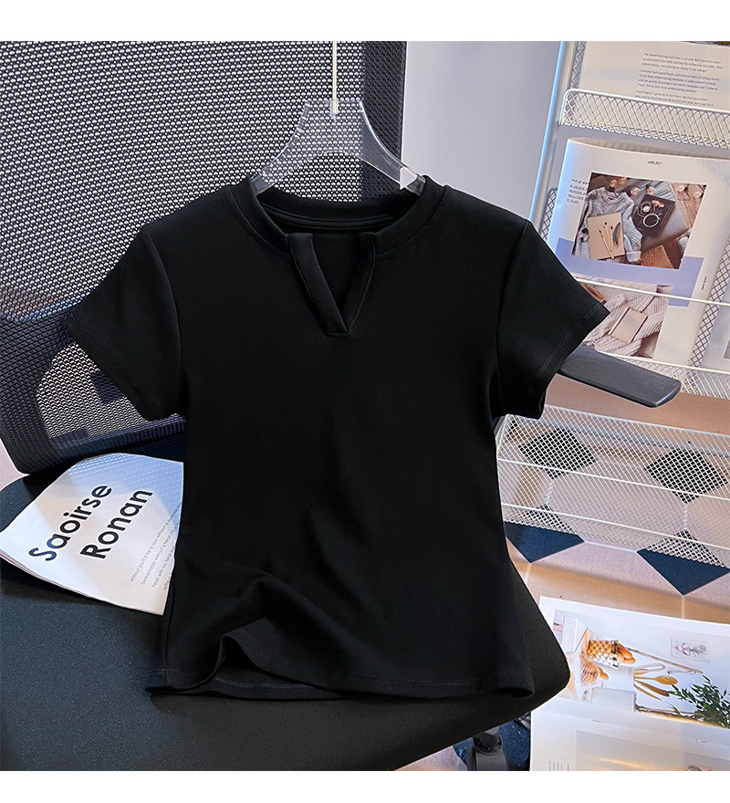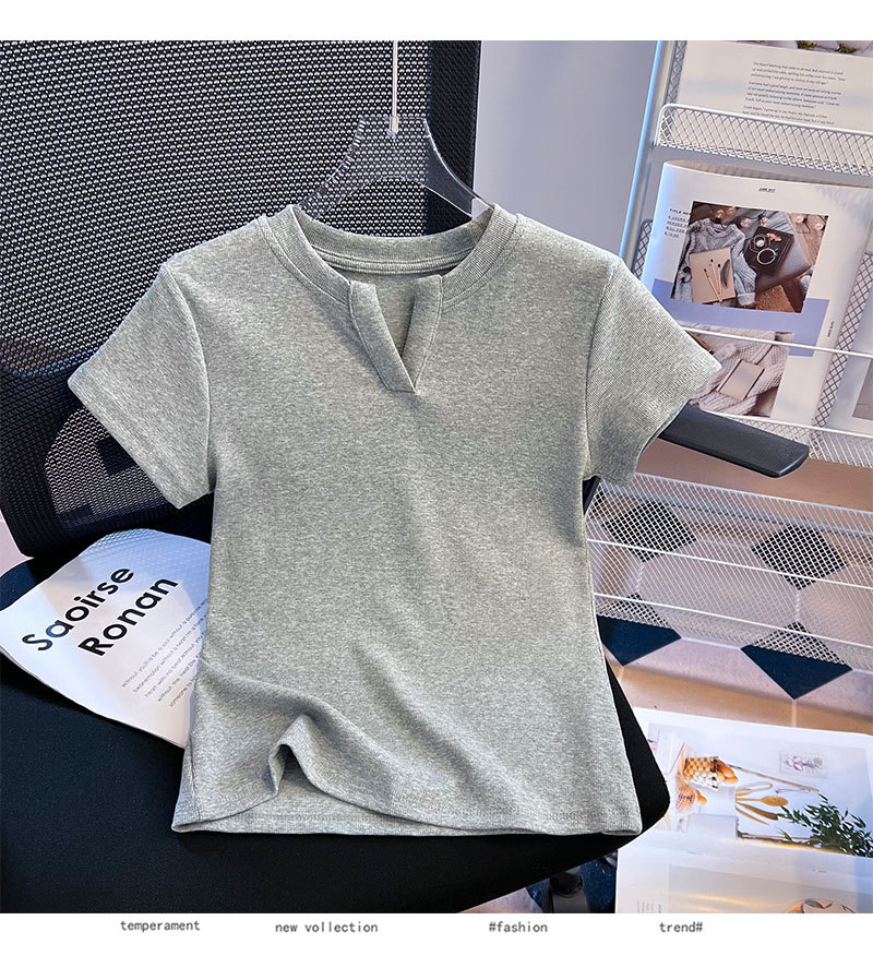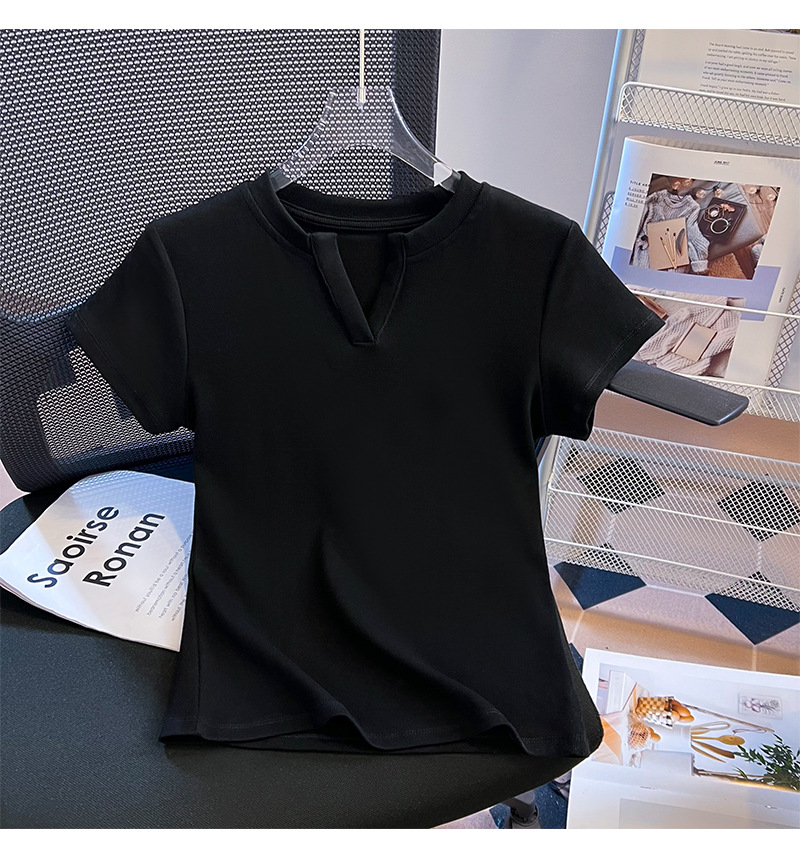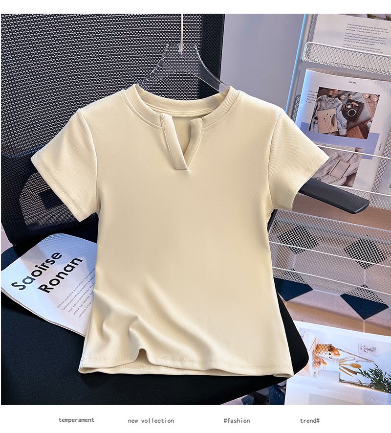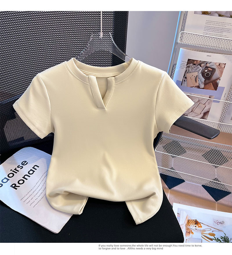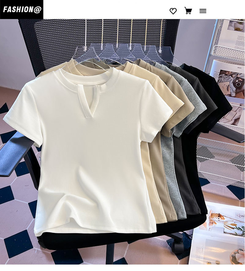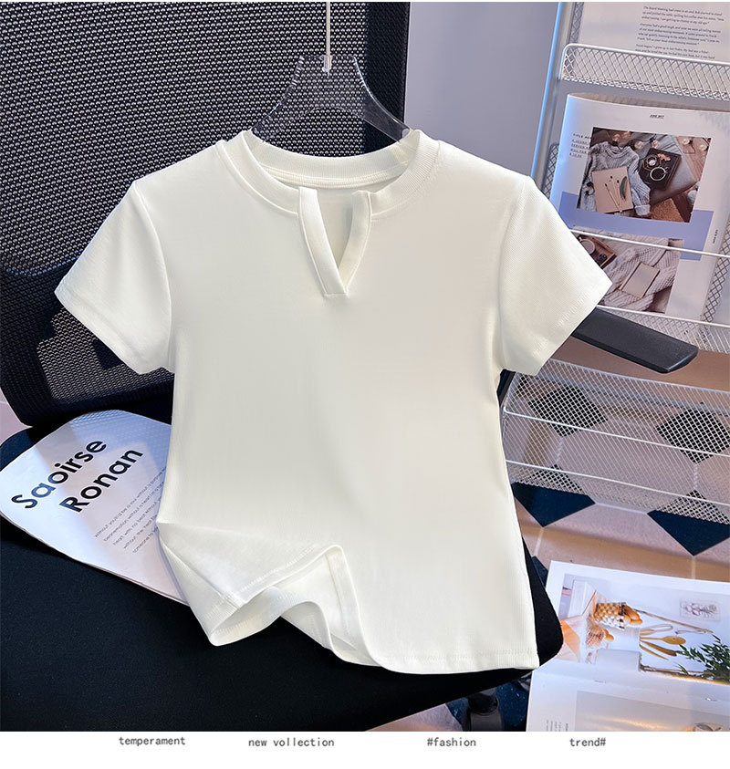화이트 V 넥 짧은 소매 여성 티셔츠 새로운 봄과 여름 한국 디자인 감각 슬림 슬림 슬림 슬림 숄더 짧은 재킷 도매스토어 가기