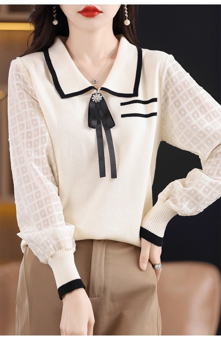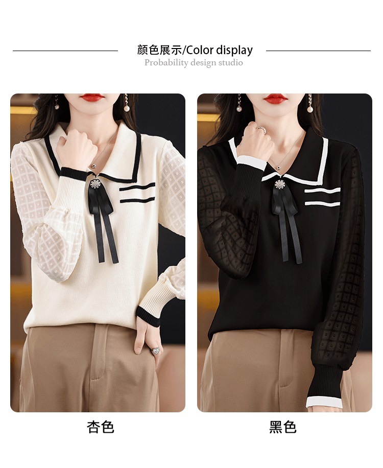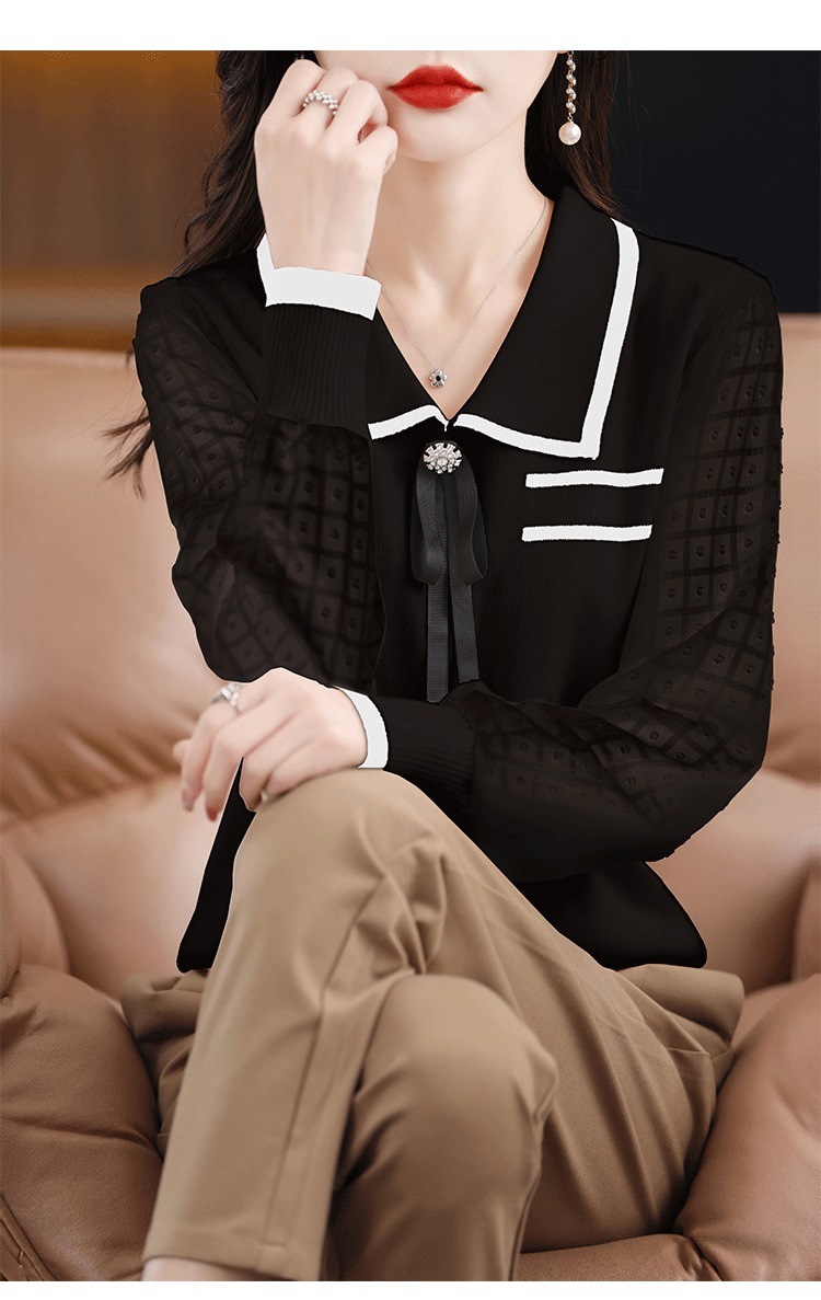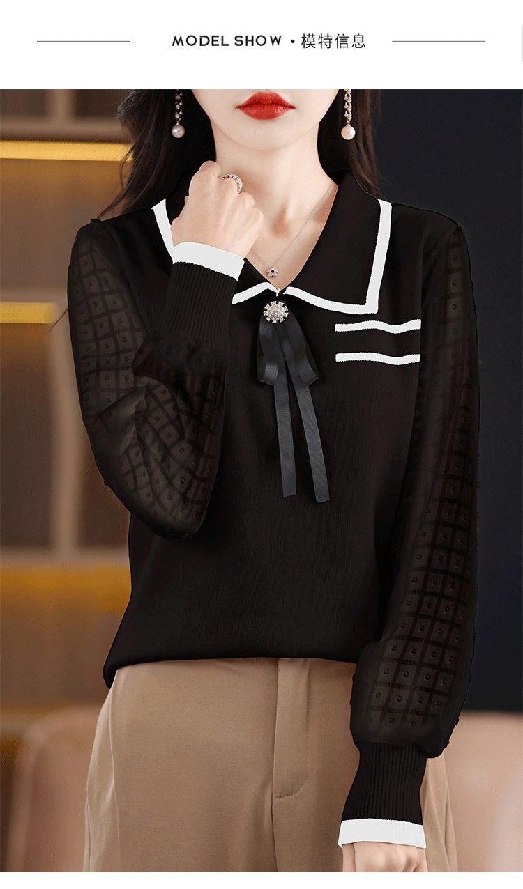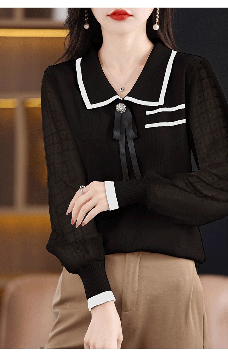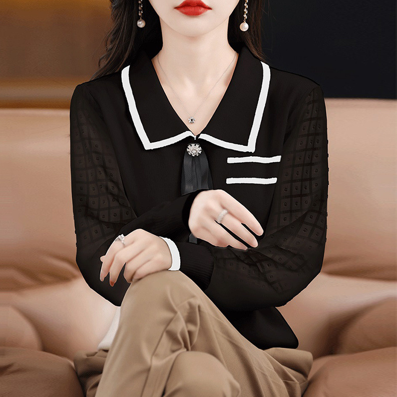 인형 칼라 쉬폰 탑 여성의 봄과 가을 뉴 에이지 감소 느슨한 긴팔 웨스턴 스타일 셔츠 얇은 아이스 실크 니트 셔츠