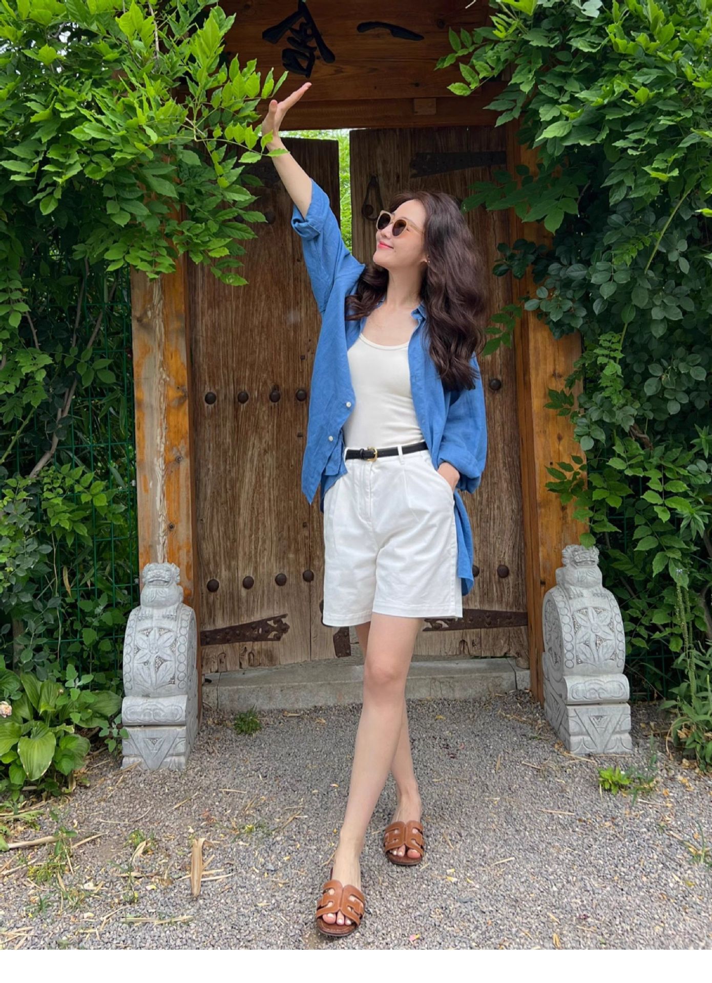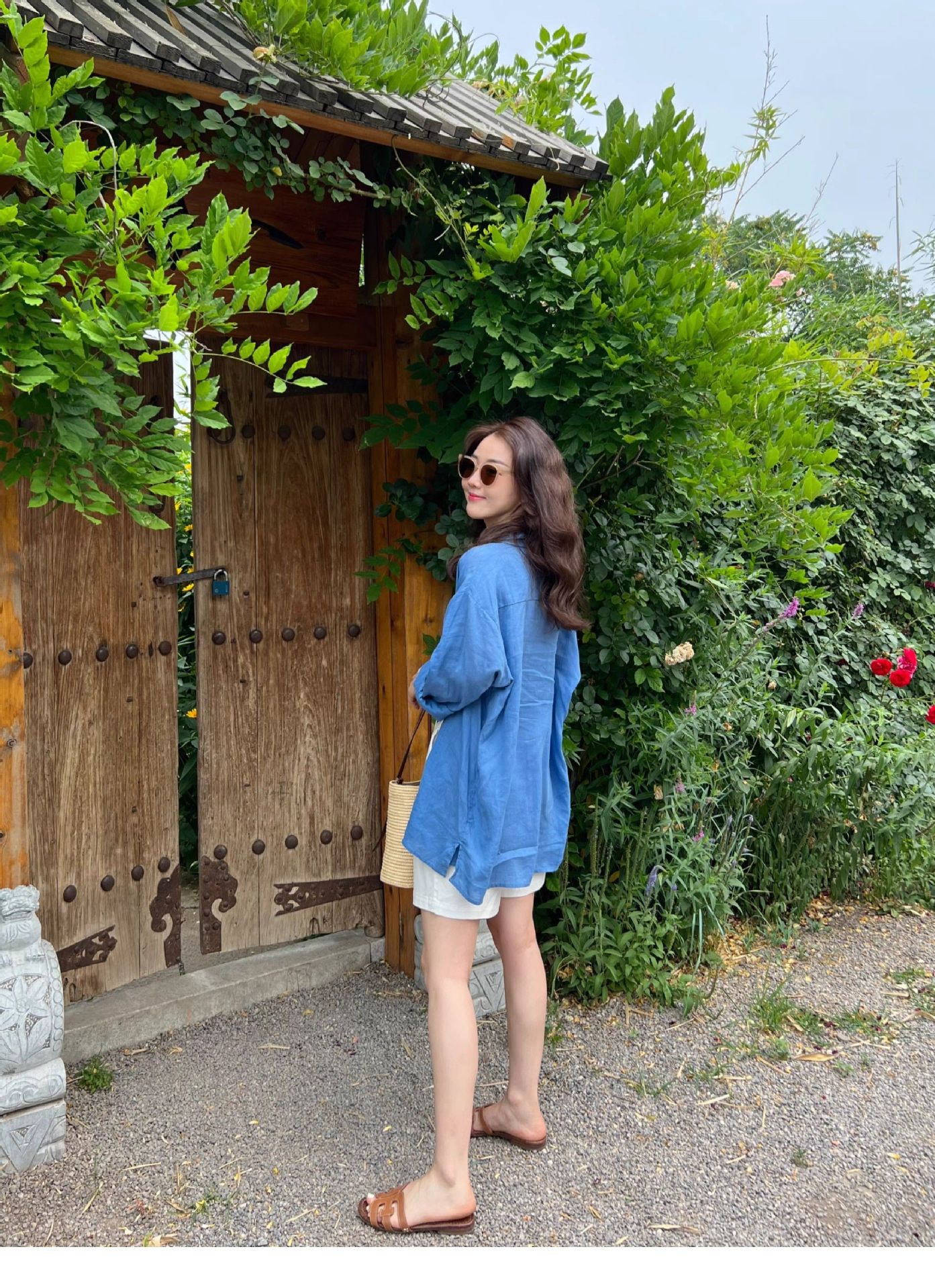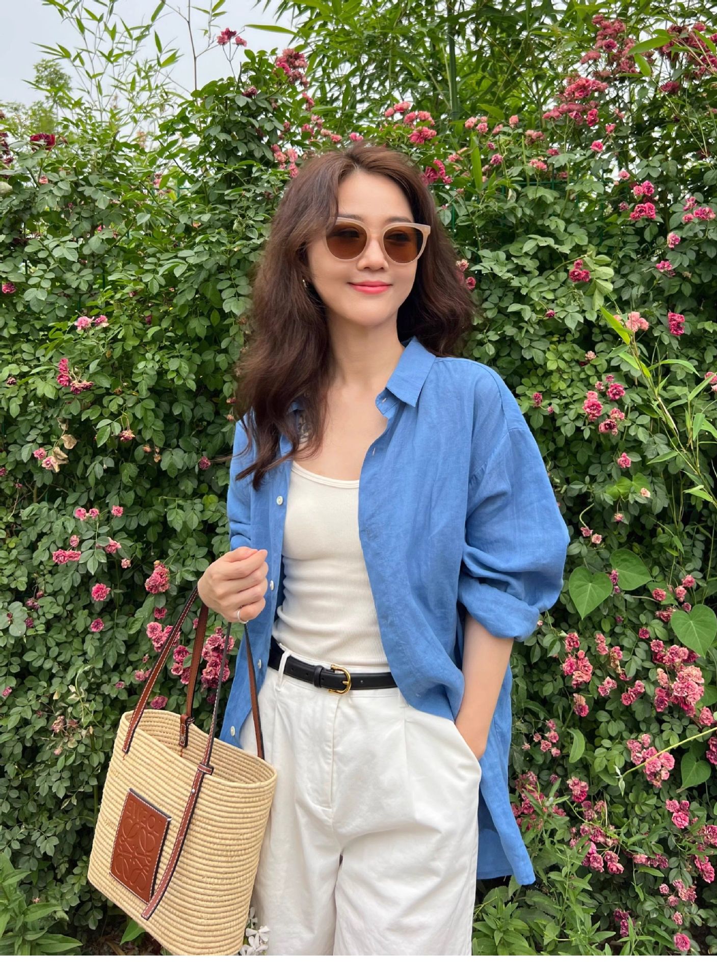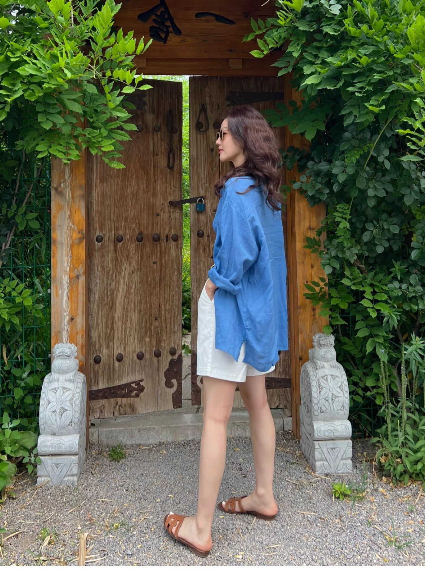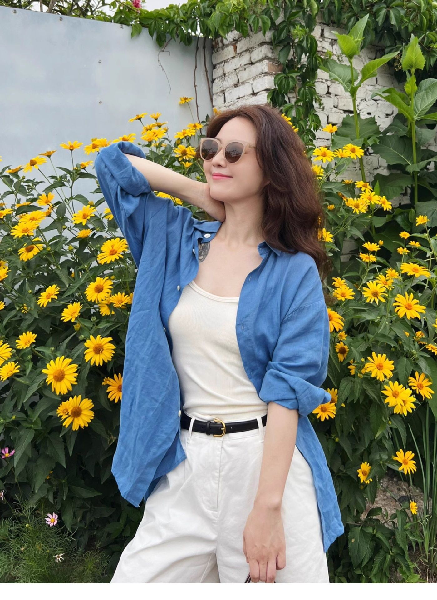 高级感亚麻防晒长袖衬衫松弛感百搭开衫外套薄款宽松棉麻蓝色衬衣