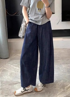 今年流行深蓝色亚麻阔腿牛仔裤女夏季薄款宽松显瘦松弛感直筒裤子