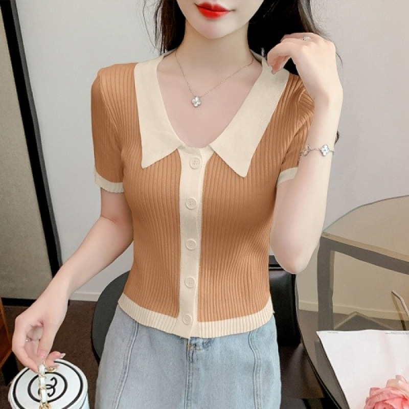 폴로 칼라 하프 슬리브 아이스 실크 스웨터 여성 여름 2025 년 새로운 짧은 소매베이스 카디건 슬림 반소매 티셔츠 탑