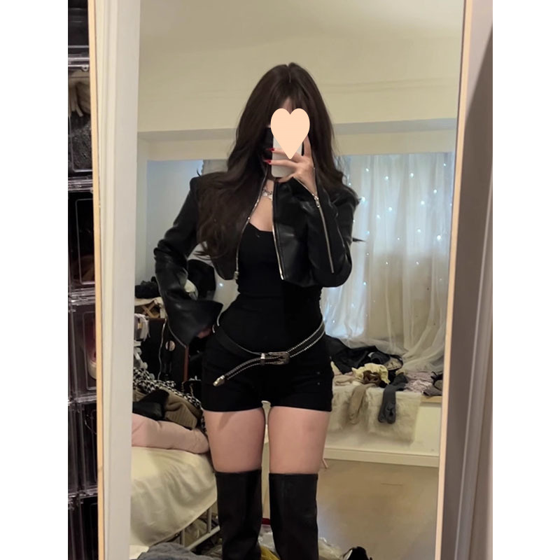 순수한 욕망 스타일 세트 여성의 2025 가을 뜨거운 소녀 짧은 가죽 자켓 타이트 허리 슬리밍 점프 슈트 반바지스토어 가기