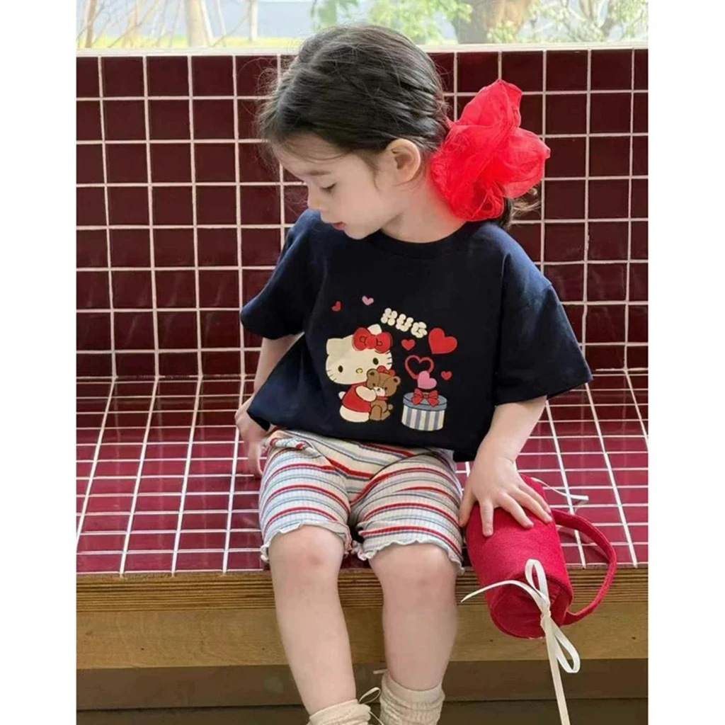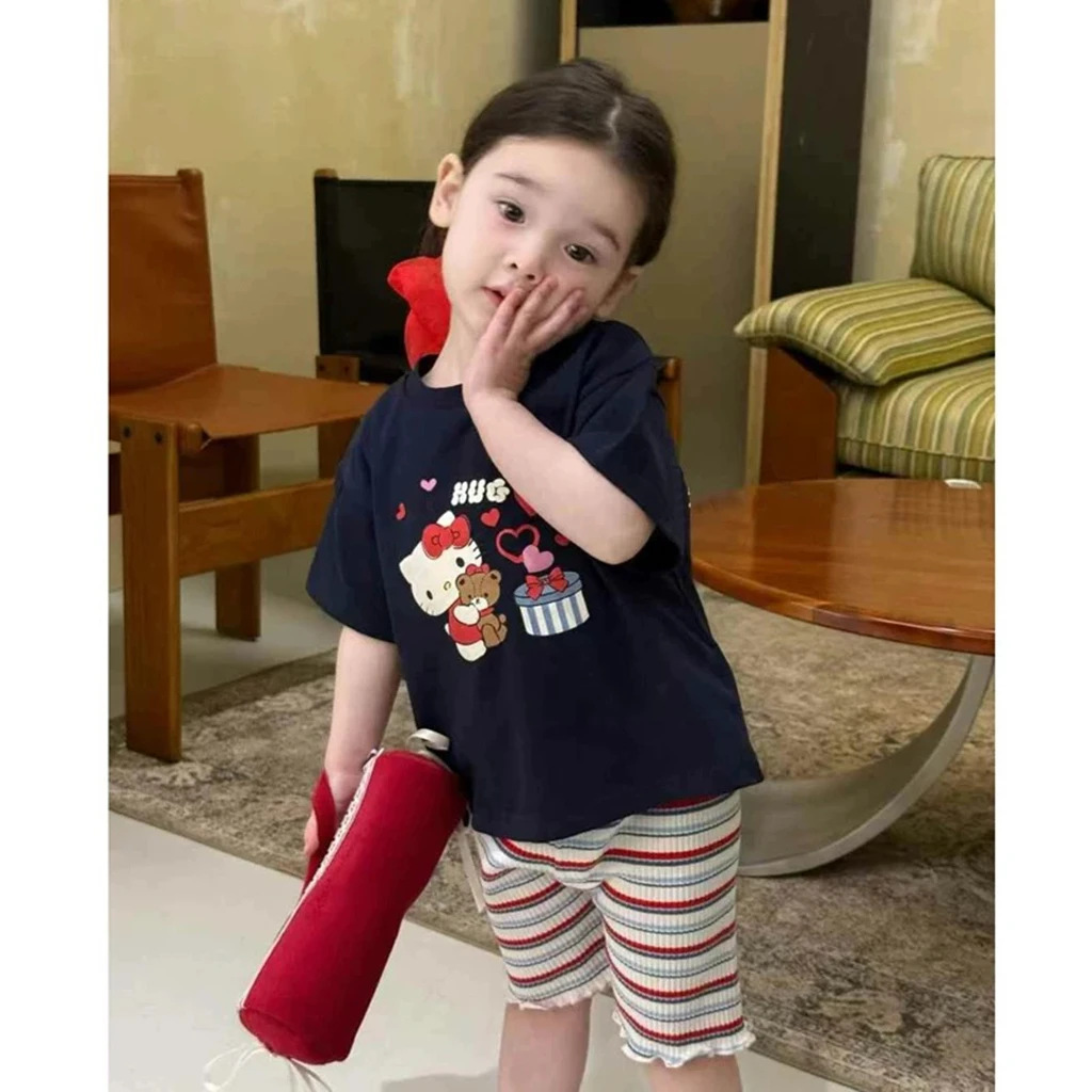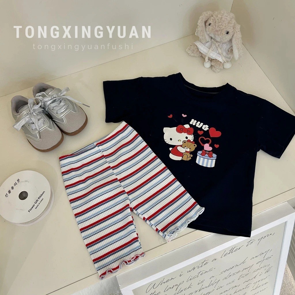 [어린이 스타서클] 2025 여자 여름 통기성 반팔 반바지 KT 고양이 반팔 줄무늬 바지 투피스 세트 T