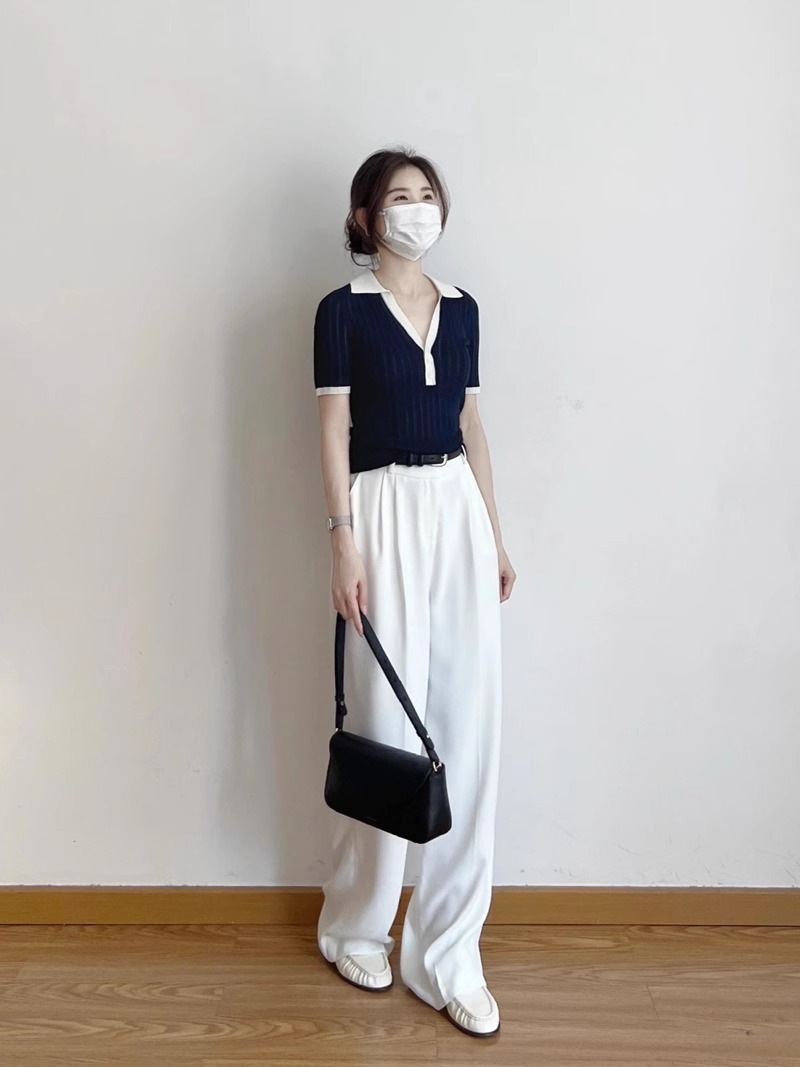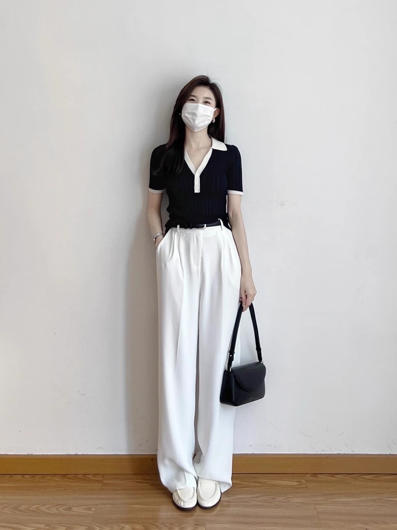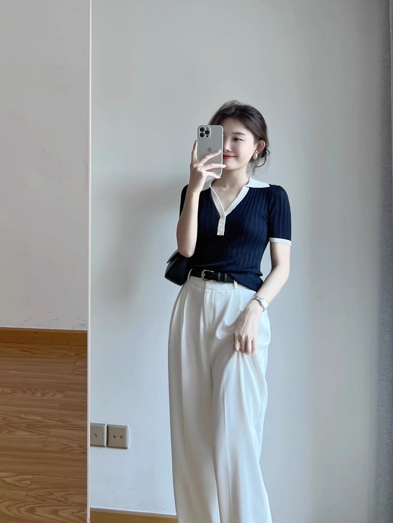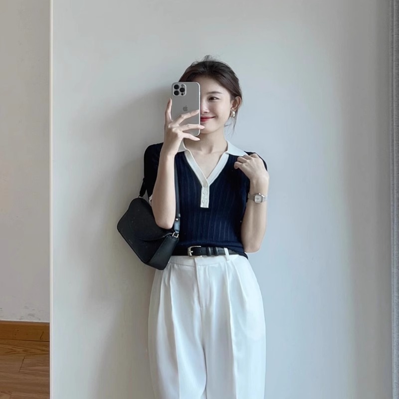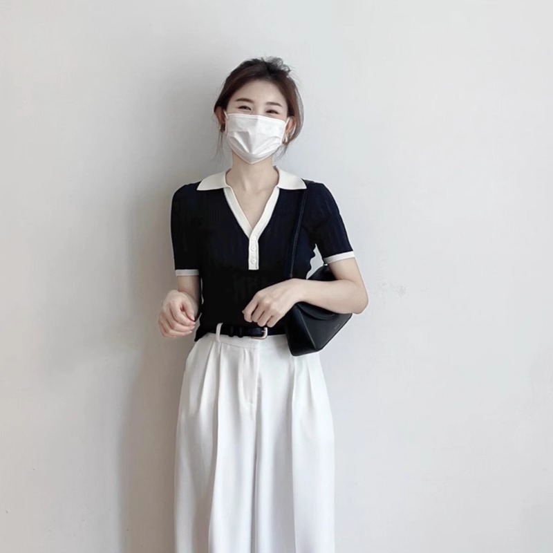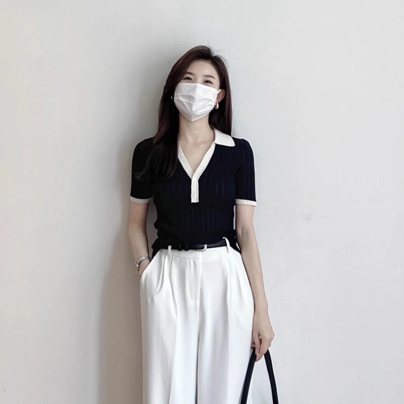 아이스 실크 폴로 셔츠 니트 반팔 티셔츠 여성 여름 2025 새로운 슬림 핏 프랑스 달콤한 매운 어깨 틈새 탑스토어 가기