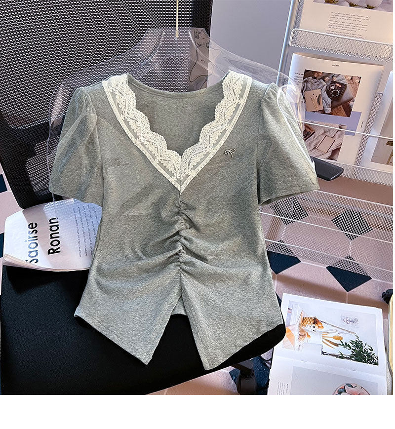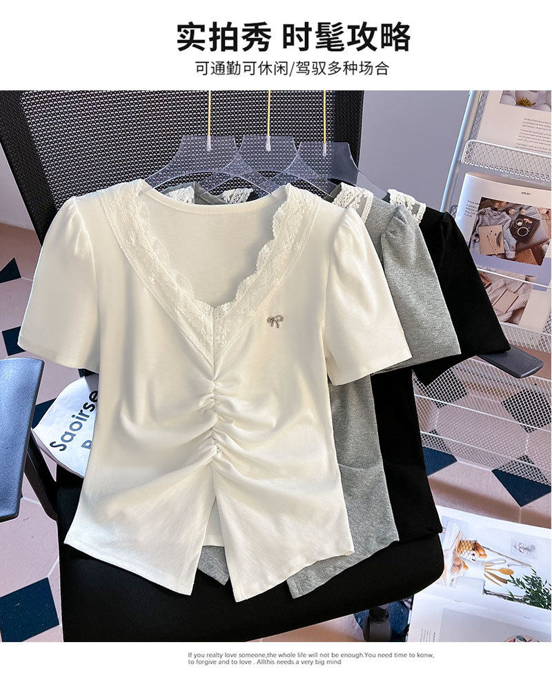 여름 새로운 디자인 조커 간단한 레이스 스티칭 느슨한 V 넥 티셔츠 여성용 주름 바지 셔츠 재킷 도매스토어 가기