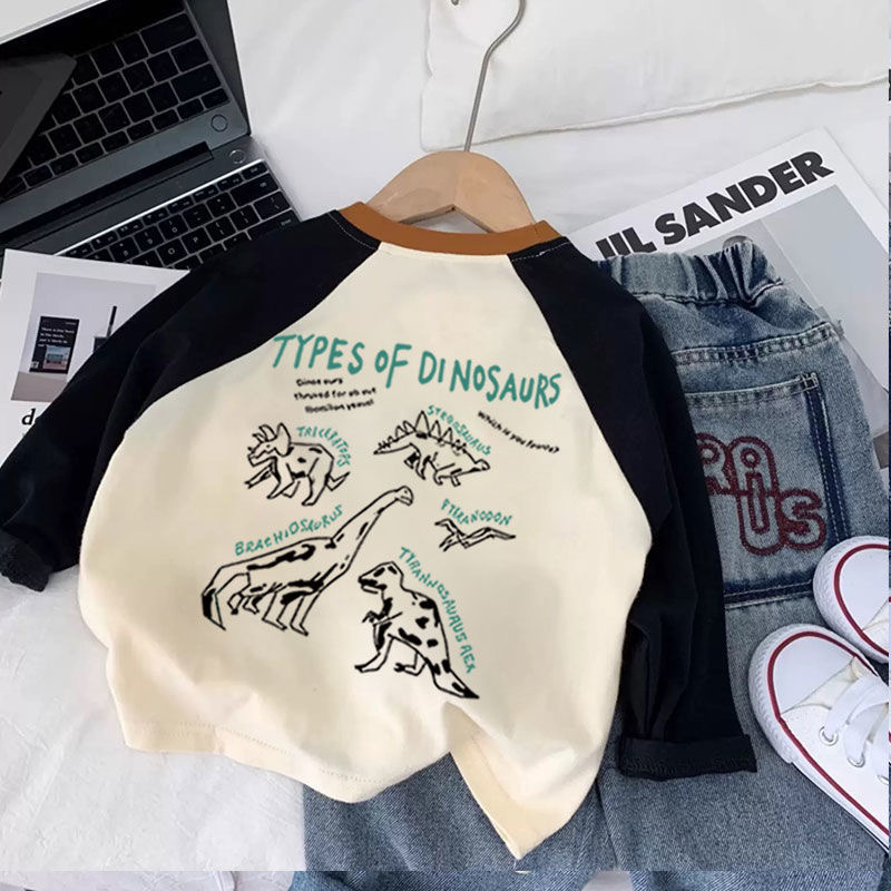 봄과 가을 새로운 어린이 면화 긴팔 티셔츠 라글란 소매 한국식 트렌디 T 카드 라운드 넥 컬러 블록베이스 셔츠스토어 가기