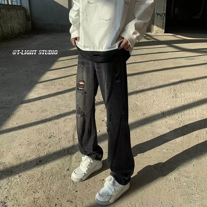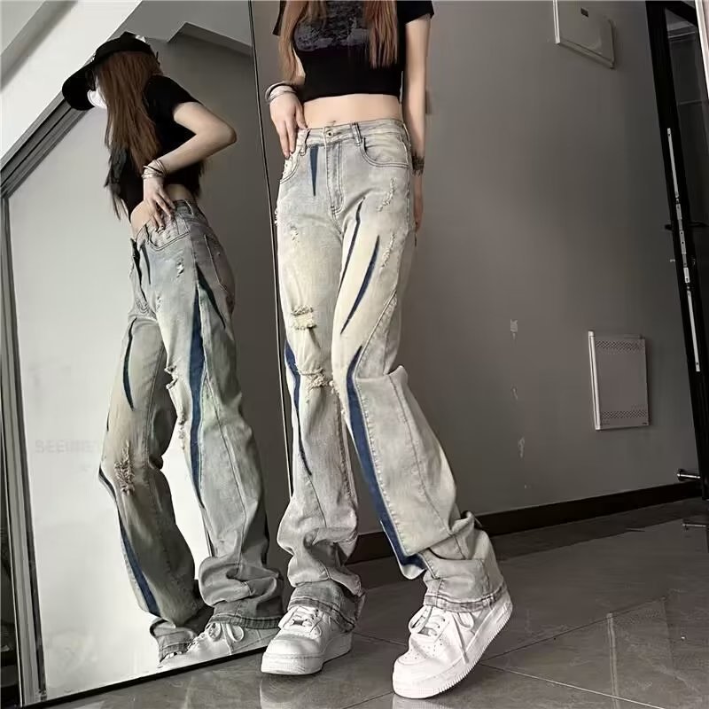미국식 하이 스트리트 옐로우 머드 스크래치 레트로 스트레이트 청바지 남성과 여성의 봄과 가을 느슨한 세척 슬림 와이드 다리 바지스토어 가기