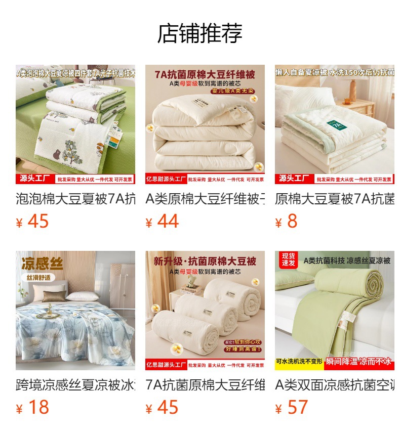 南通亿思甜家纺有限公司是床上用品等产品专业生产加工的公司,拥有完整、科学的质量管理体系。南通亿思甜家纺有限公司的诚信、实力和产品质量获得业界的认可。我们可以对接各大平台代发,同时也服务实体店,微商,流动商家客户。我们的服务宗旨:客户第一,质量第一。我们的服务理念:没有100分的产品绝对有100分的售后和服务。您给我们一次信任,我们还您N次真诚!欢迎各界朋友莅临参观、指导和业务洽谈!
