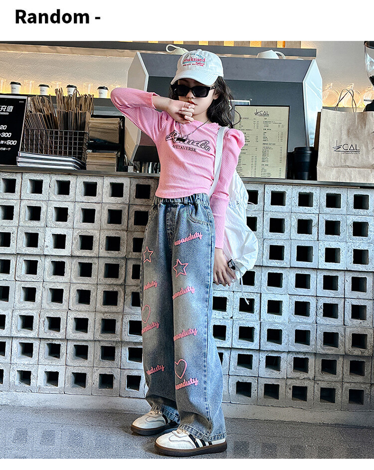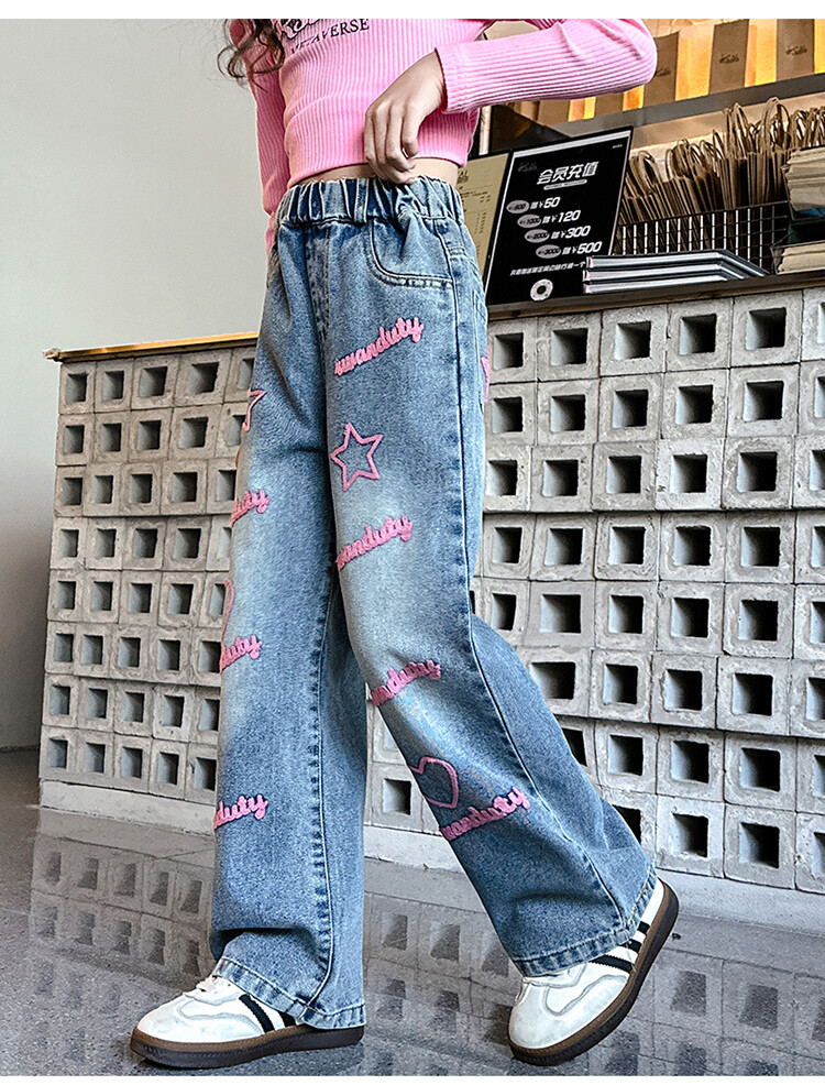 여아 청바지 봄 가을 신작 2025 중대형 아동 스트레이트 팬츠 신작 인터넷 연예인 여아 수건 자수 와이드 팬츠