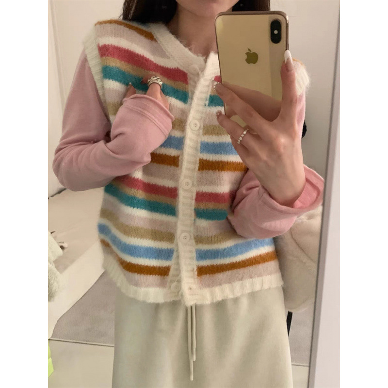 무지개 줄무늬 니트 카디건 조끼 여성 봄 스택 작은 어깨 조끼 2025 새로운 봄 의류스토어 가기