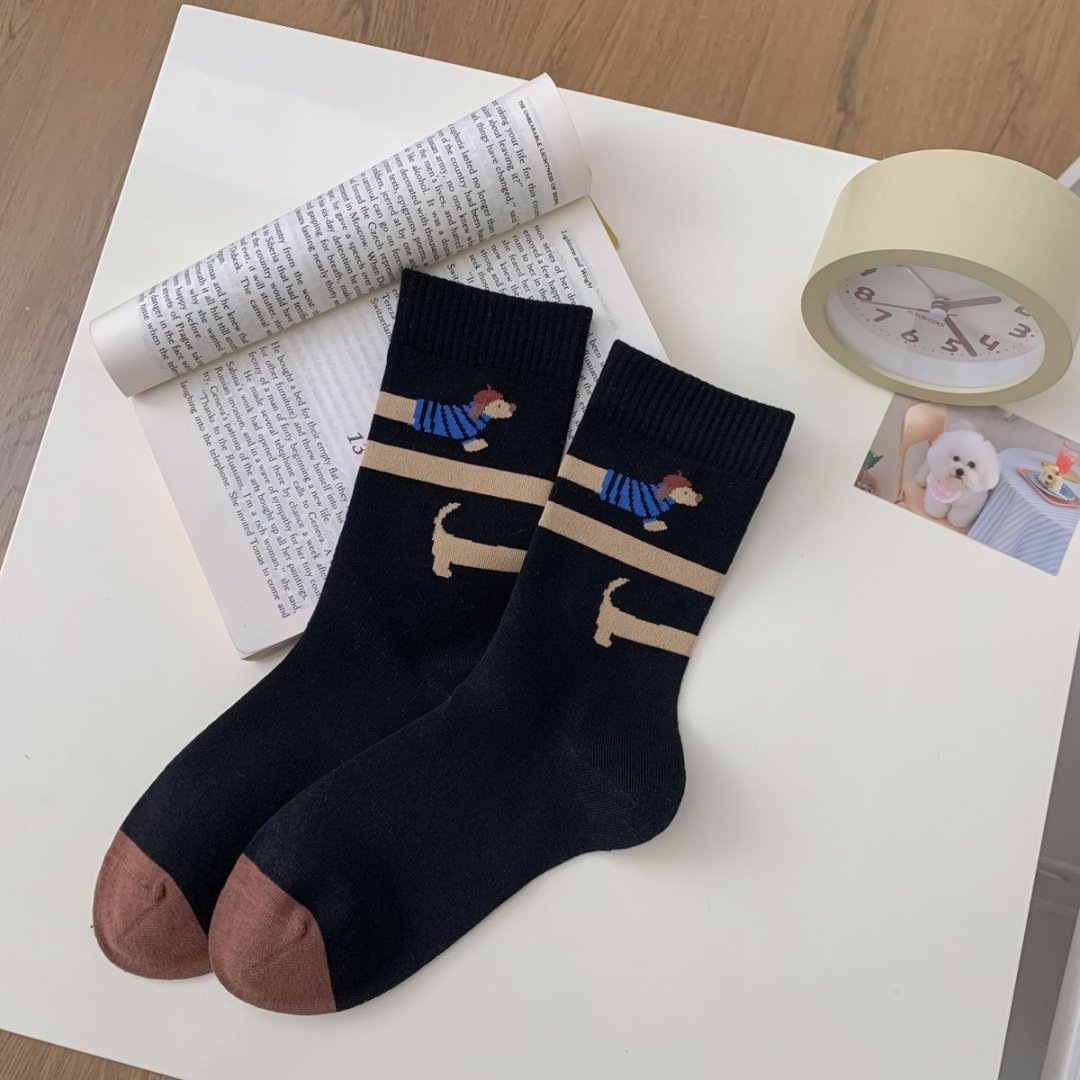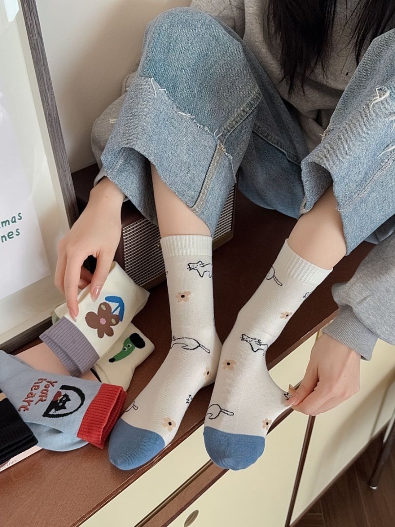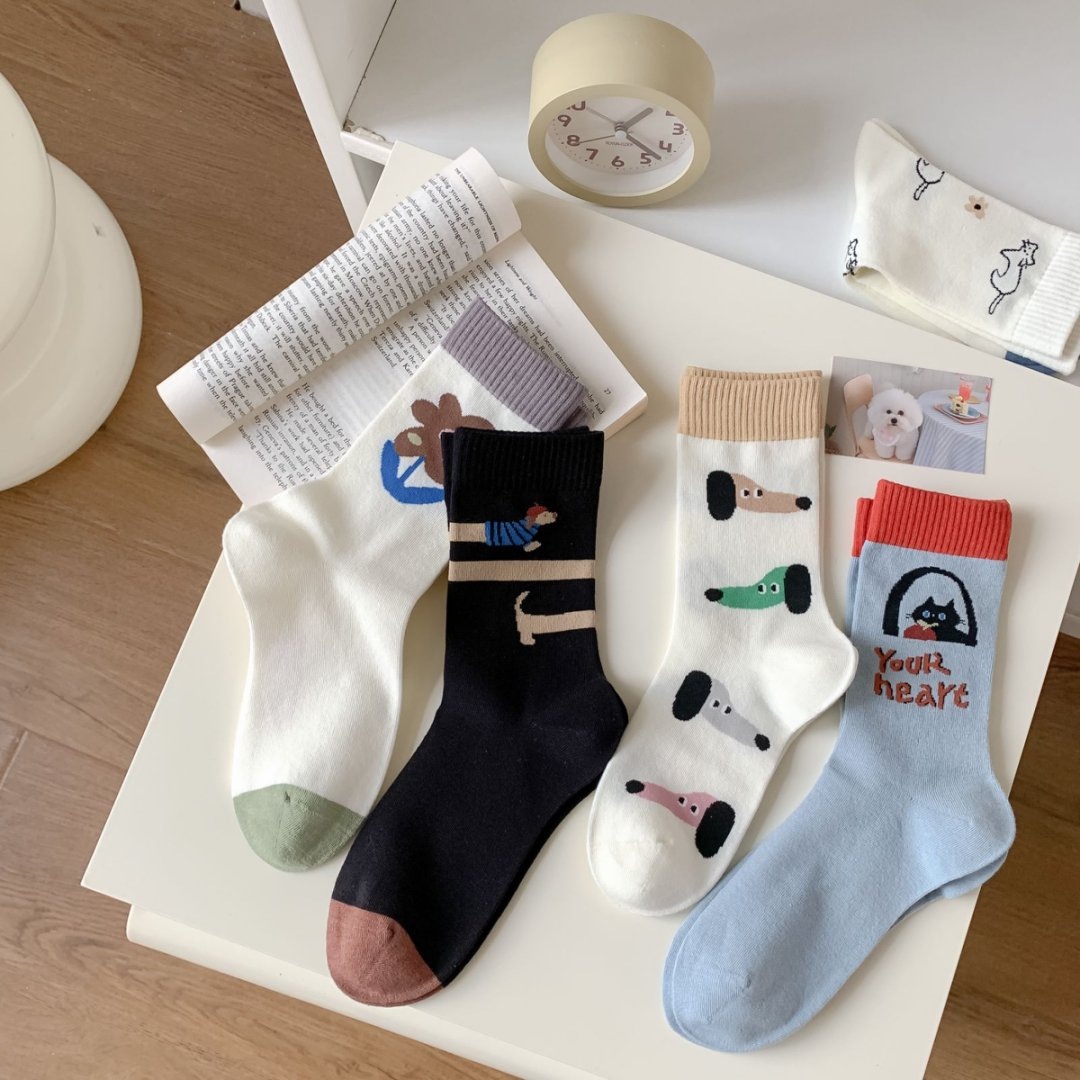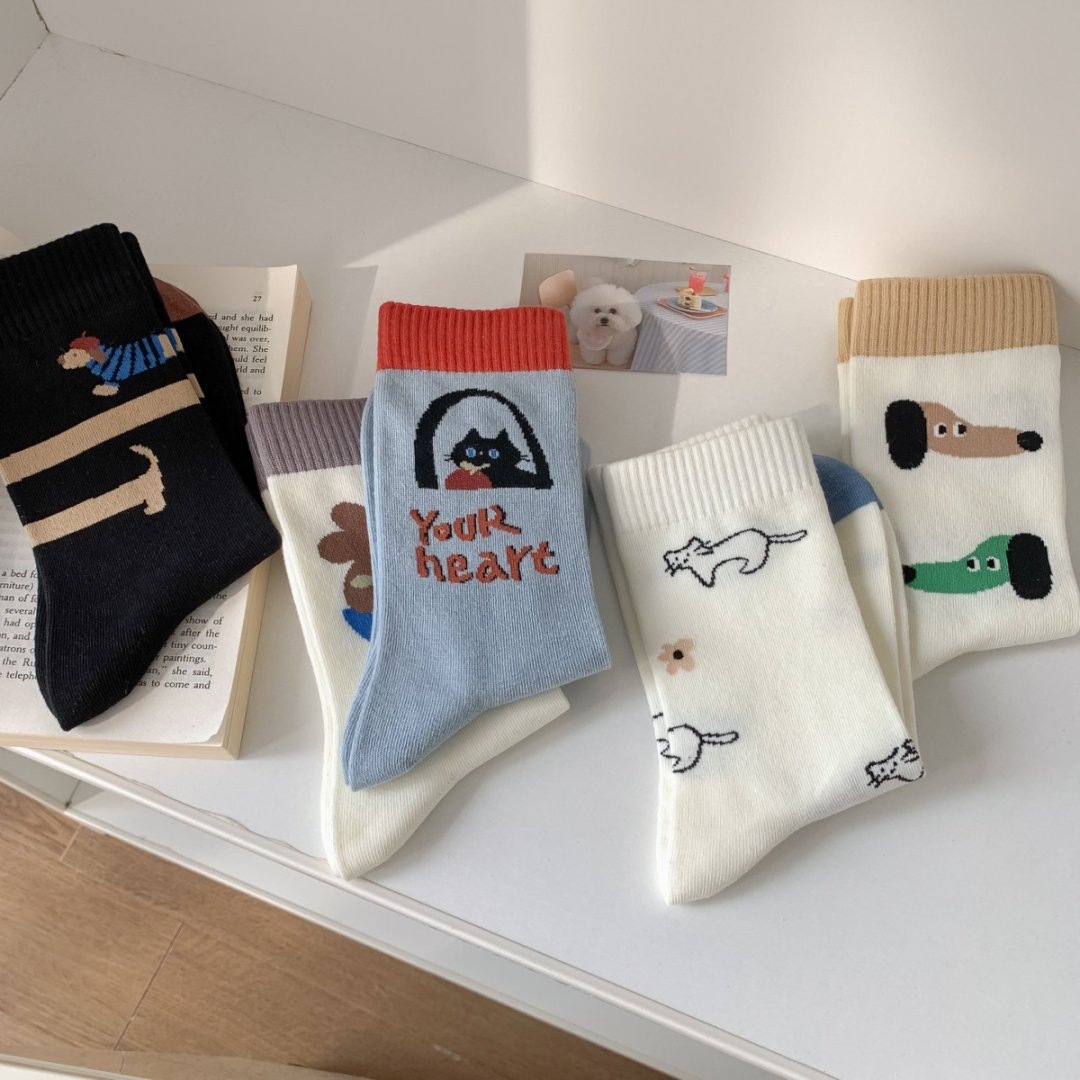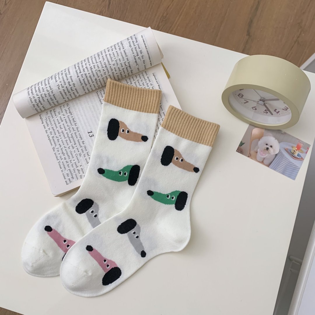 순면 양말 여성 2025 봄과 여름 새로운 만화 강아지 쌓기 양말 한국 스타일 긴 배럴 뼈 양말 여성의 얇은 여름스토어 가기