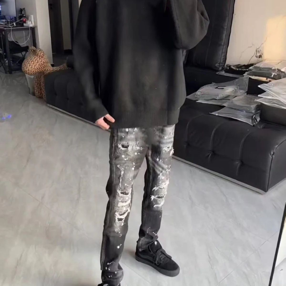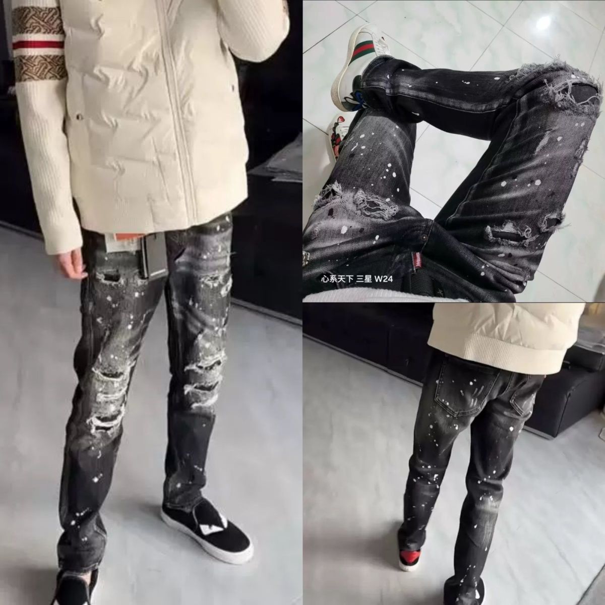 남성용 새로운 라이트 럭셔리 데님 바지 D2 슬림 캐주얼 마이크로 탄성 블랙 그레이 풀 스트립 찢어진 패치 스플래시 잉크 트렌드 9856스토어 가기