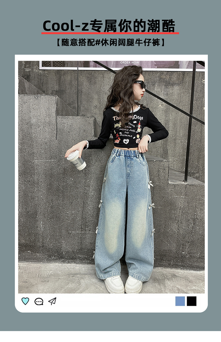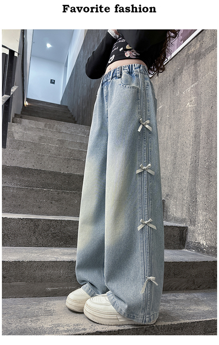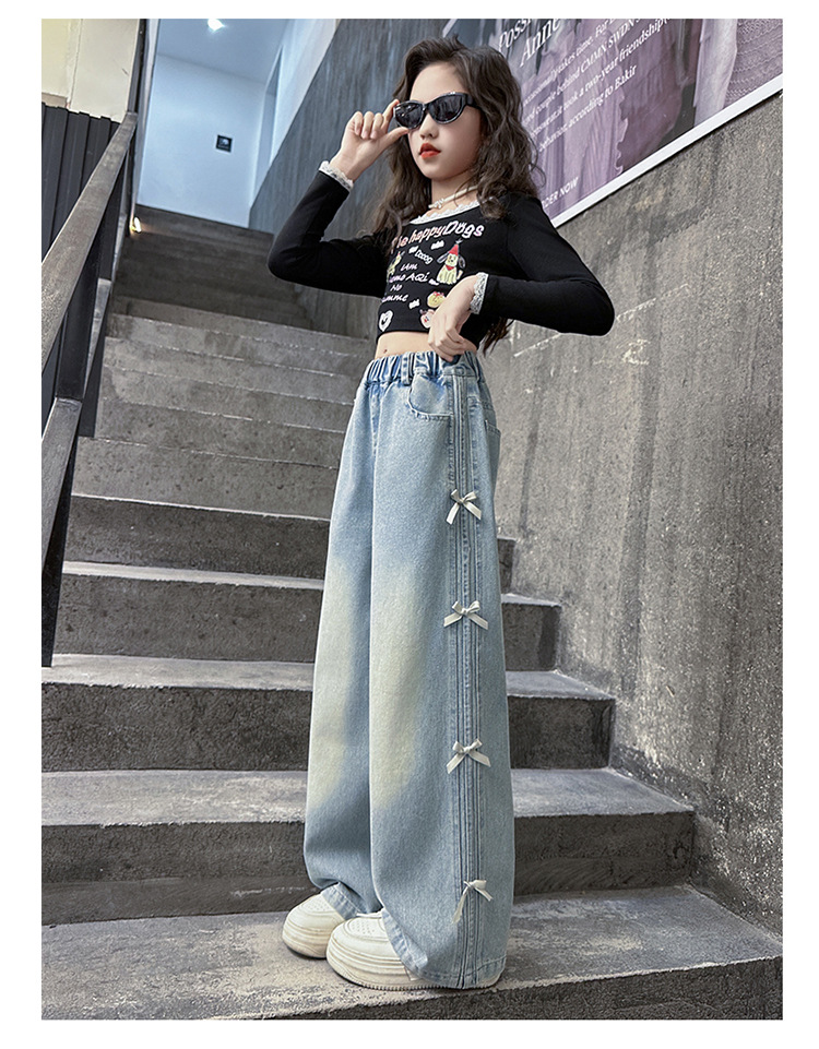 소녀의 봄과 가을 새로운 청바지 어린이 한국식 활 넓은 다리 바지 여성 큰 어린이 바깥 옷 봄 바지스토어 가기